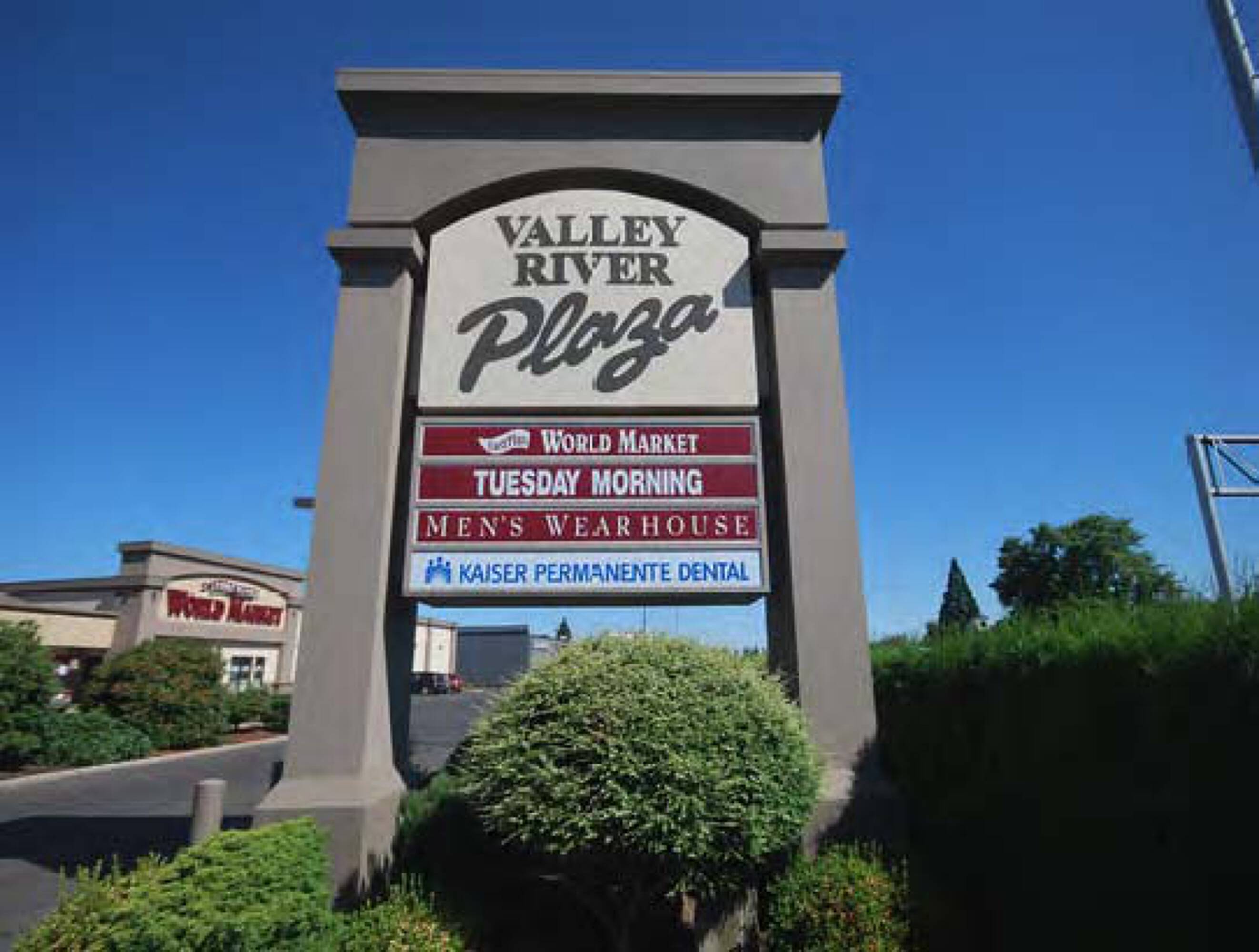 Valley River Plaza offers a location with freeway visibility and access. Situated next to Valley River Center, a super-regional mall serving Eugene and Springfield, the plaza is located along Delta Highway, approximately one mile west of Interstate 5. Current tenants of Valley River Plaza include Cost Plus World Market, Men's WearHouse, and Kaiser Permanente Dental. The Valley River Center Mall attracts approximately 7,665,000 annual visitors, averaging 21,000 daily, and features tenants such as Macy's, Regal Cinemas, JC Penny, H & M, Texas Roadhouse, and BJ's Restaurant & Brewery. The surrounding area includes Valley River Inn, Starbucks, Red Lobster, The Good Feet Store, Olive Garden, Barnes and Noble, and Petco. This location is suitable for retail and office uses.