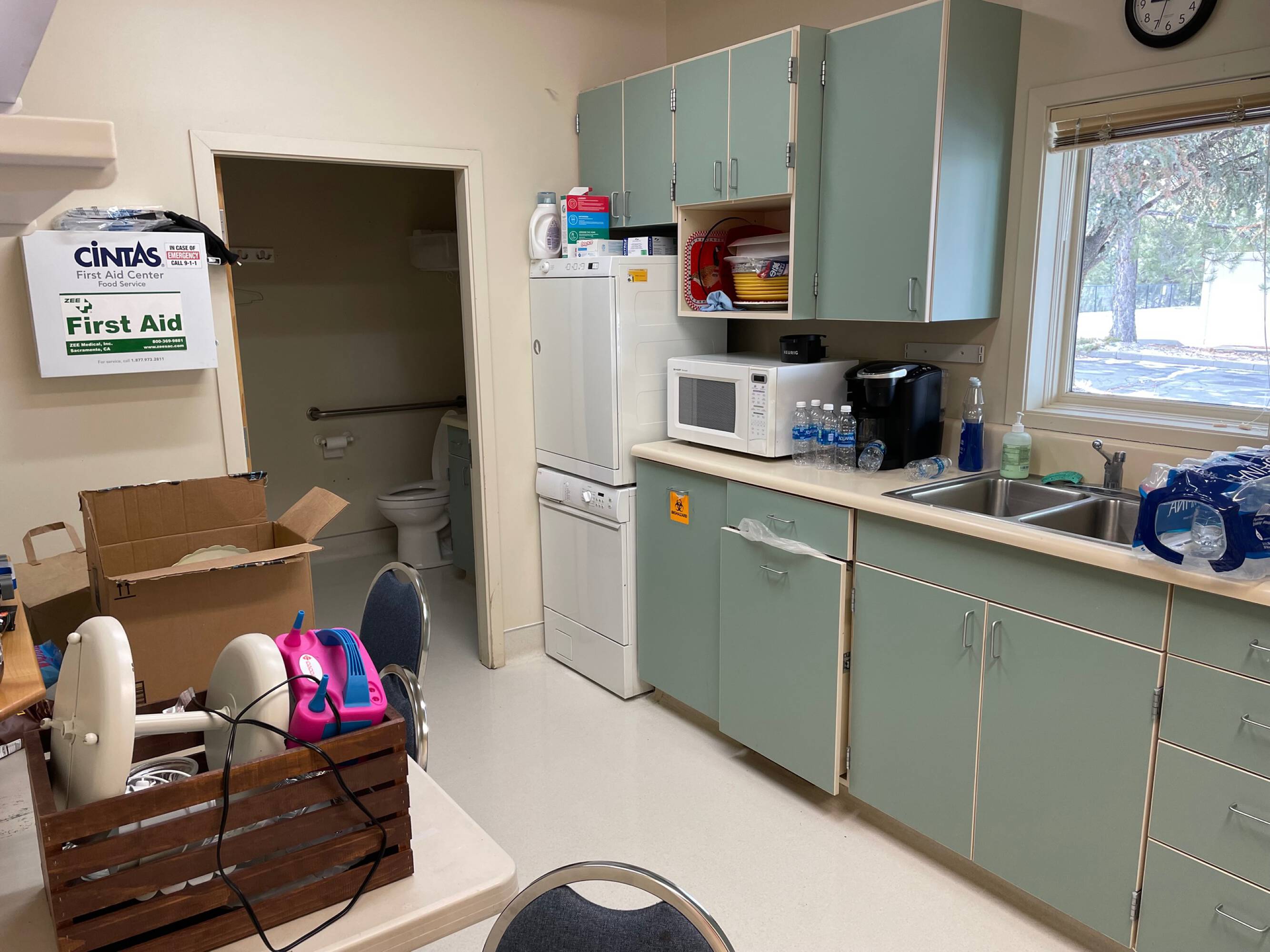 Medical office building with exam rooms and basement storage.
