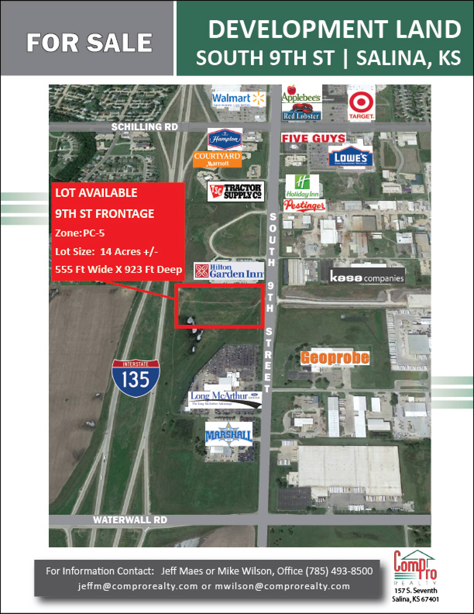 Commercial land is available on South 9th Street. The property is approximately 8 acres, featuring 375 feet of frontage along 9th Street and a depth of 930 feet. Neighboring businesses include Long McArthur Ford, Marshall Motors, GeoProbe, KASA Industries, Hilton Garden Inn, Holiday Inn, Lowe's, Courtyard by Marriott, Hampton Inn, Wal-Mart, Target, and Sam's Club.