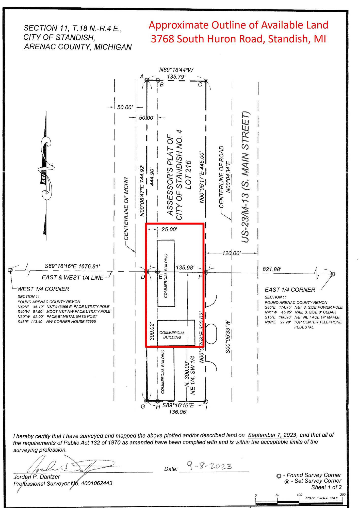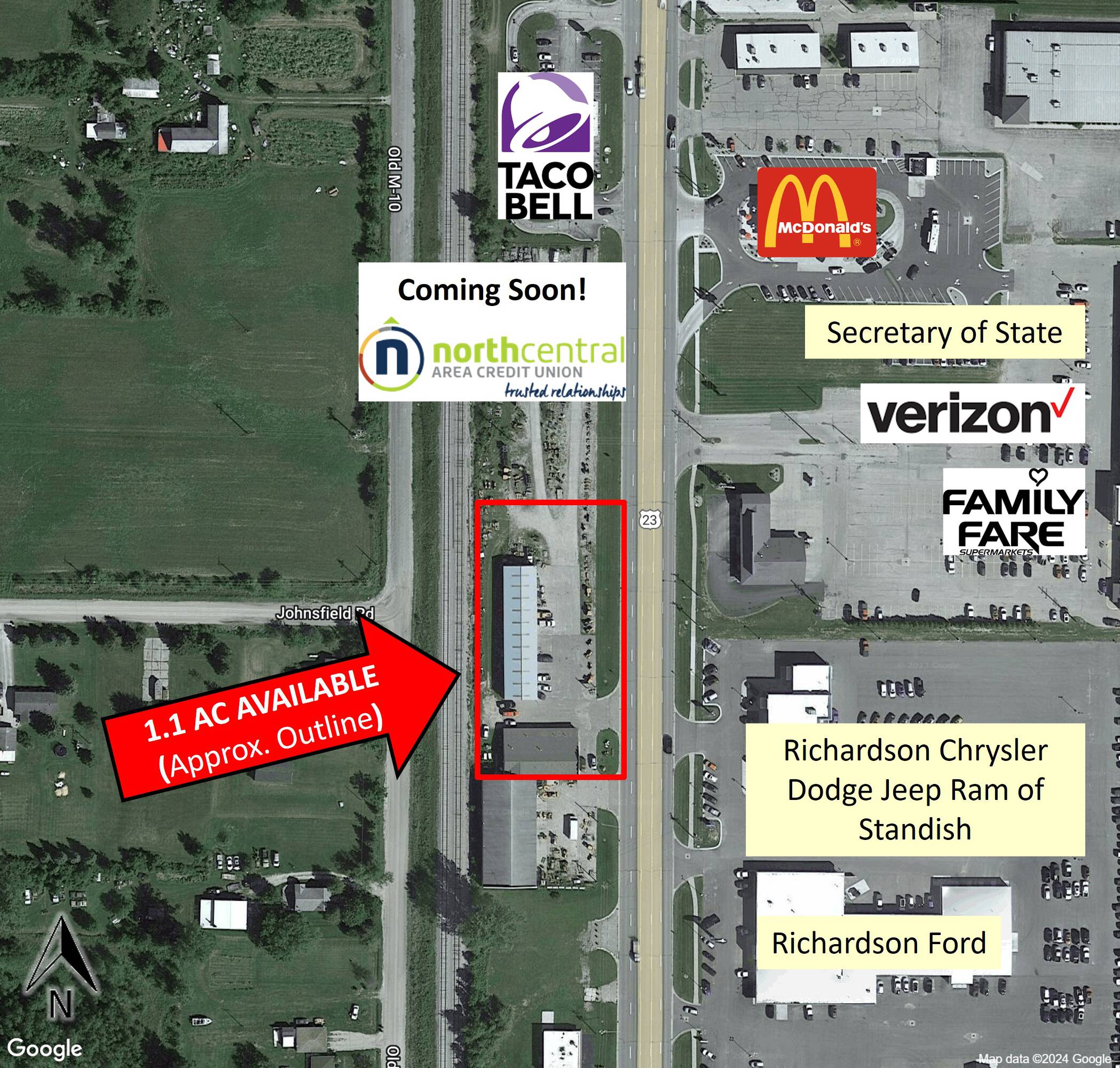 This 1.1 AC of land is located on South Huron Road (US-23), the main thoroughfare in Standish, Michigan, making it suitable for commercial development. The property is situated less than 5 minutes from I-75 and within walking distance of downtown Standish. The location experiences traffic of over 20,000 vehicles per day. A North Central Area Credit Union is planned for the adjacent property to the north, which is expected to increase traffic in the area.