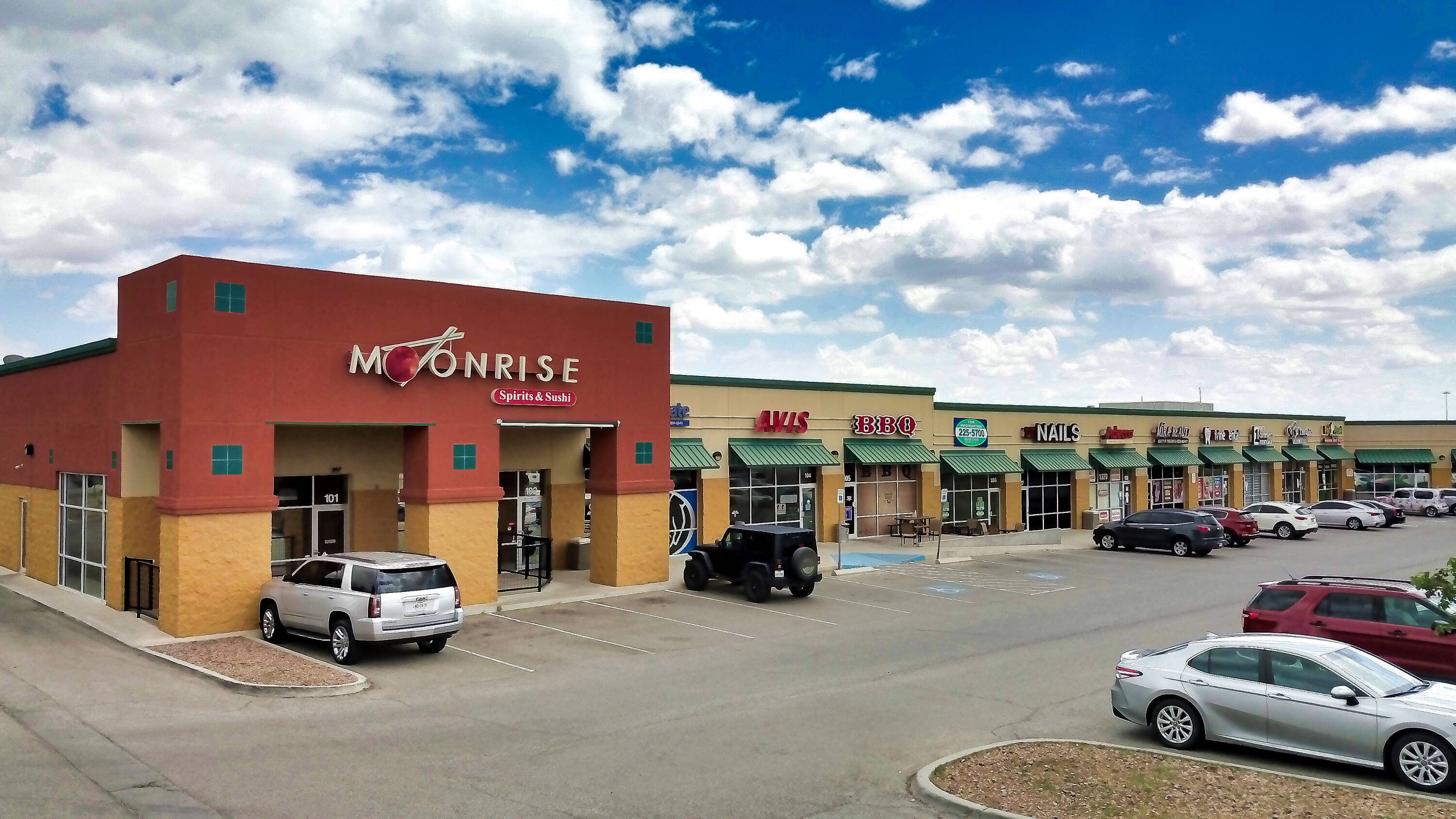 Shopping center space available off I-10 with high traffic volume.