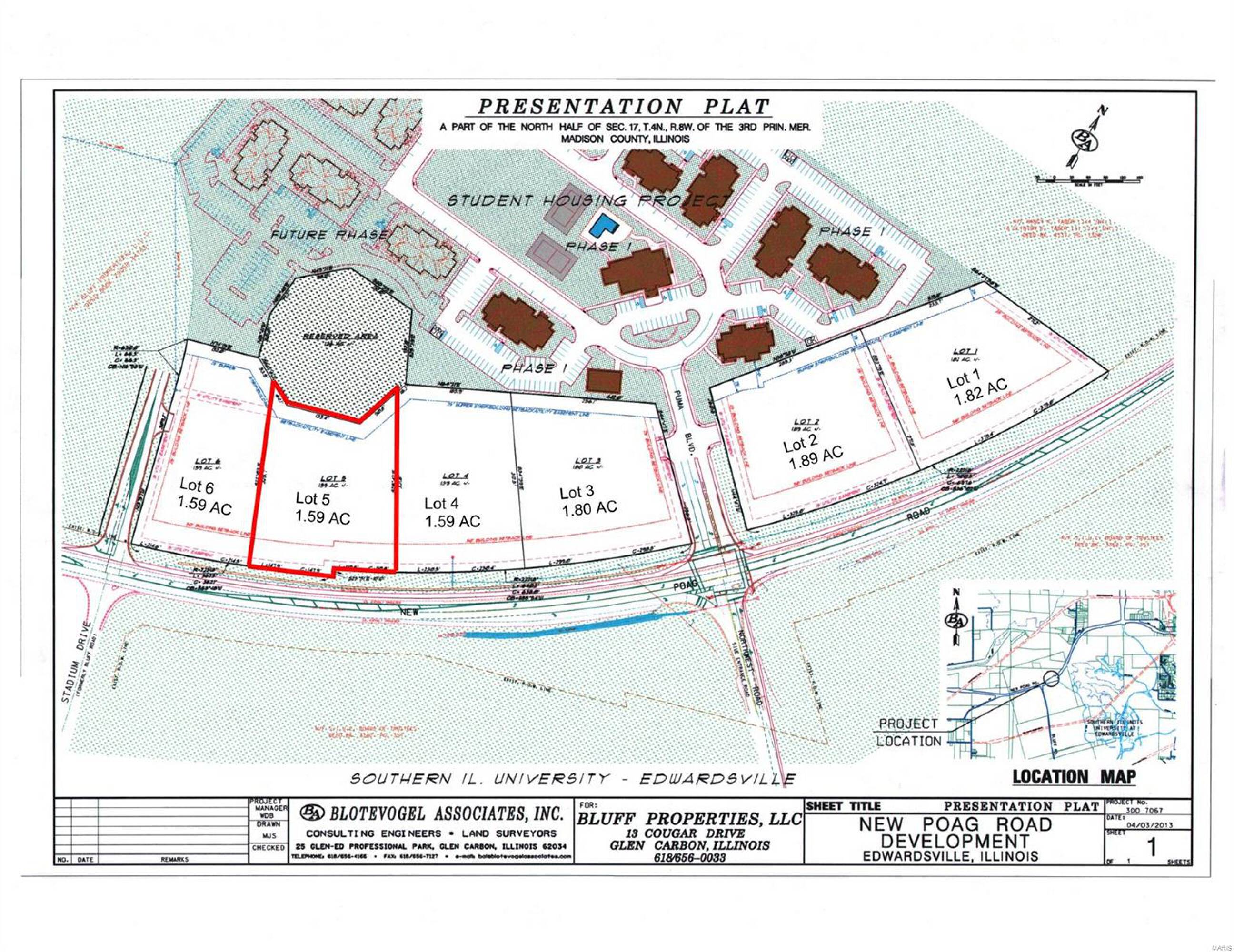 This property offers views of the American Bottoms and St. Louis. It is suitable for retail or upscale office development. The site benefits from access to a 4-way lighted intersection. The presentation plat is flexible, but the property must be platted prior to closing. It is identified as Lot number 5 on the presentation plat and is adjacent to the Enclave West student housing development.