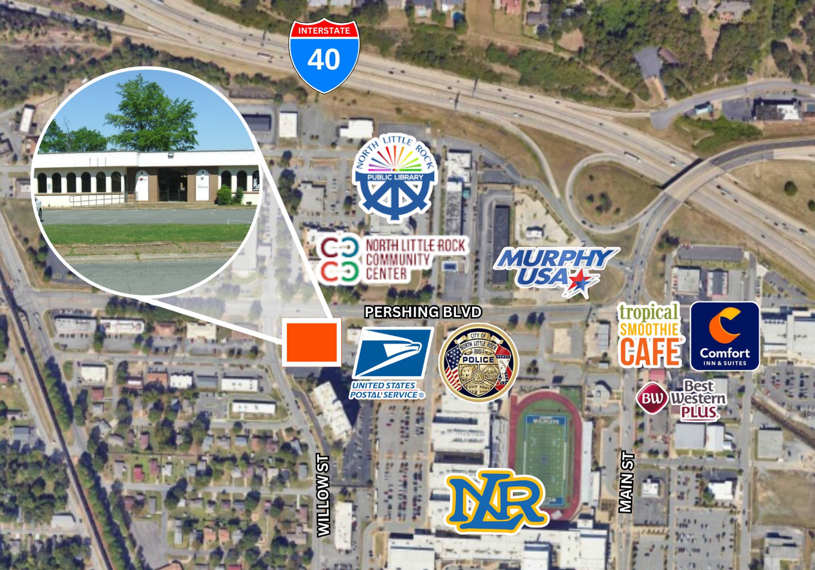 This property features: Highly visible corner lot in the heart of the North Little Rock Business District.; Easy access to I‑40 and I‑30.; Ample on‑site parking.