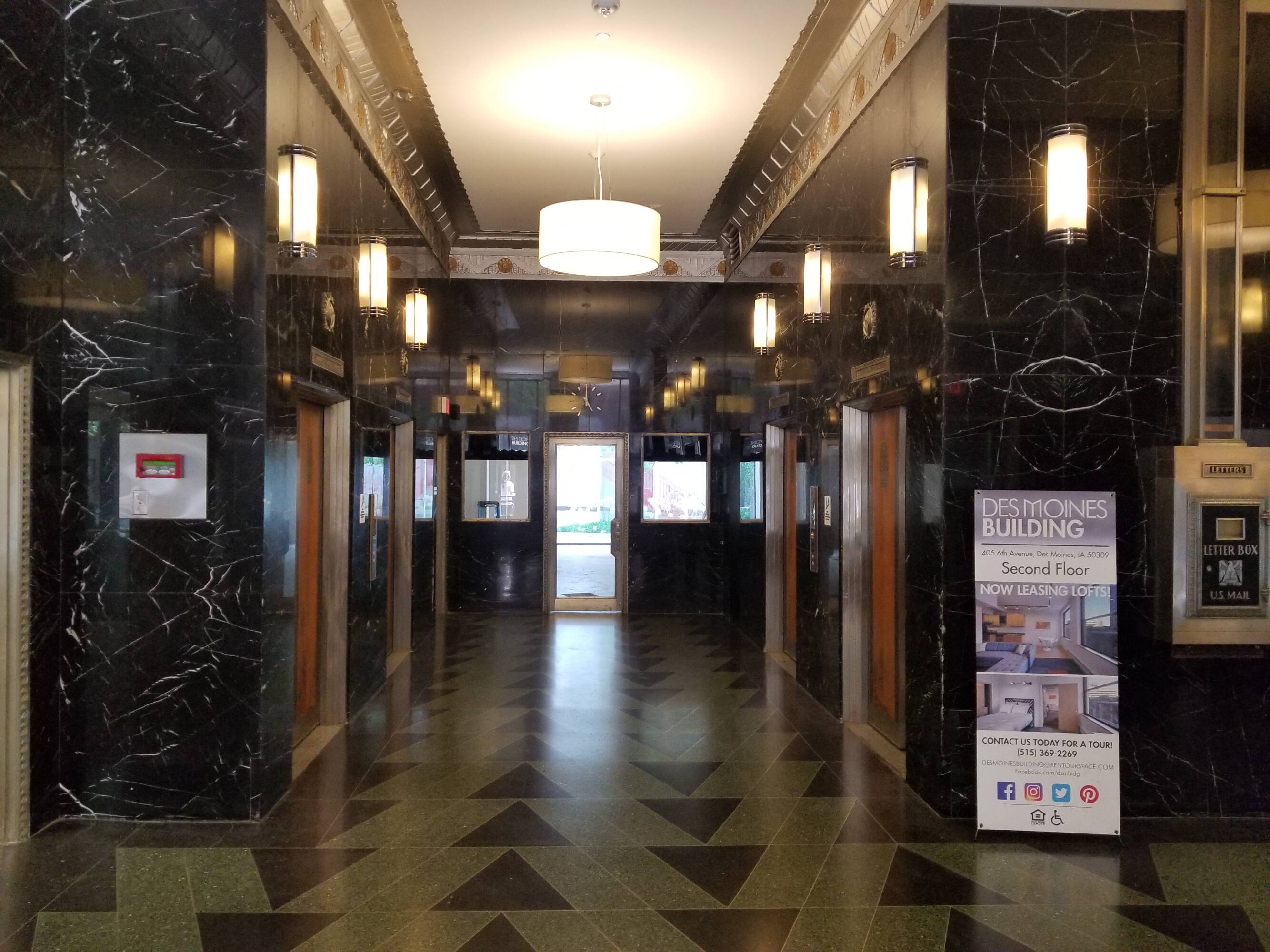 Constructed in 1930, the Des Moines Building is a 14-story structure featuring an art deco design. It was placed on the National Register of Historic Places in 2013. Originally an office building, it has been renovated, with the exception of the lobby, which retains its historic details. The building now offers 146 apartments and two floors of commercial space.