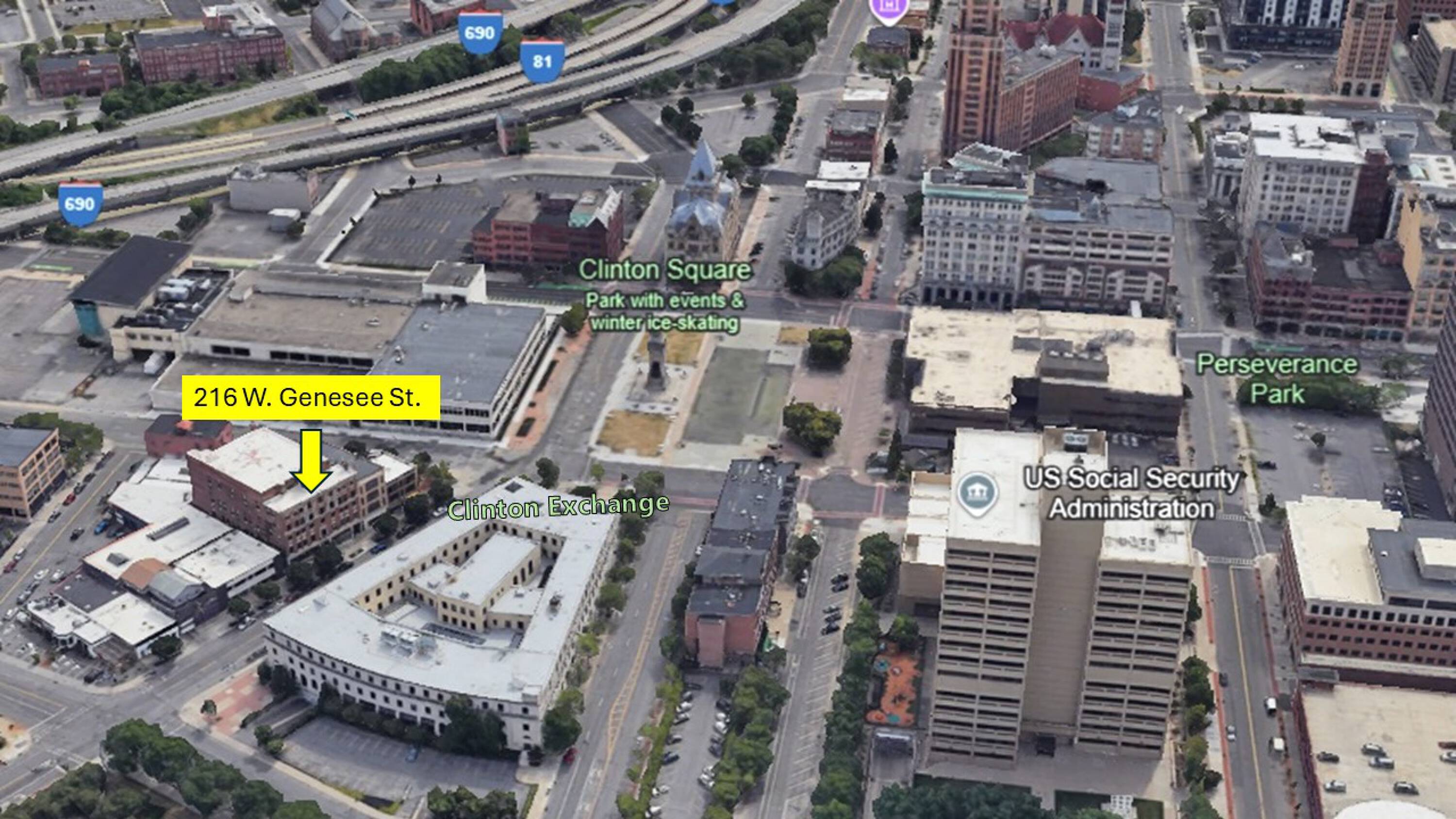 Prime commercial space in revitalizing downtown Syracuse near Clinton Square.