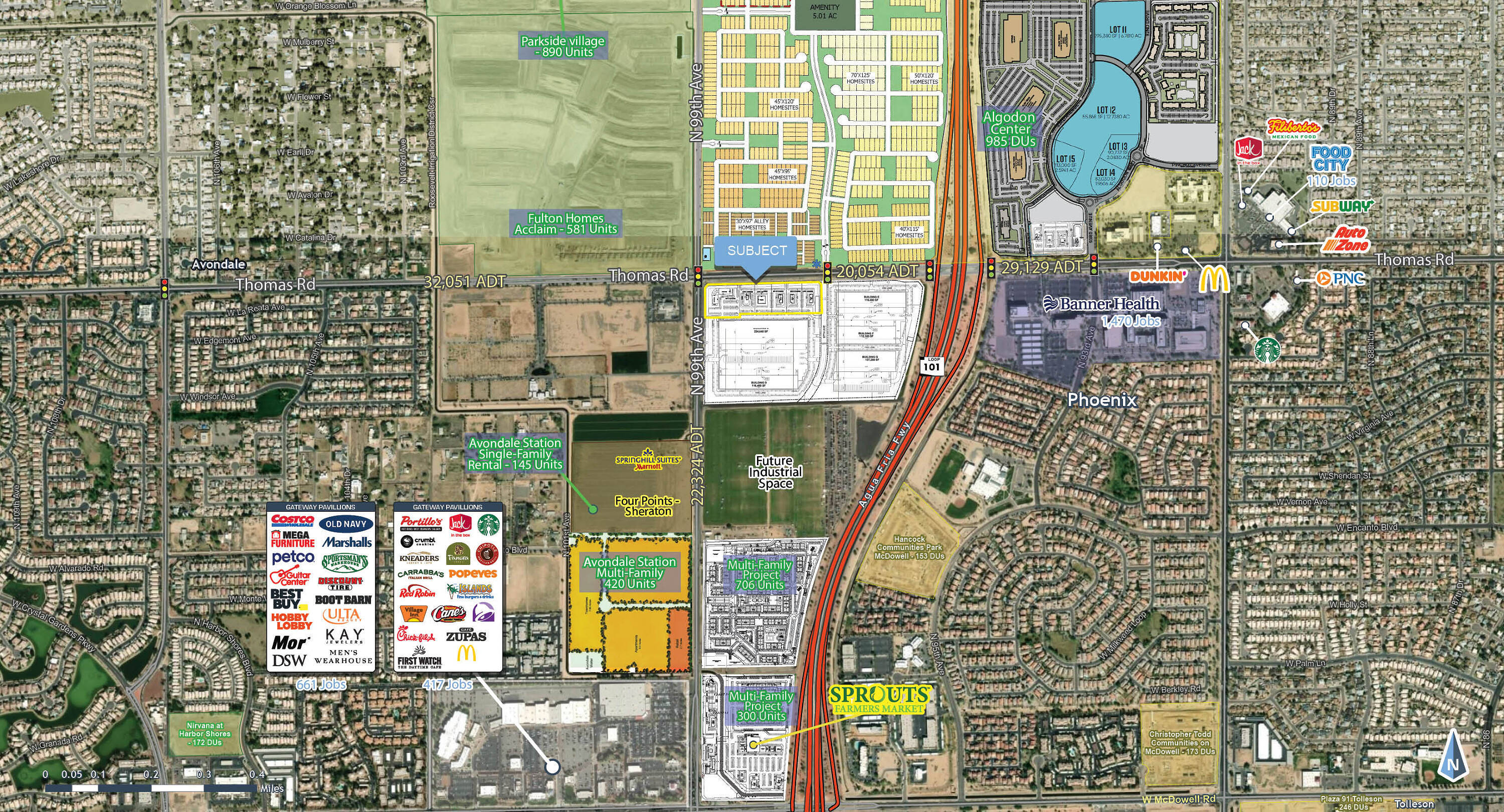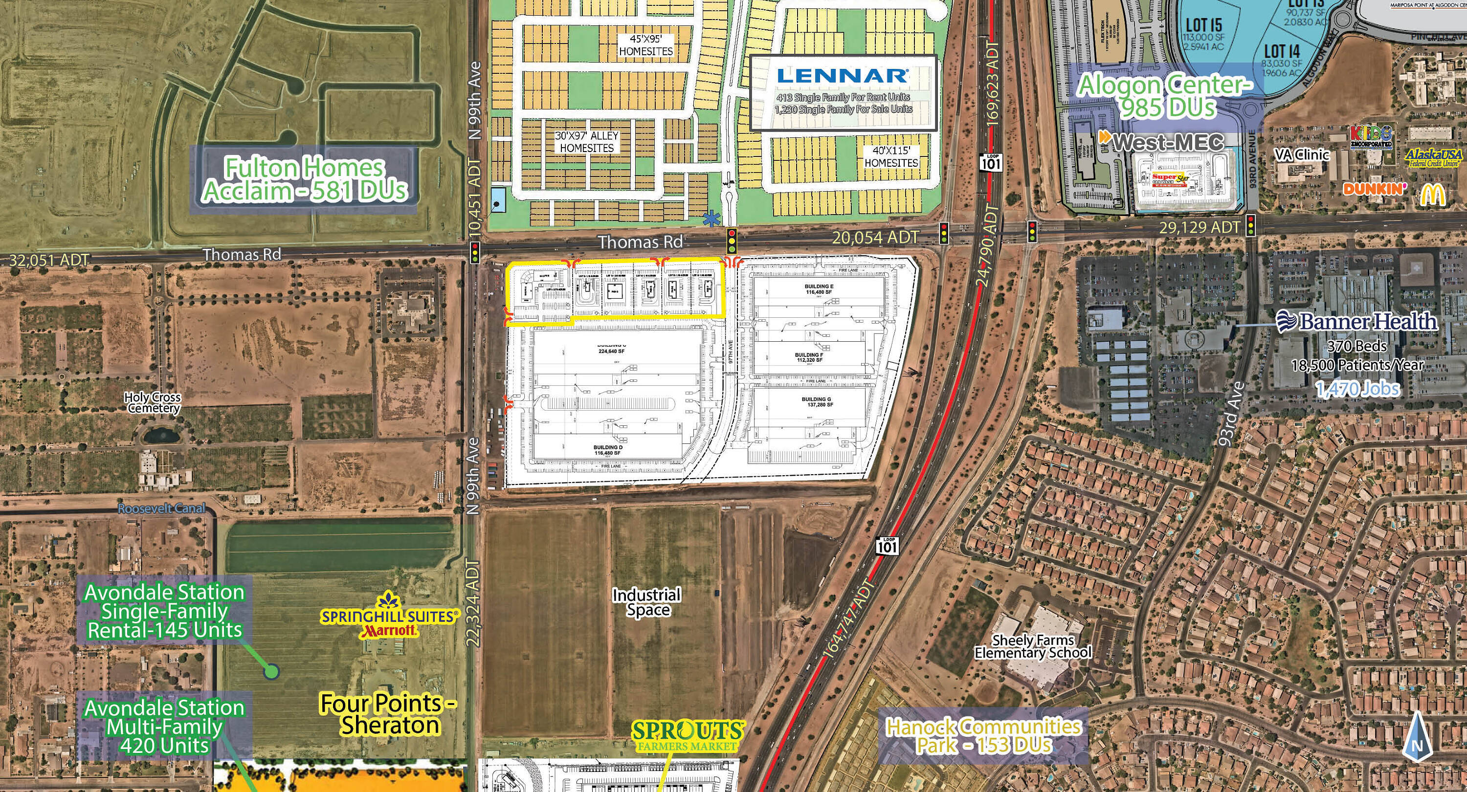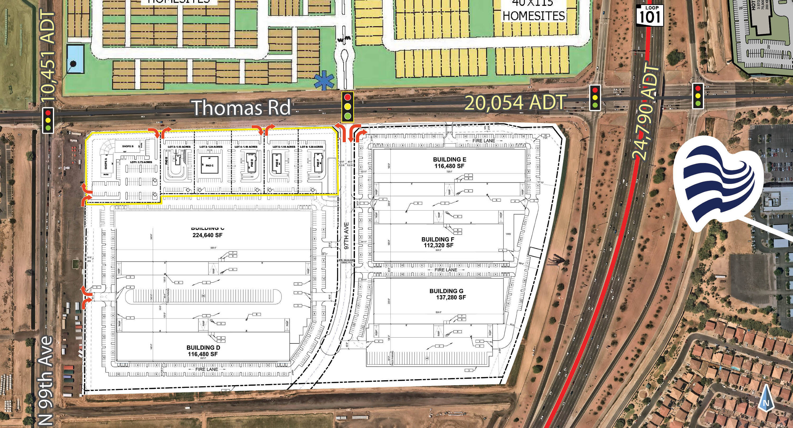 This property features: 8 acres of retail pads and shops available for lease, sale, or build‑to‑suit.; Located near the Loop 101 freeway.; Surrounded by 1,000+ residential units under construction.