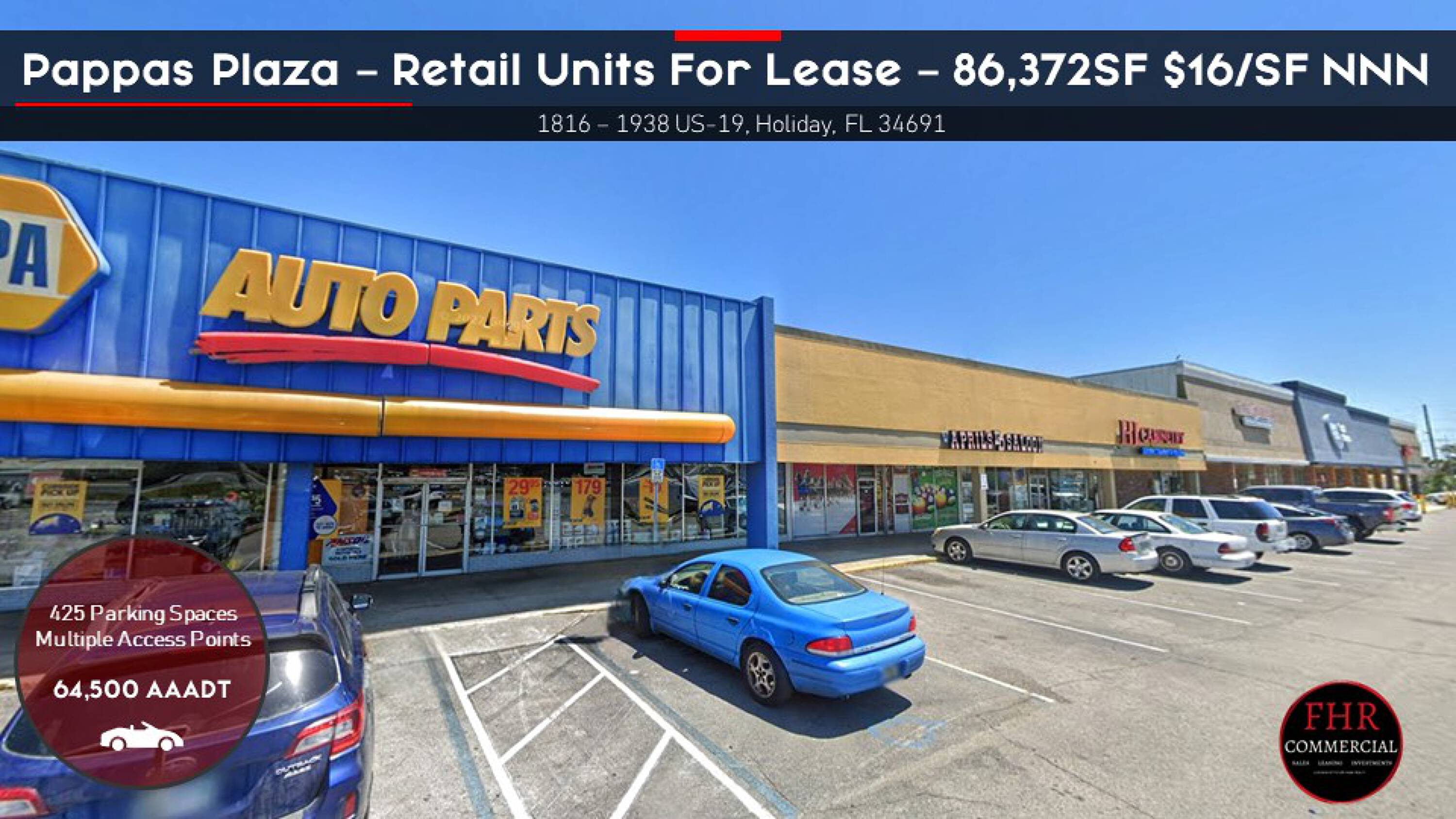 Spaces are available for lease at Pappas Plaza, a commercial hub located near the Pinellas/Pasco county border at the intersection of US 19 and Mile Stretch, just north of Alternate 19 and US 19. The plaza features national tenants such as Save-a-lot, NAPA Auto Parts, UPS, Little Caesars, and Subway. Other businesses include The Stockyard bar and concert venue, a pharmacy, laundromat, two breakfast restaurants, a furniture liquidator, and a cabinet shop. All leases at Pappas Plaza are NNN Triple Net.
