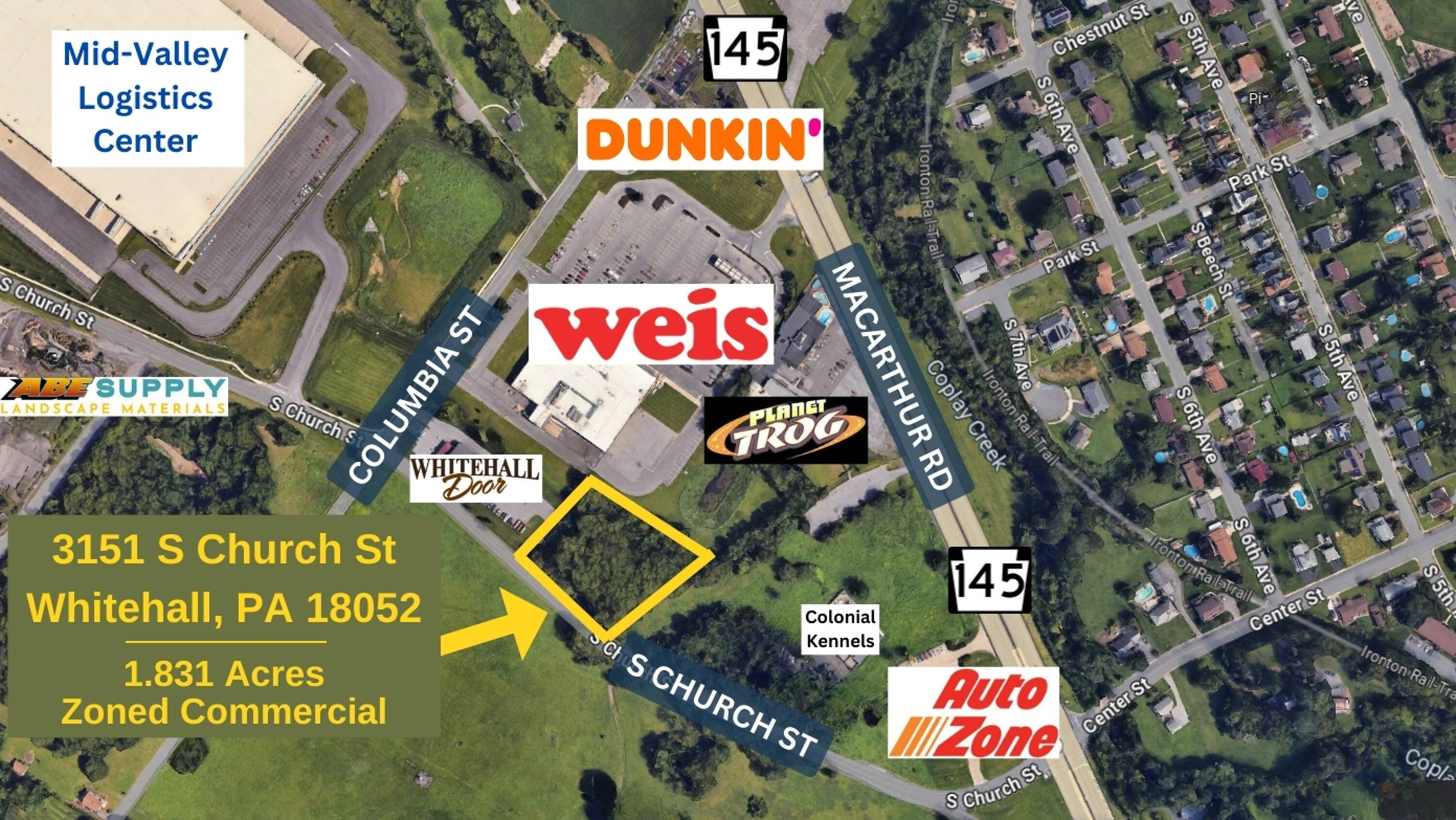 This commercial land offers an opportunity for constructing a commercial building along Rt. 145 (MacArthur Road) in Whitehall, PA. The lot is situated on Church Street, adjacent to Whitehall Door and behind Weis Markets. Other businesses in the area include Dunkin', Mia Bella Hair Salon, and AutoZone.