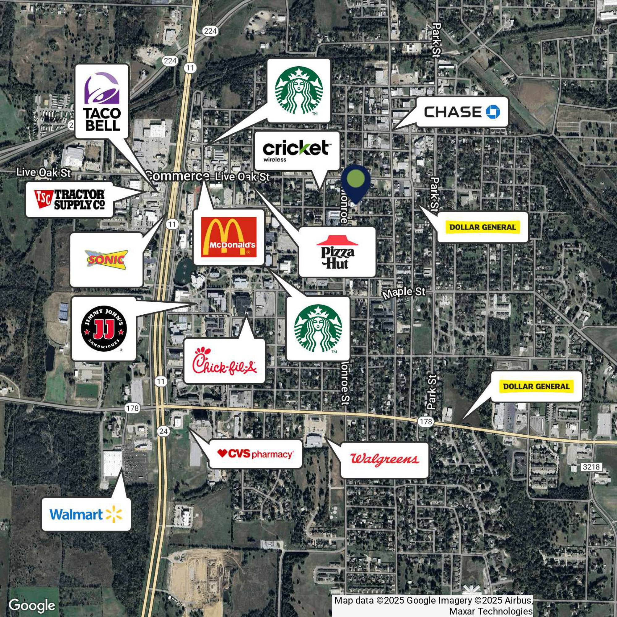 The property is located at 1407 Live Oak St. in Commerce, TX, within a community that blends small-town charm with commercial activity. Its location near Texas A&M University-Commerce provides a consistent influx of students and faculty. The property is situated near the downtown area, which features local shops, restaurants, and entertainment venues. The location offers visibility and accessibility for retail and strip center tenants due to its proximity to major highways.