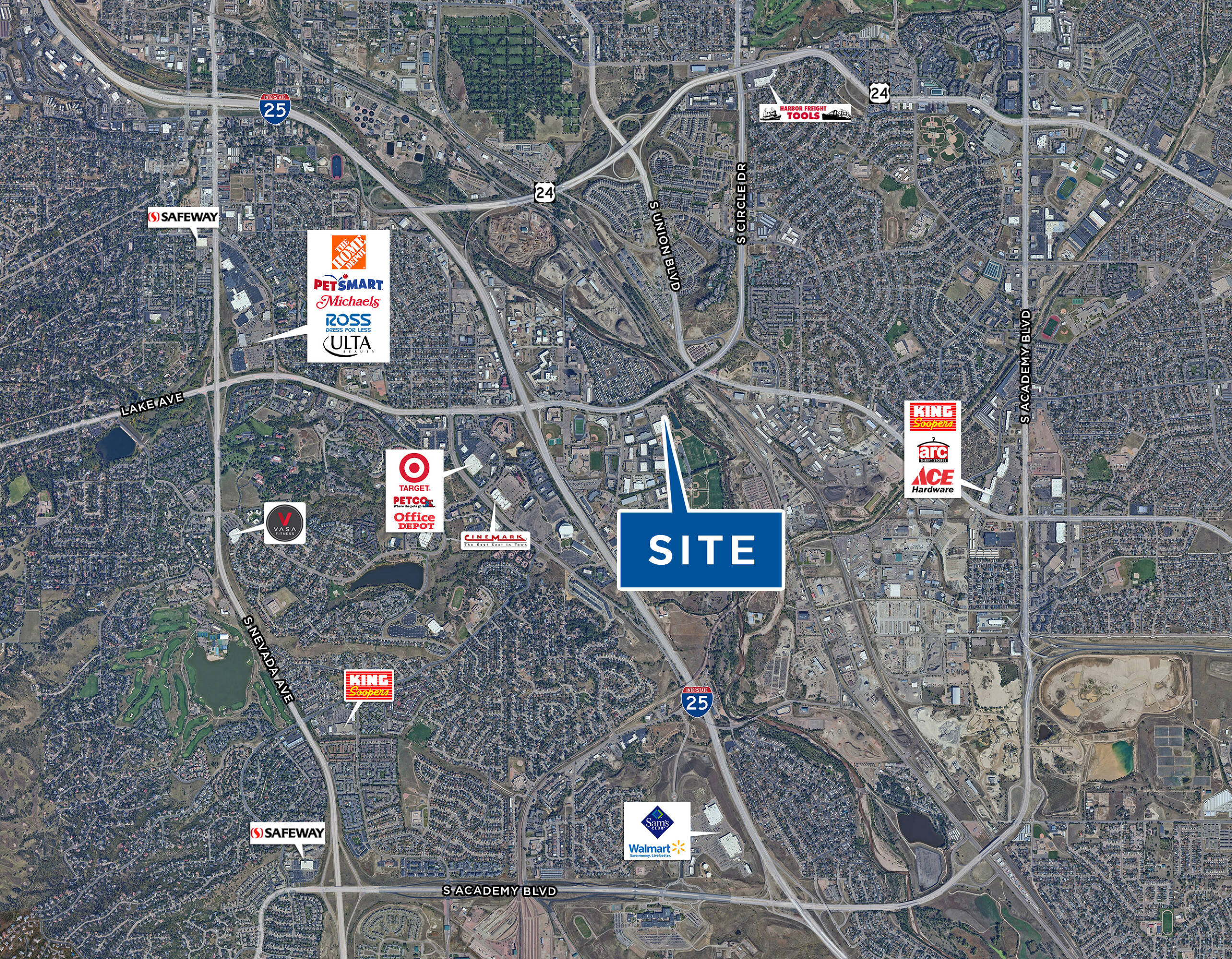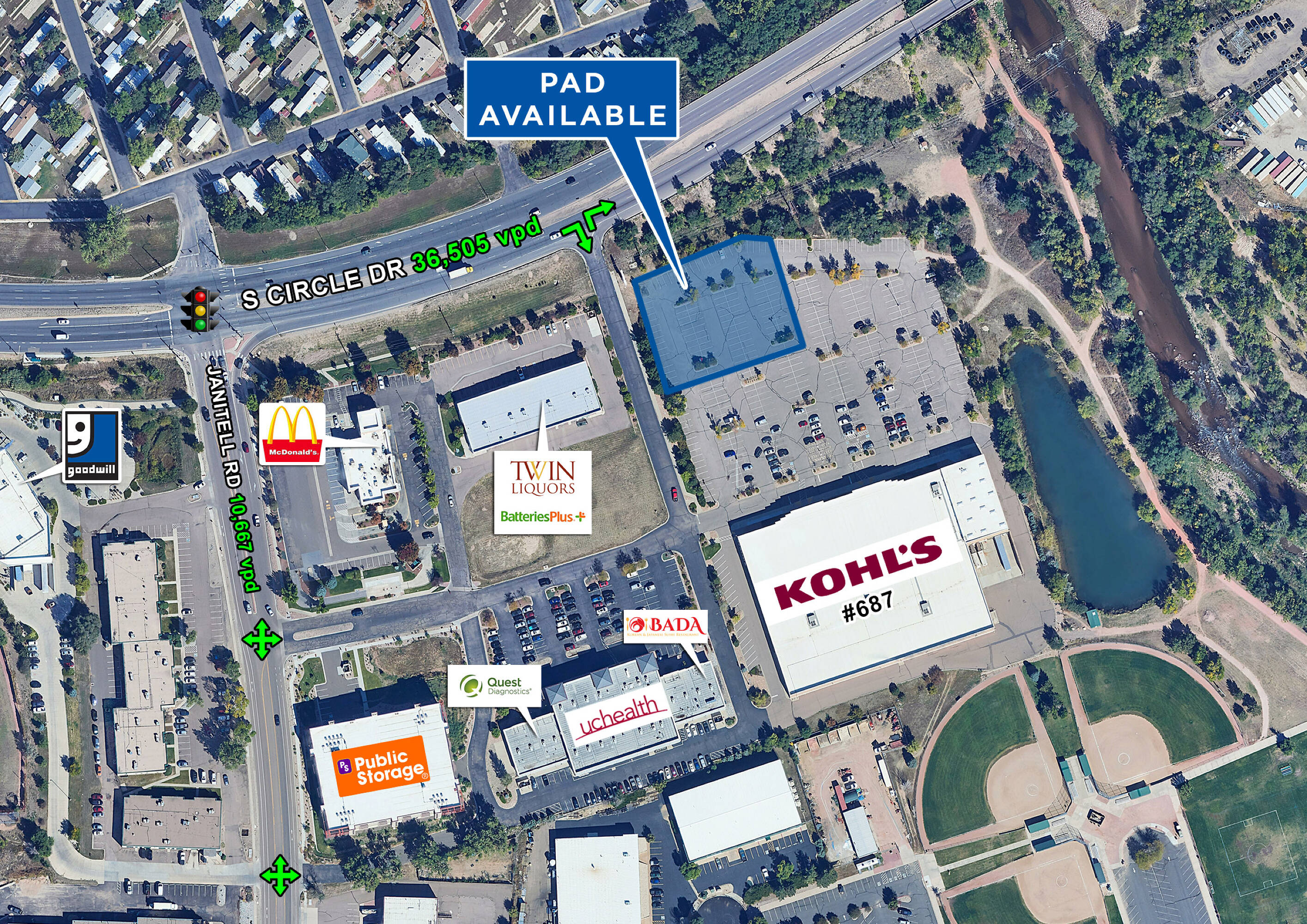 Pad site available near major retailers in Colorado Springs.