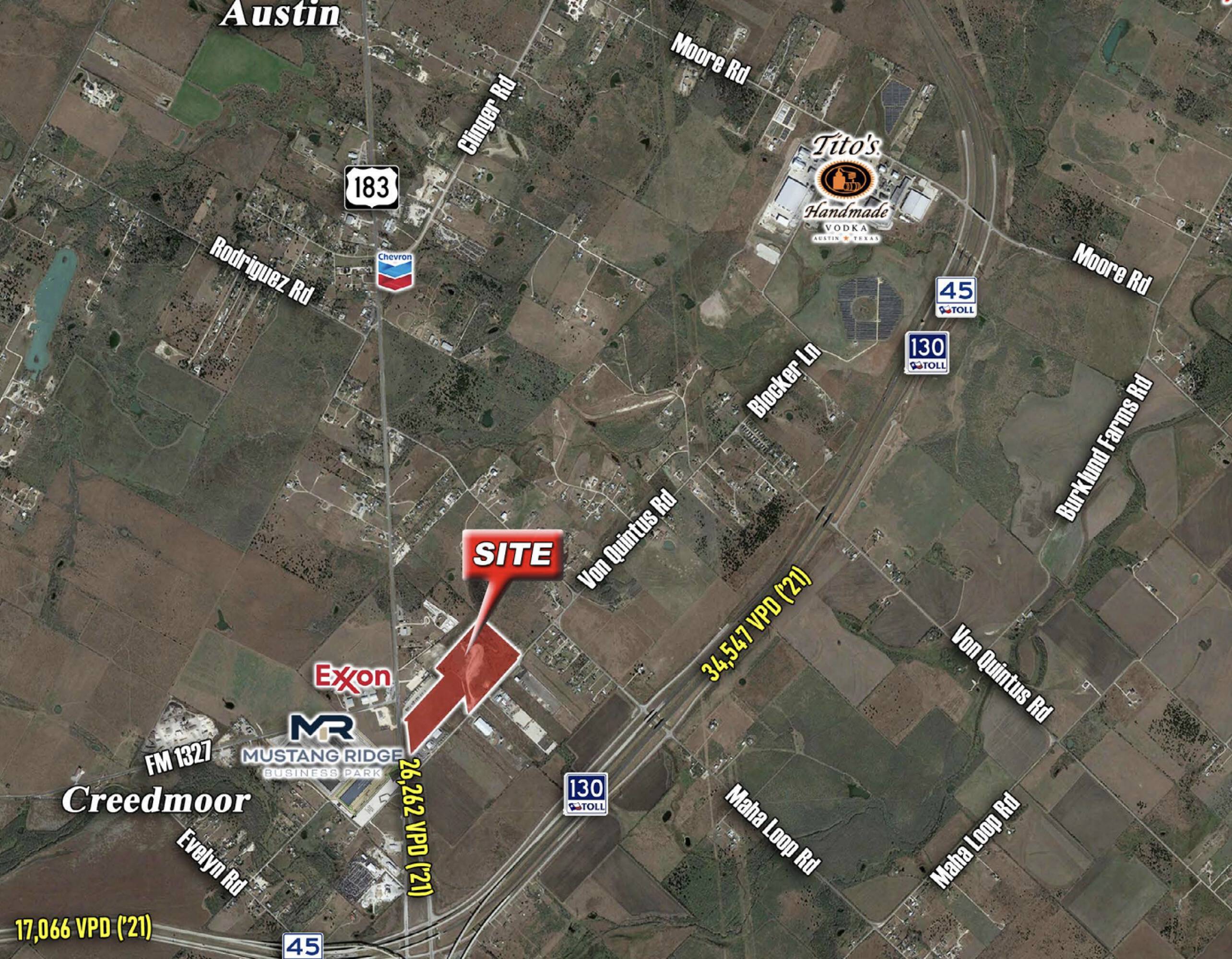 The subject property is located just off the northeast corner of US HWY 183 South and Von Quintus Road within the city limits of Mustang Ridge. The property is zoned commercial, which allows for a wide variety of general commercial uses.