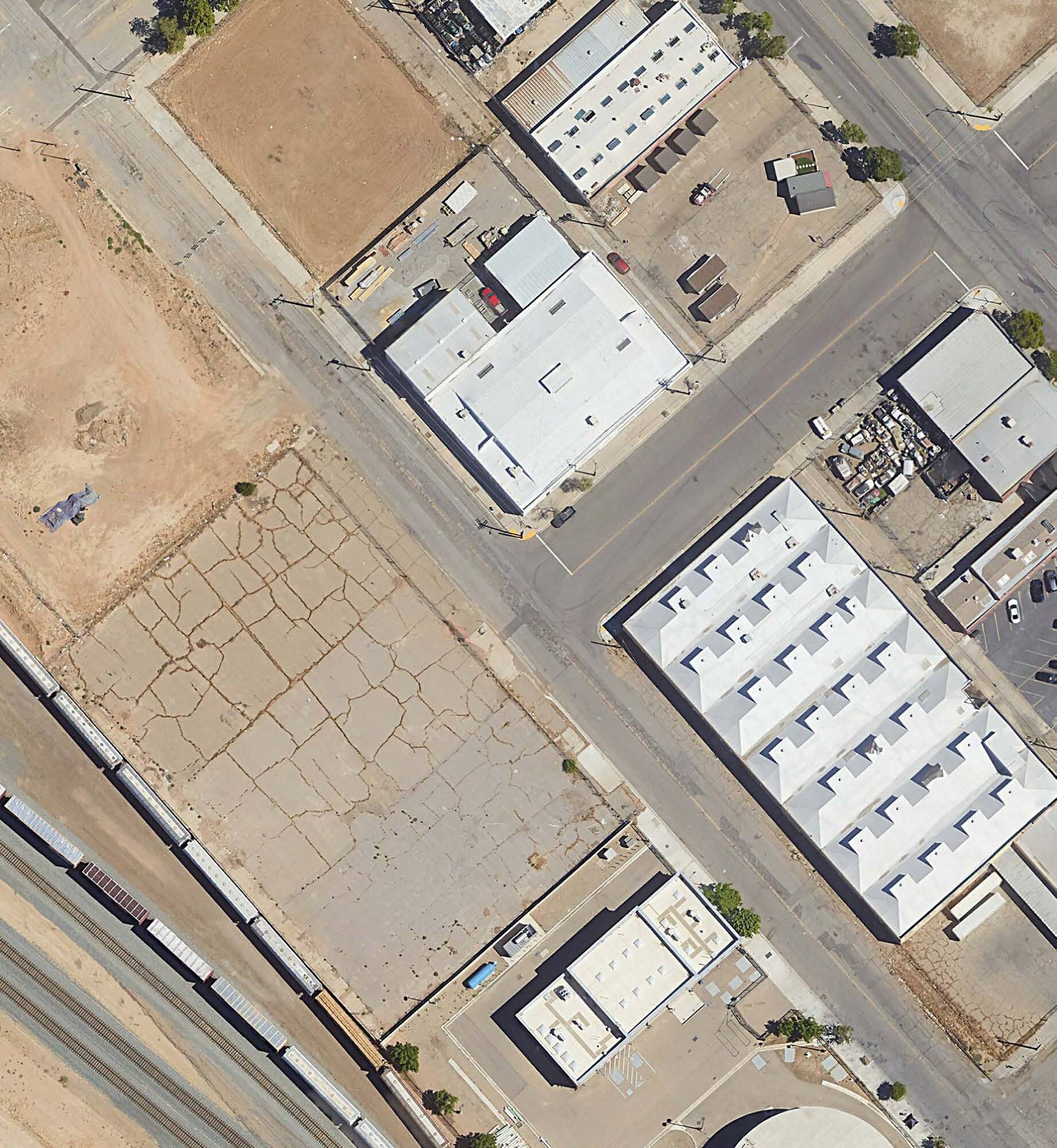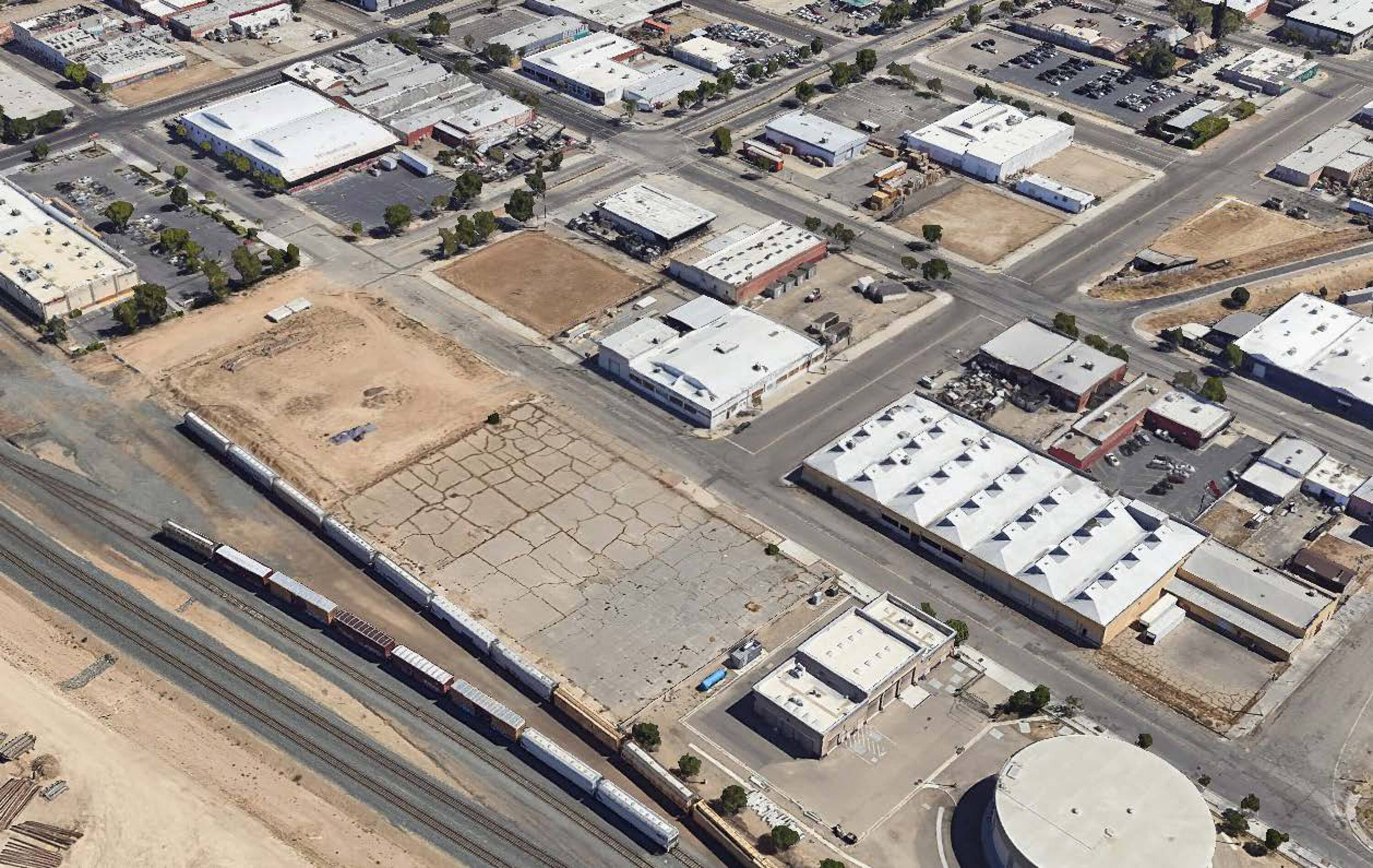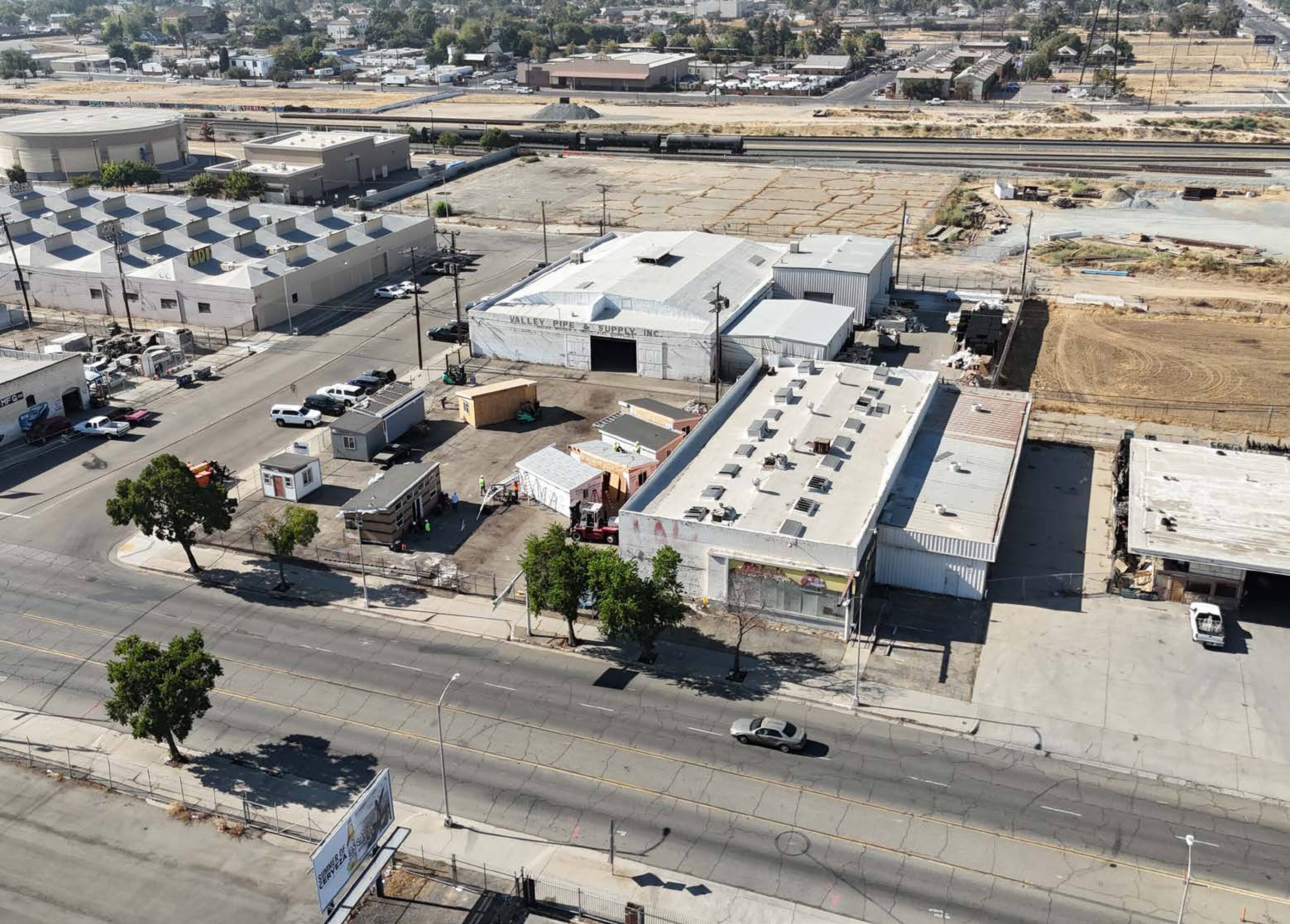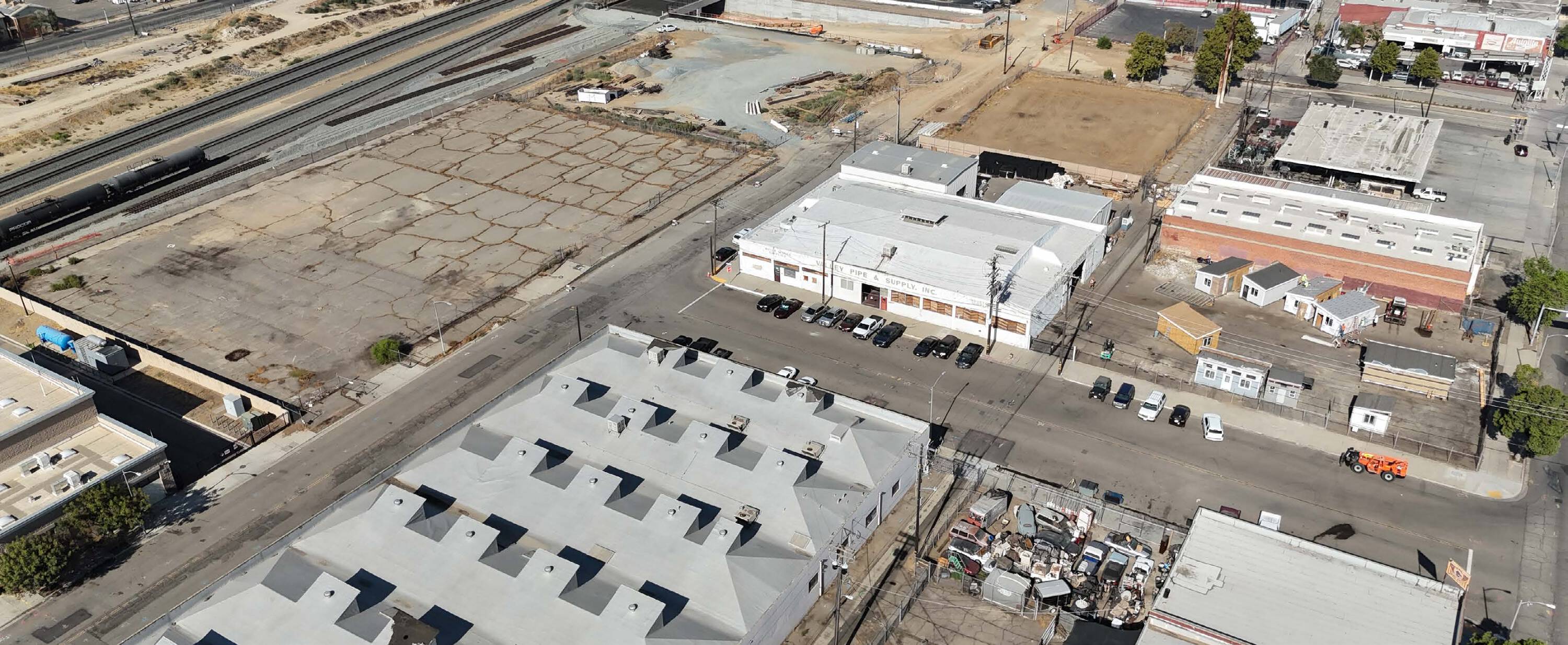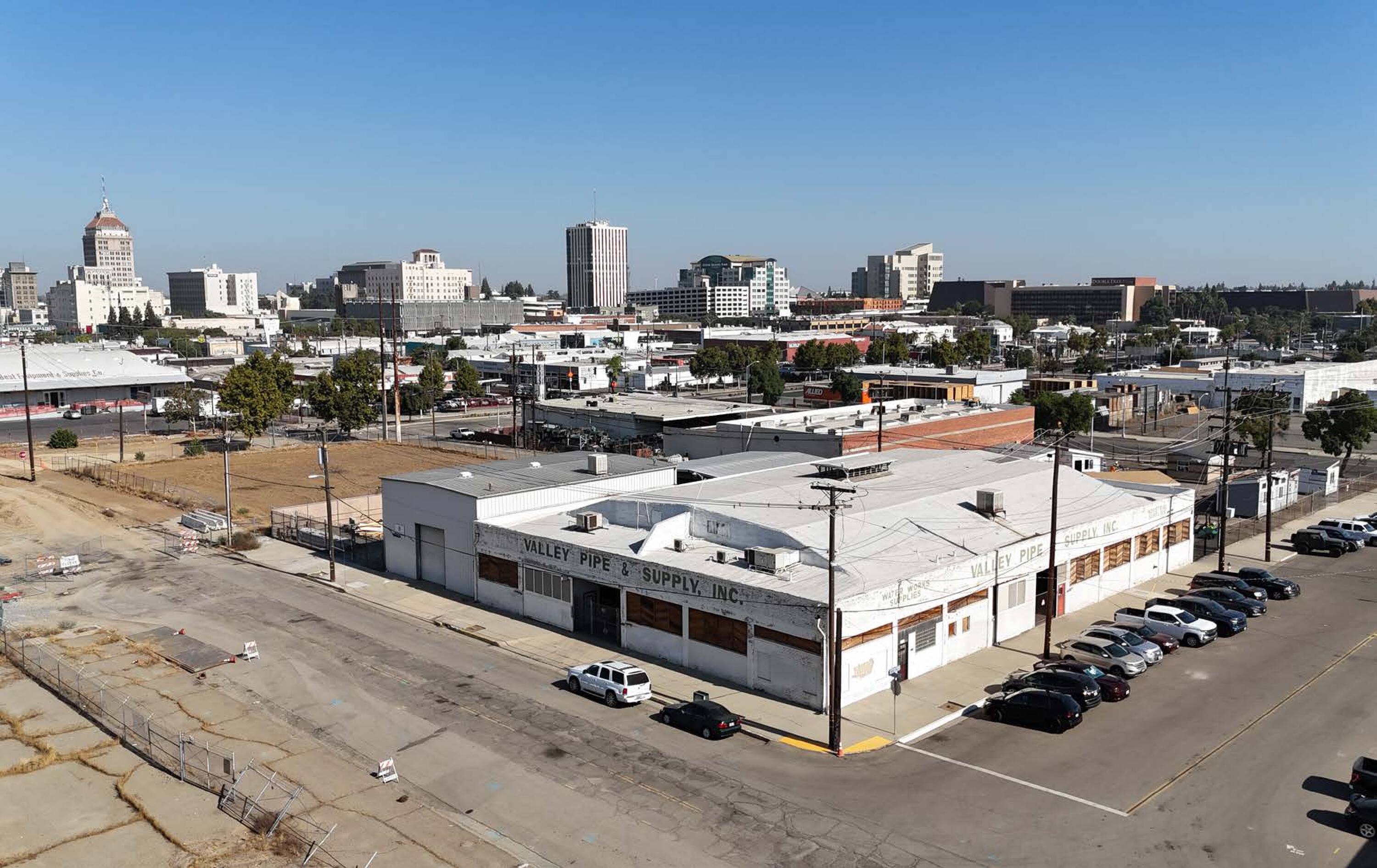 Downtown Fresno warehouse building with parking lot and storage for sale.
