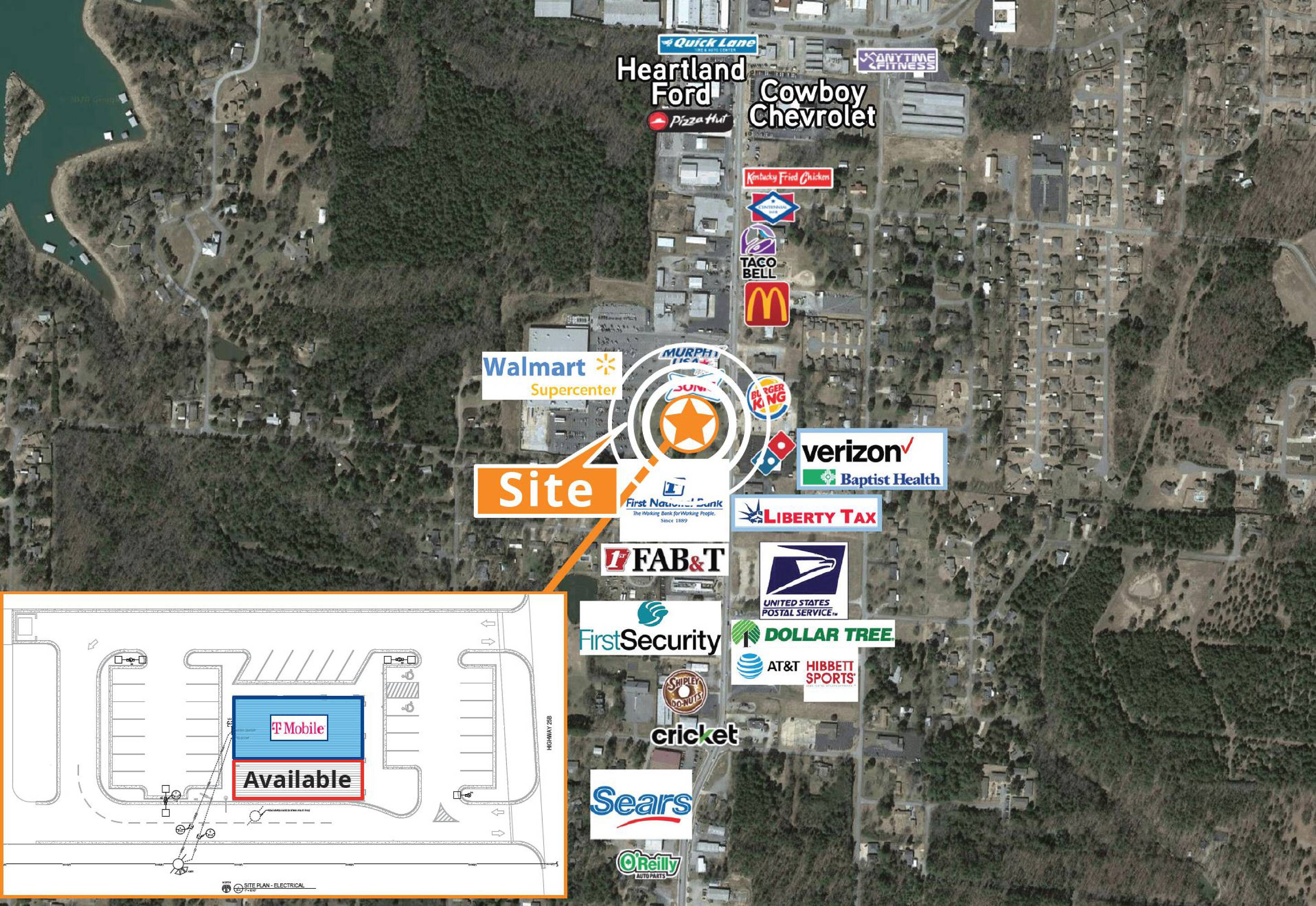 This commercial property offers a unique drive-thru end-cap space. It is suitable for various business types, including drive-thru restaurants, general restaurants, and retail spaces. The property is located at 25 Heber Springs Rd, Heber Springs, AR 72543.