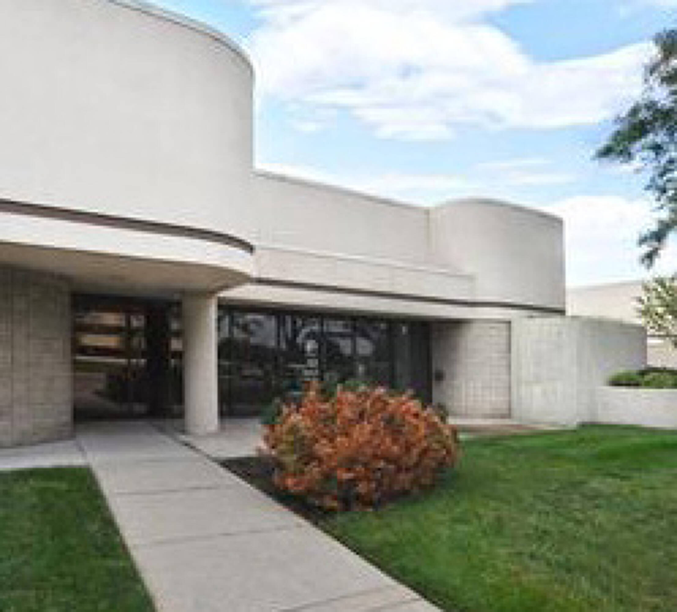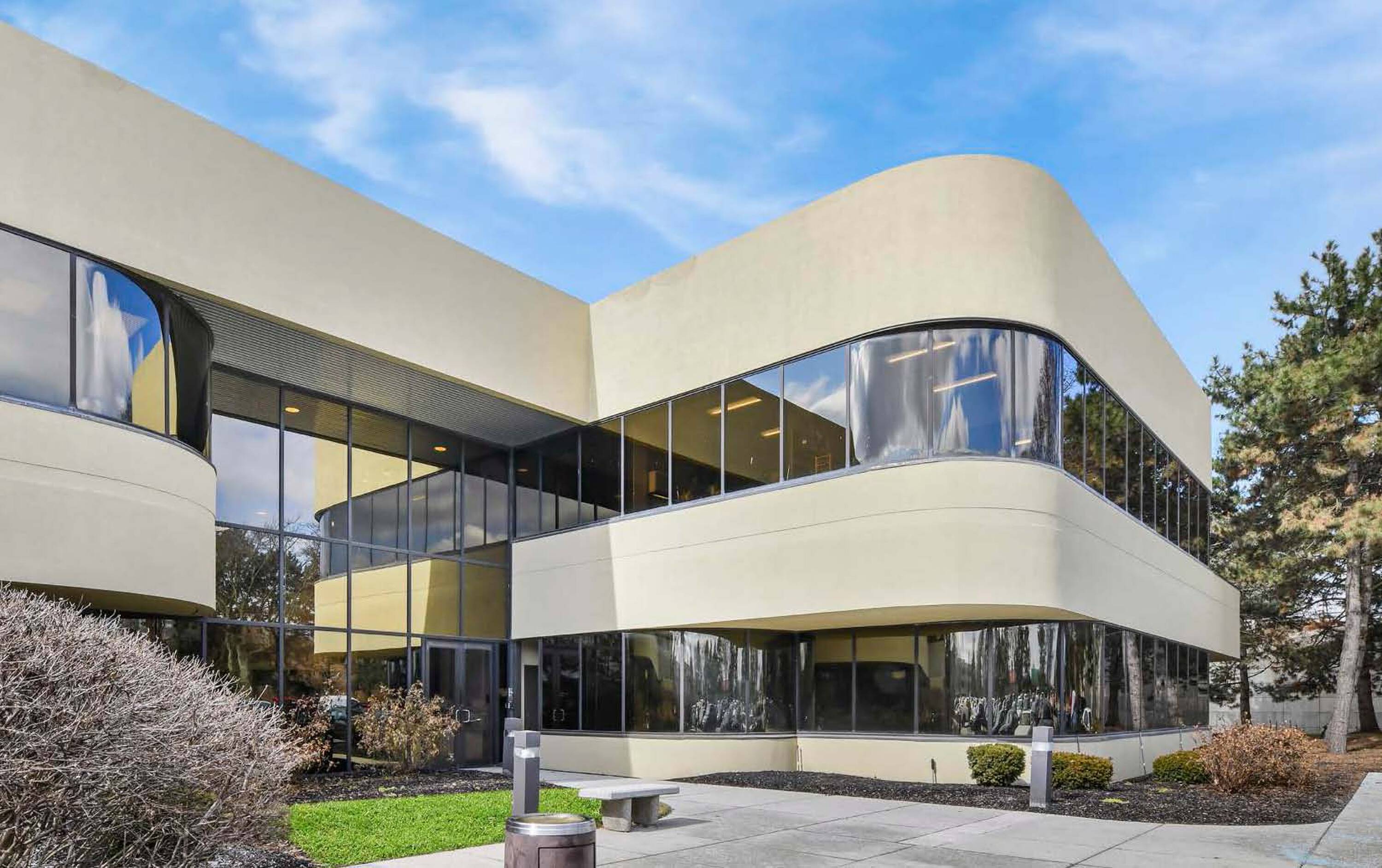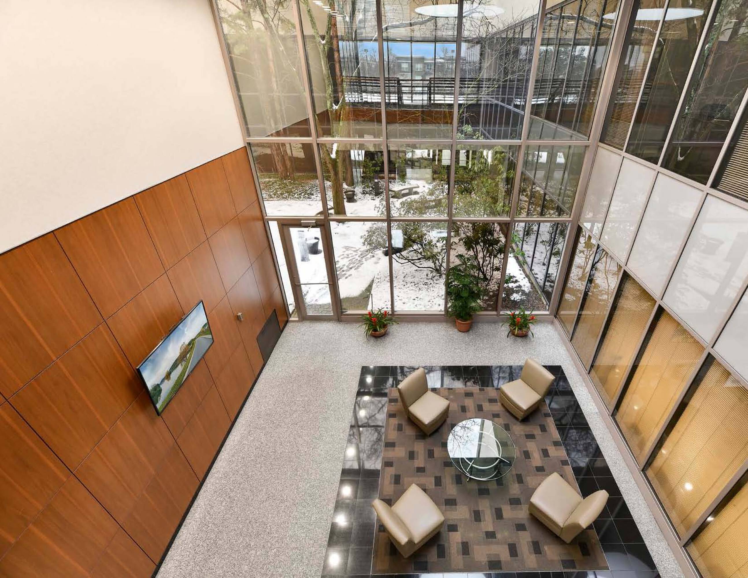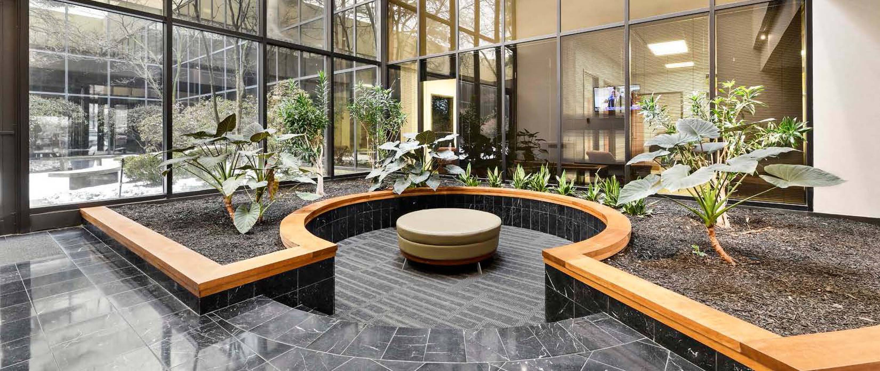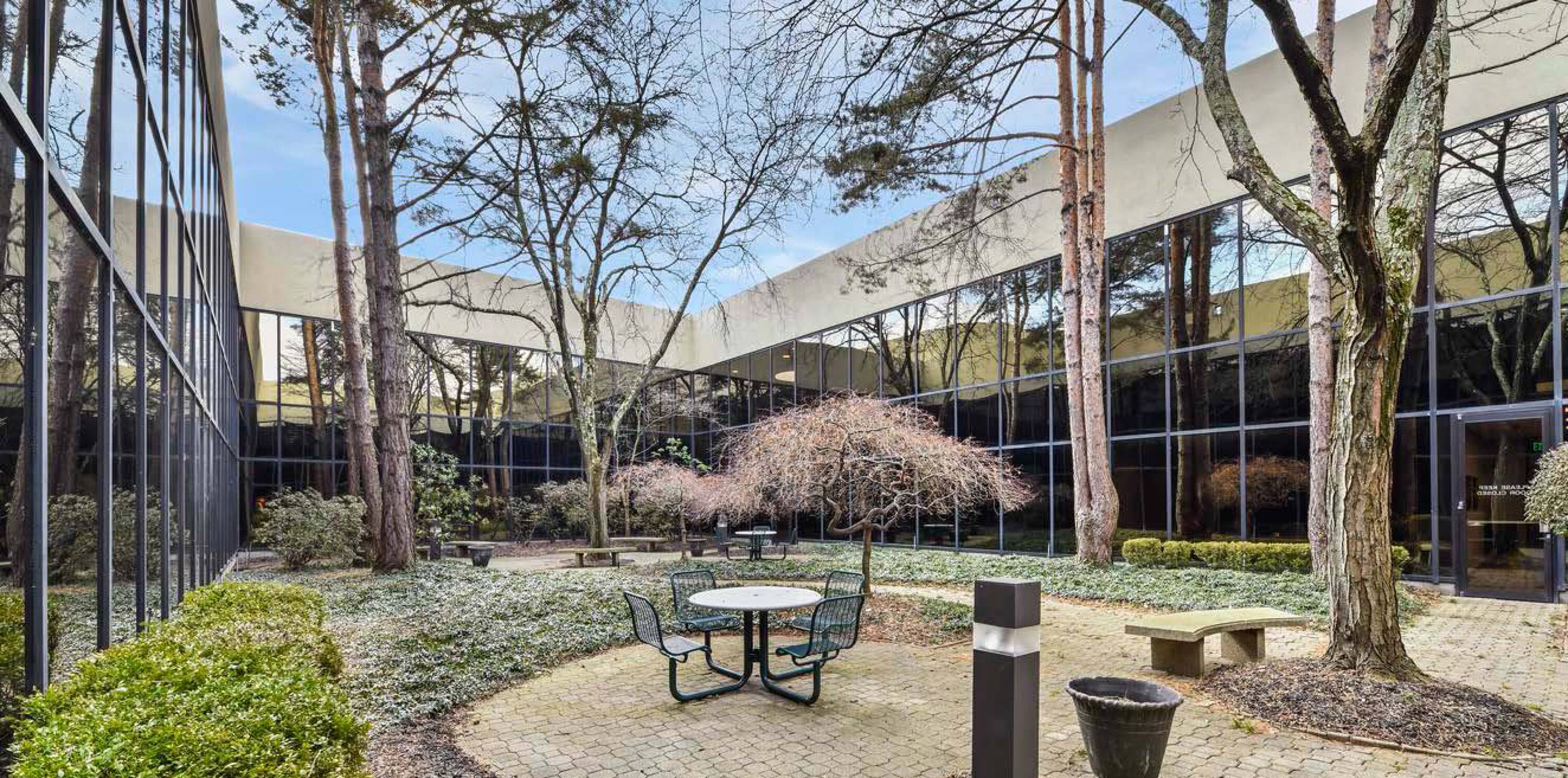 Two-story office building with renovated interior and courtyard.