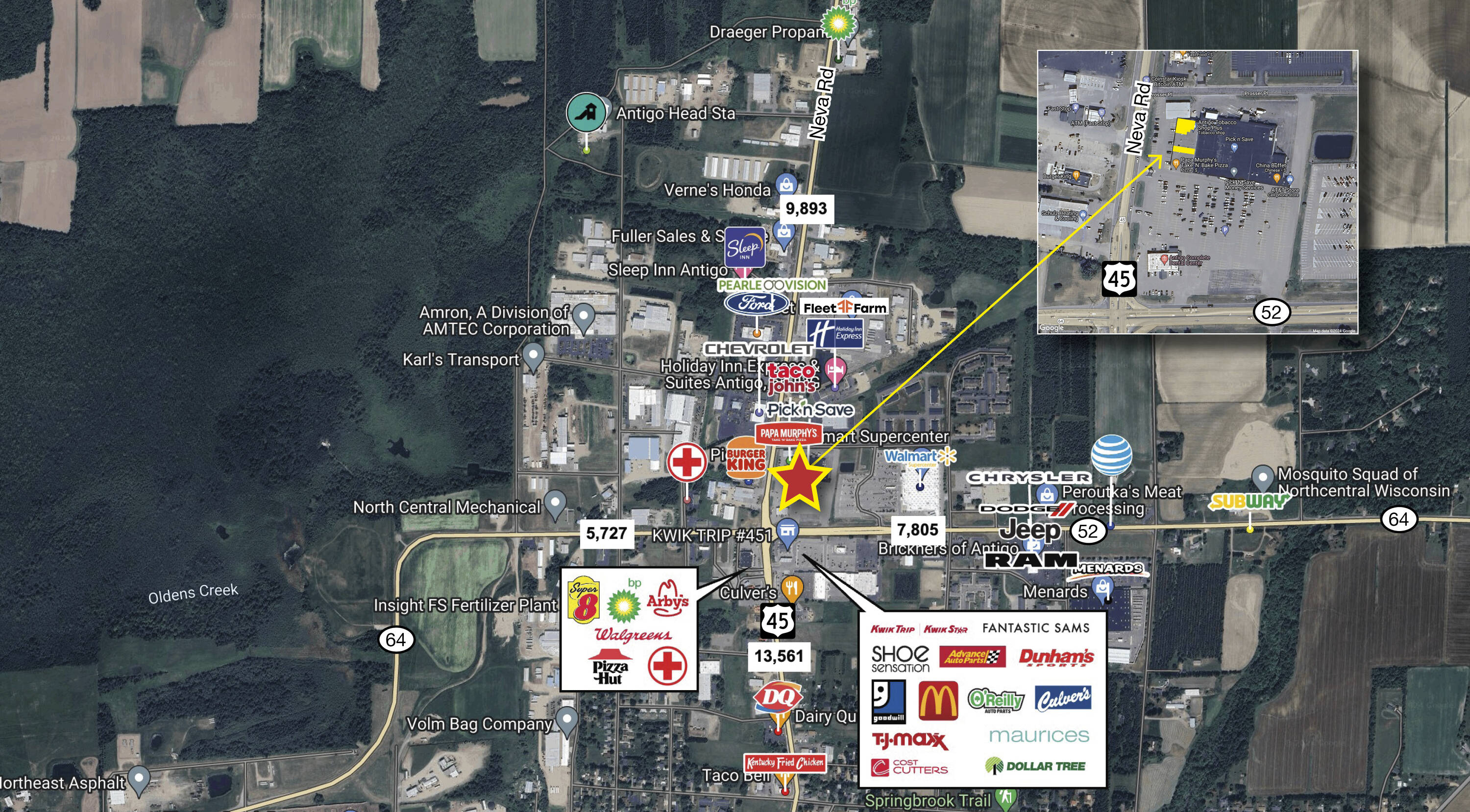 Located in the City of Antigo's busiest business district, this retail space is situated at the major intersection of Highways 45, 64, and 52. Part of Antigo Crossing, anchor stores include Pick 'n Save, China Buffet, Shopko Optical, and dental and chiropractic offices. The location offers high traffic, high visibility, and easy access.