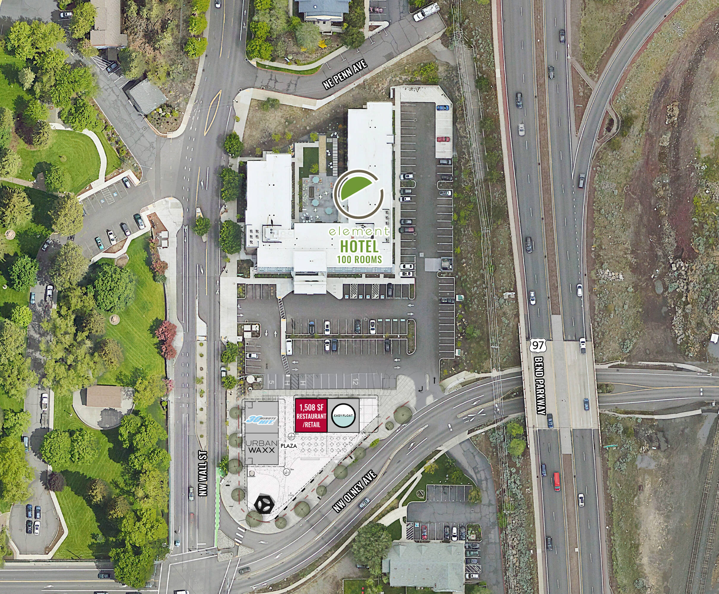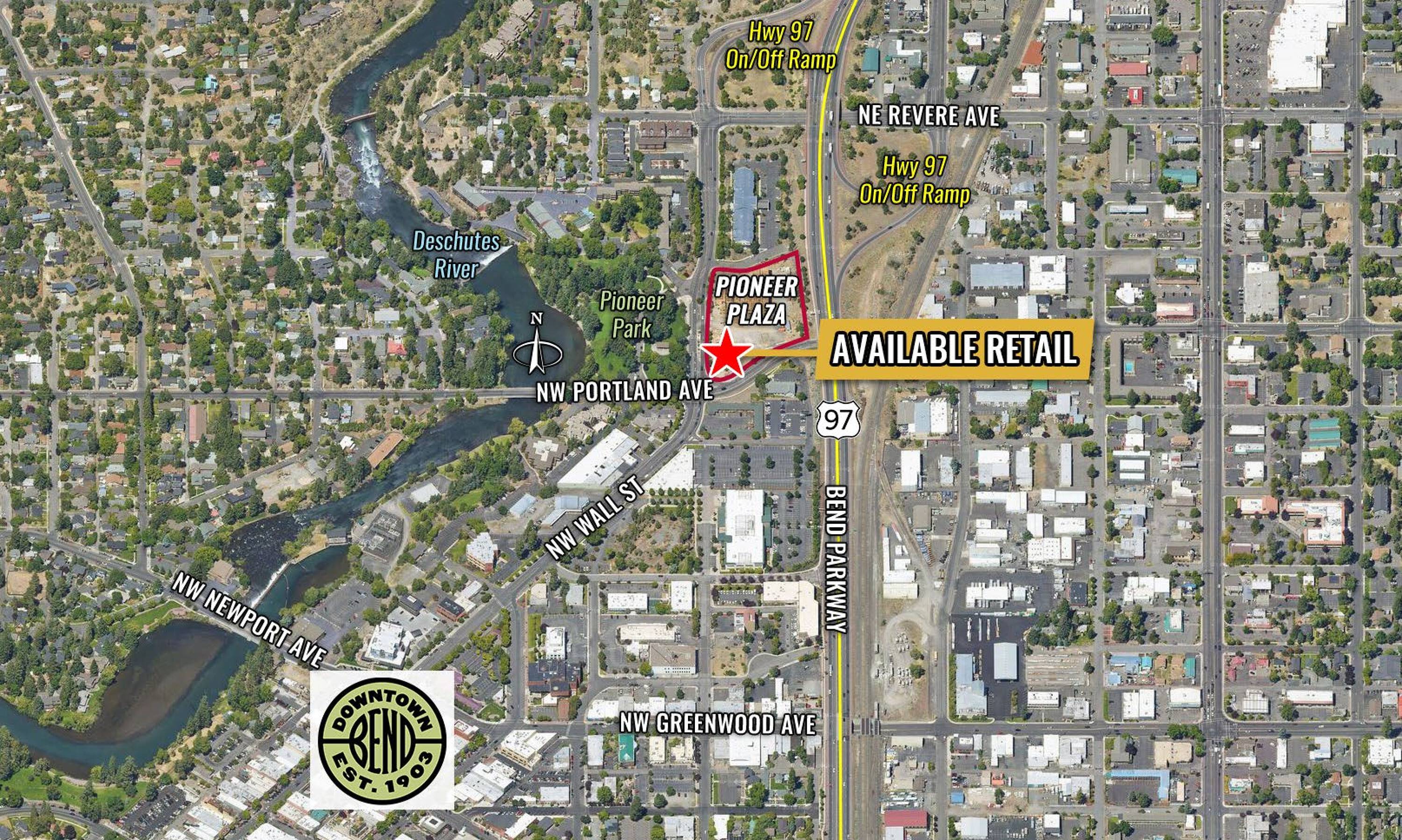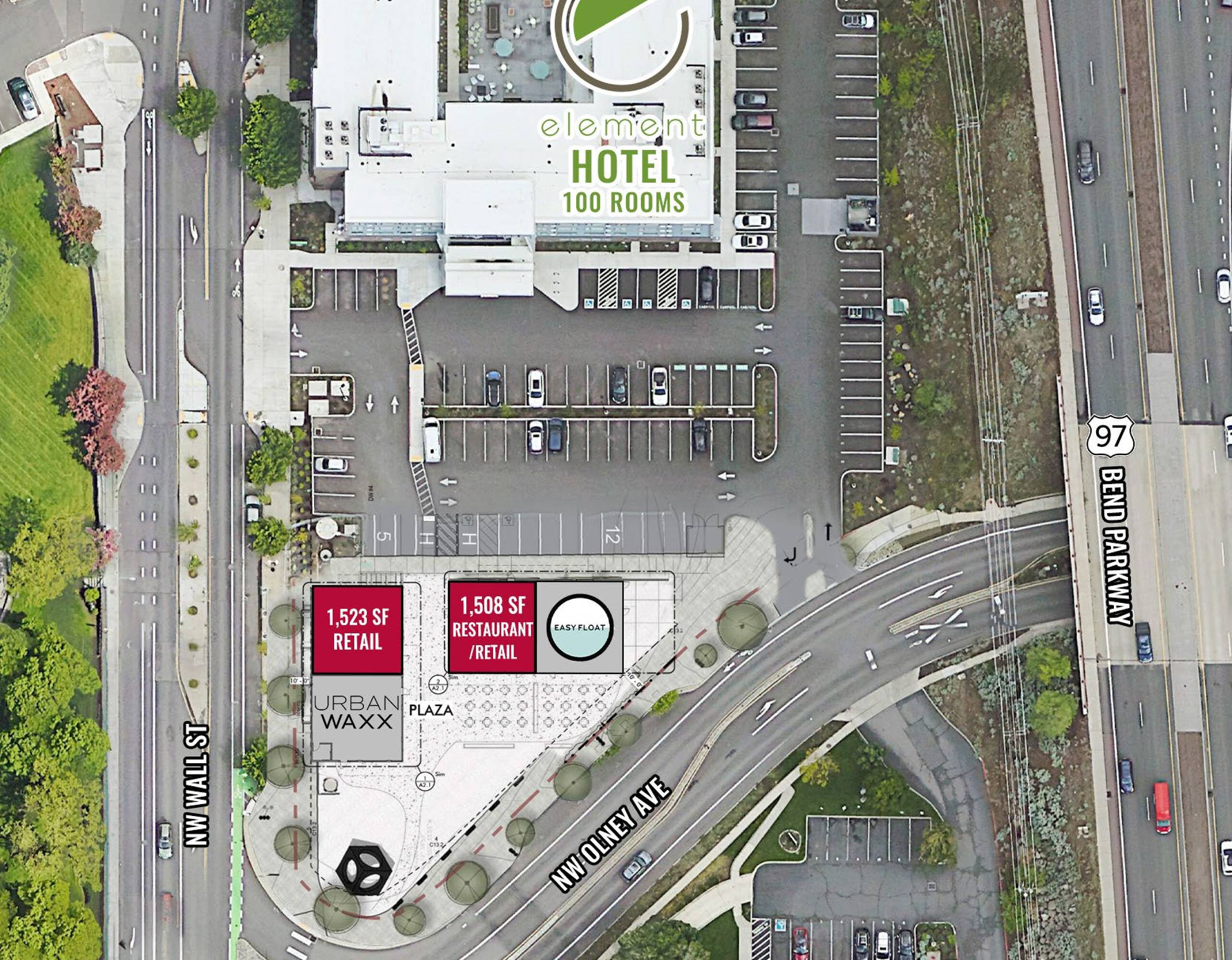 This property is part of a new retail development located in the heart of Bend. The location benefits from built-in customers due to its proximity to a 100-room hotel. On-site parking is available. The suites are situated at the intersection of two major connector roads, providing easy access to Highway 97/Bend Parkway. The property offers views of Pioneer Park and the Deschutes River. Ample outdoor seating is available, which may increase traffic for restaurant uses. Construction for the two 3,000 SF buildings is now complete. One building is partially leased to Urban Waxx. The other is partially leased to Easy Float, with 1,508 SF available for lease to a restaurant or retail user.