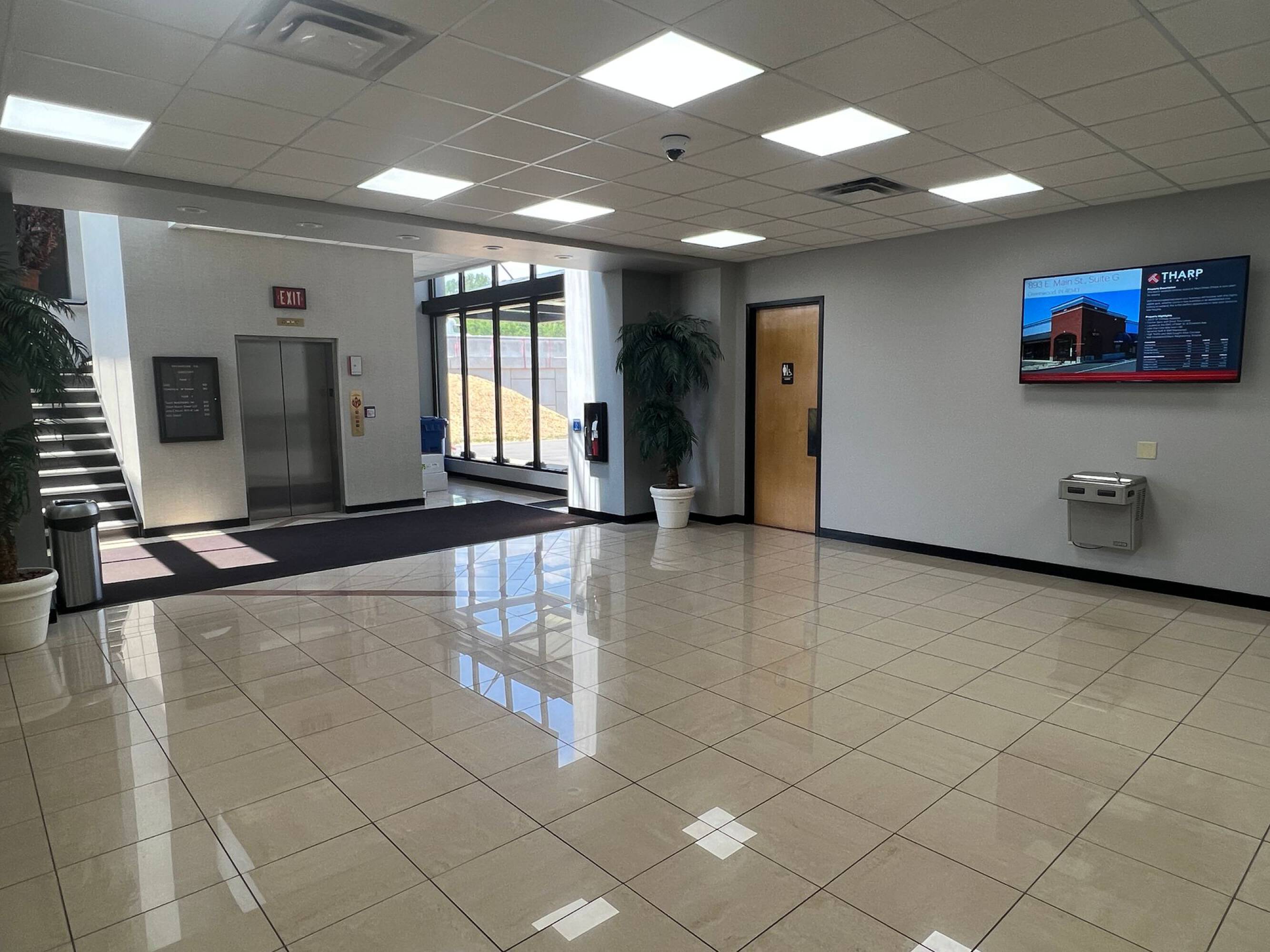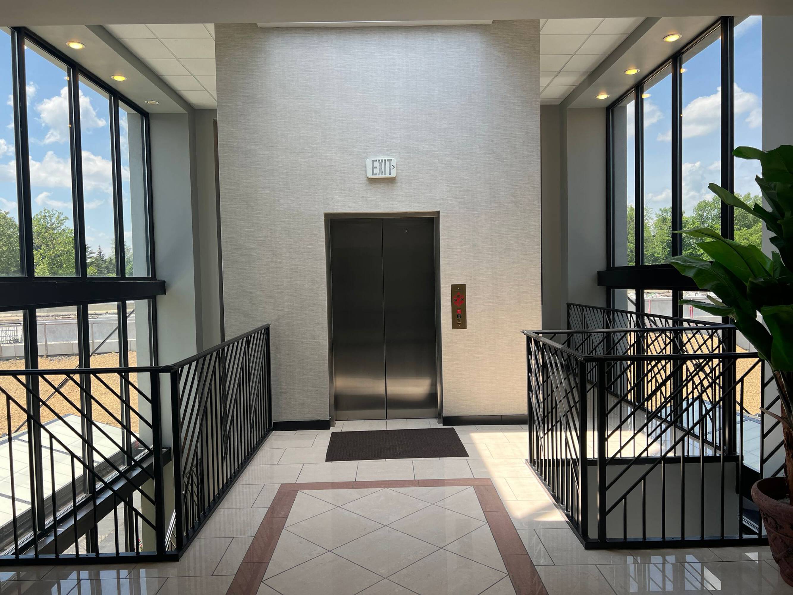 This office space features multiple executive-level offices in addition to smaller private offices. Restrooms are located on both levels. The property includes handicap-accessible doors and an elevator. Conference rooms and a large training room are available. The building features mirrored glass.