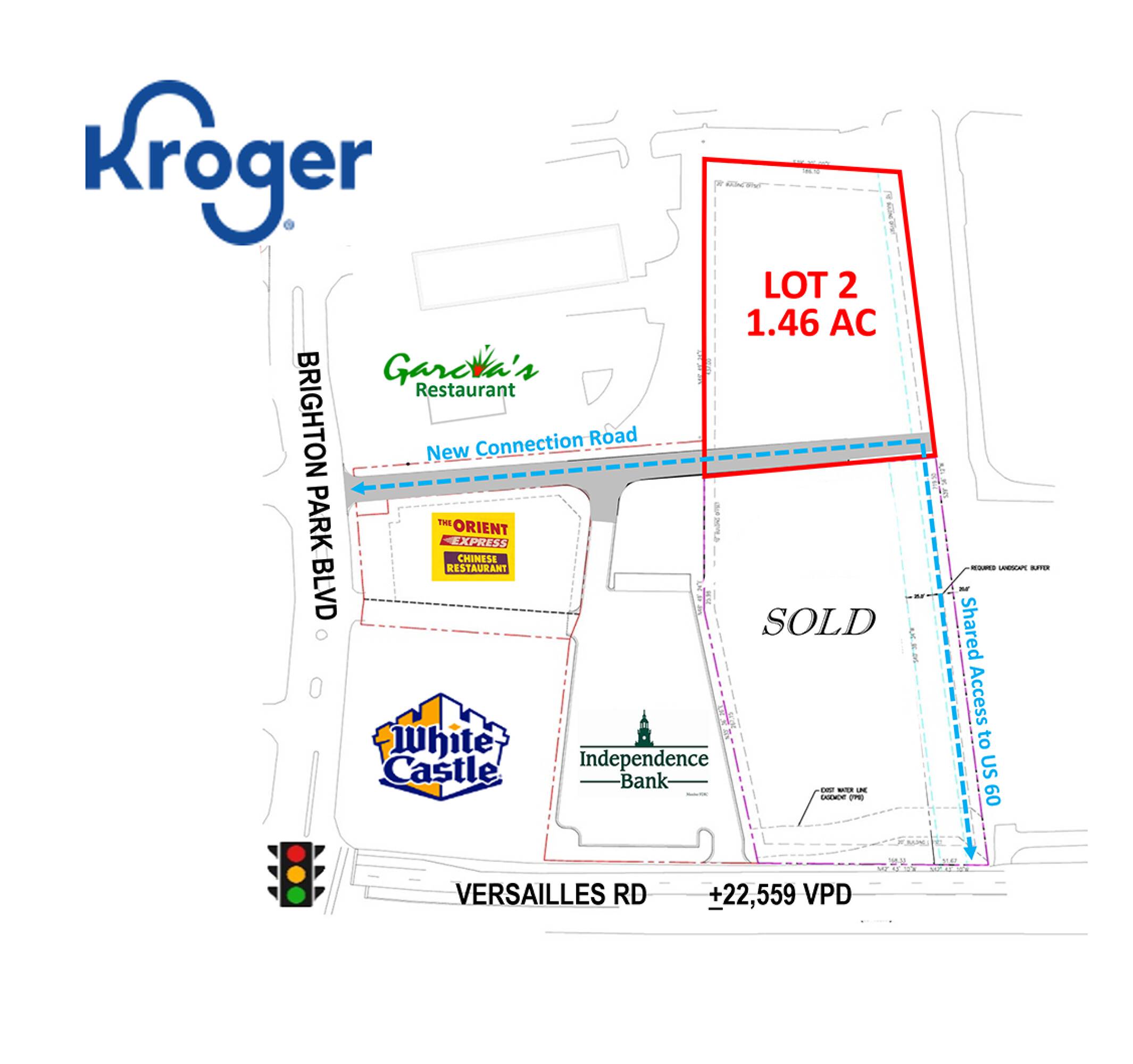 This property features 1.446 acres of commercial land available for sale. It is located on US 60 in Frankfort, adjacent to a Kroger Center, and approximately 1.5 miles from I-64. There is a proposed new connection to Kroger Access Road and a signalized intersection.