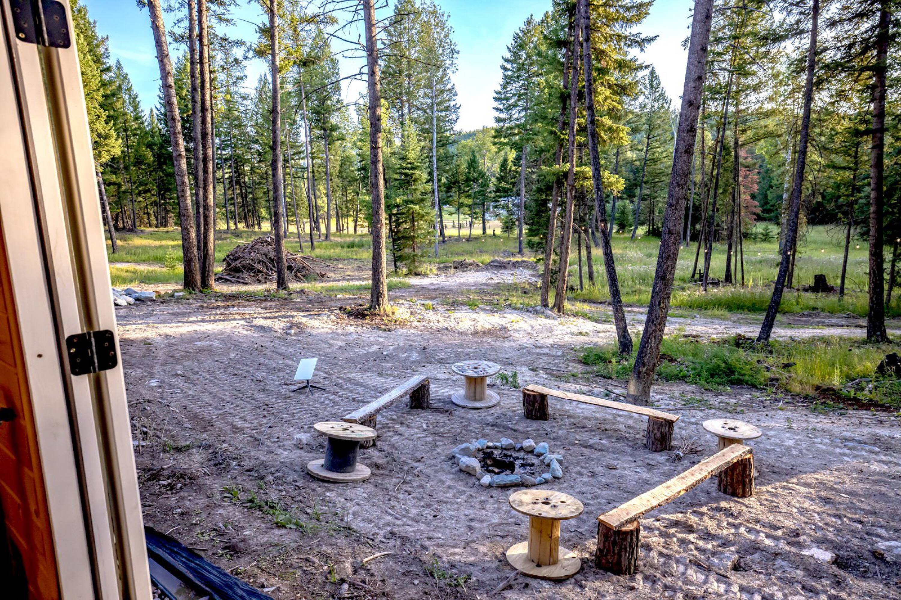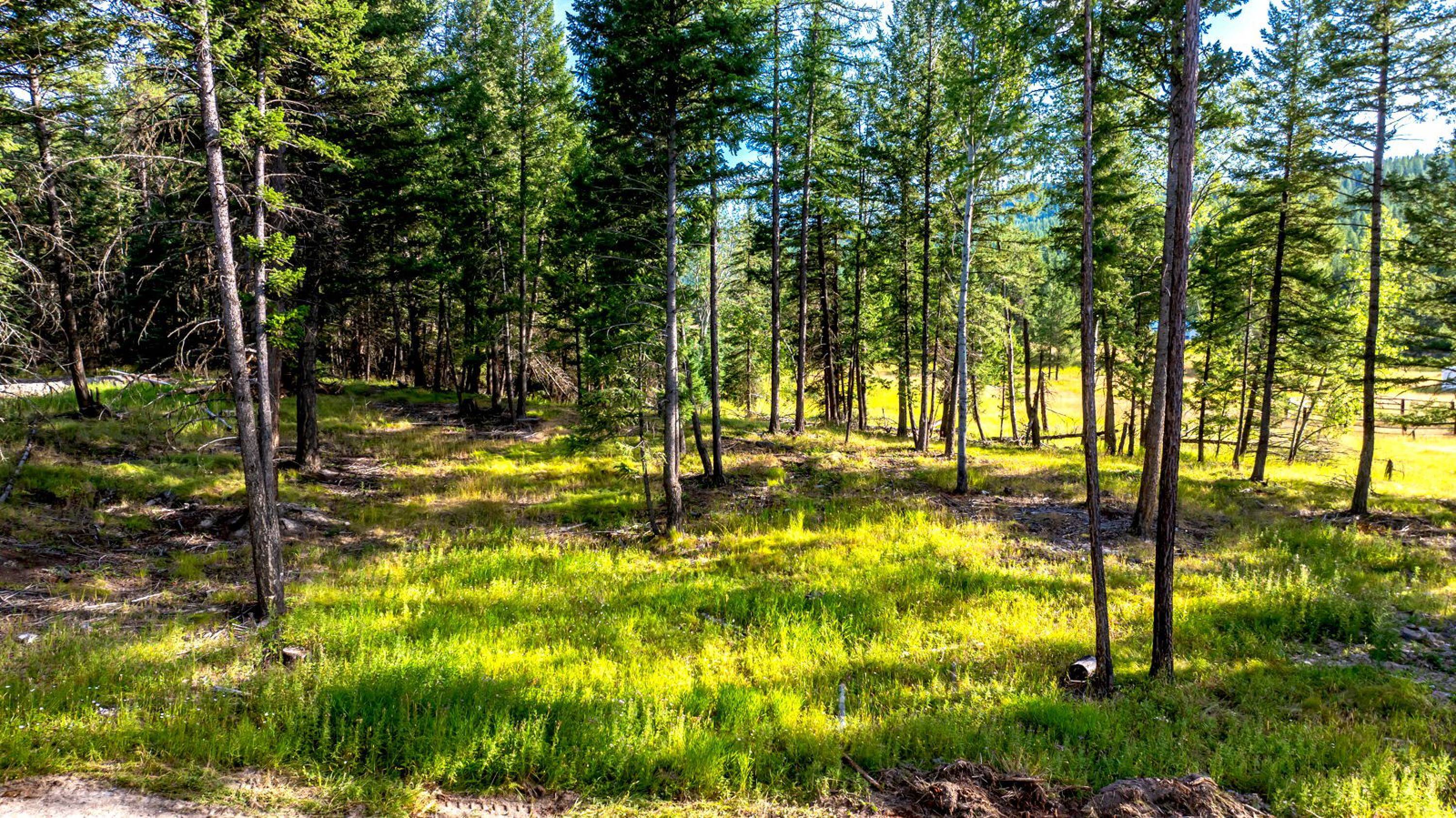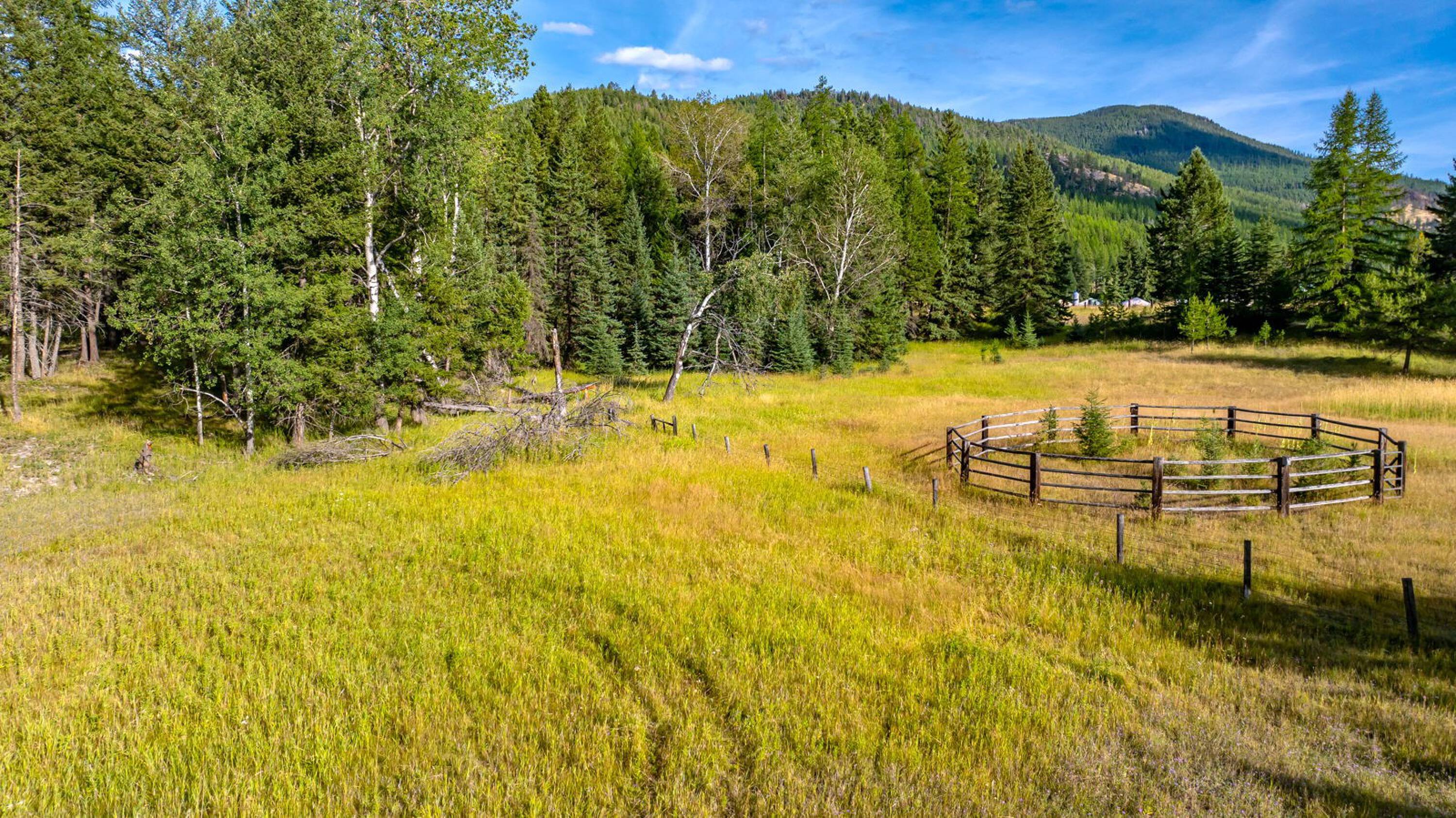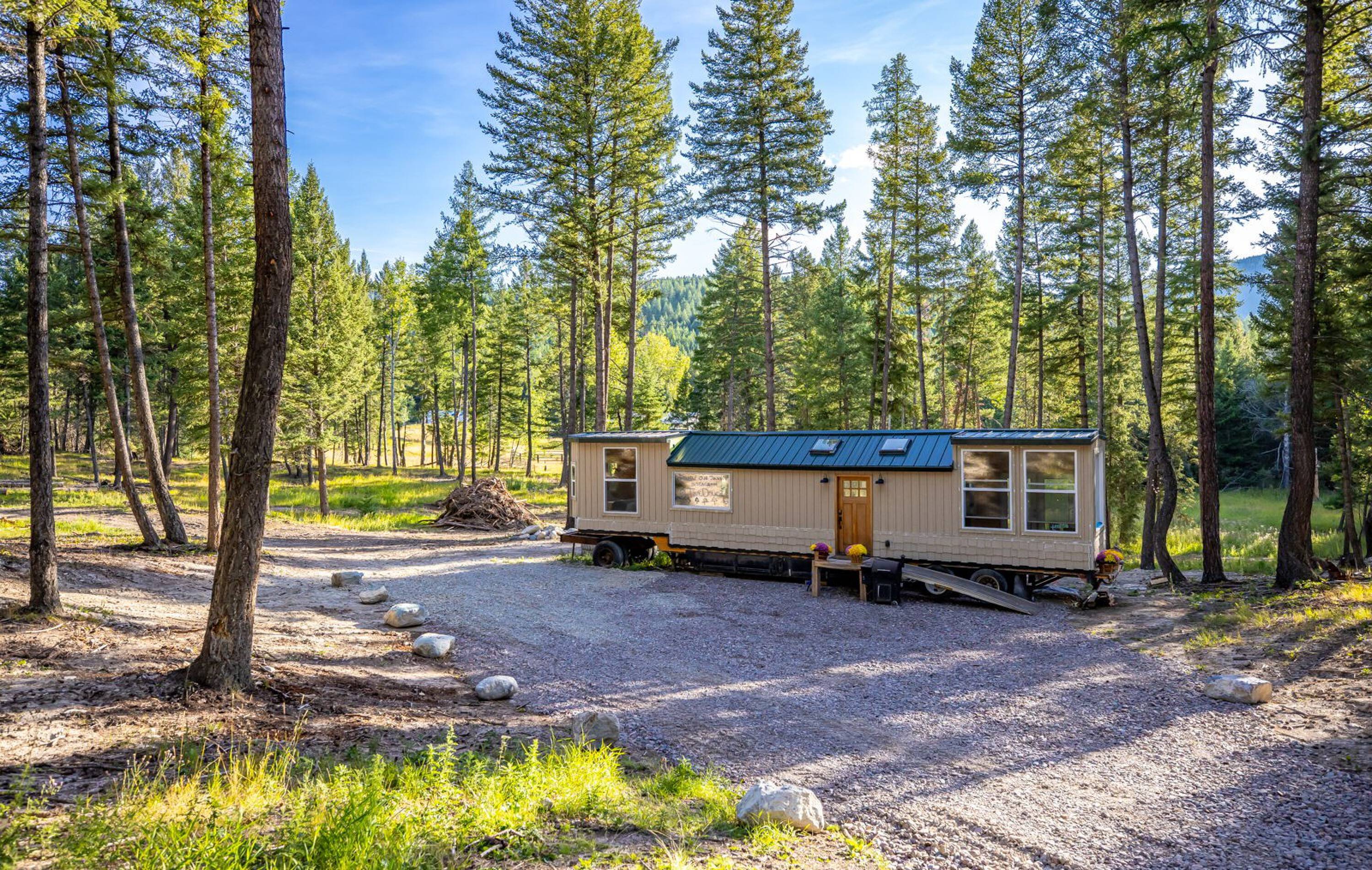 This 10-acre property features lush meadows and mature timber. A completed tiny home is included. The private setting contains two wells, a pond, and a firepit area. It is located approximately 20 minutes from Kalispell. A new 3-bedroom septic system has been installed, which can accommodate additional development beyond the existing one-bedroom tiny home.