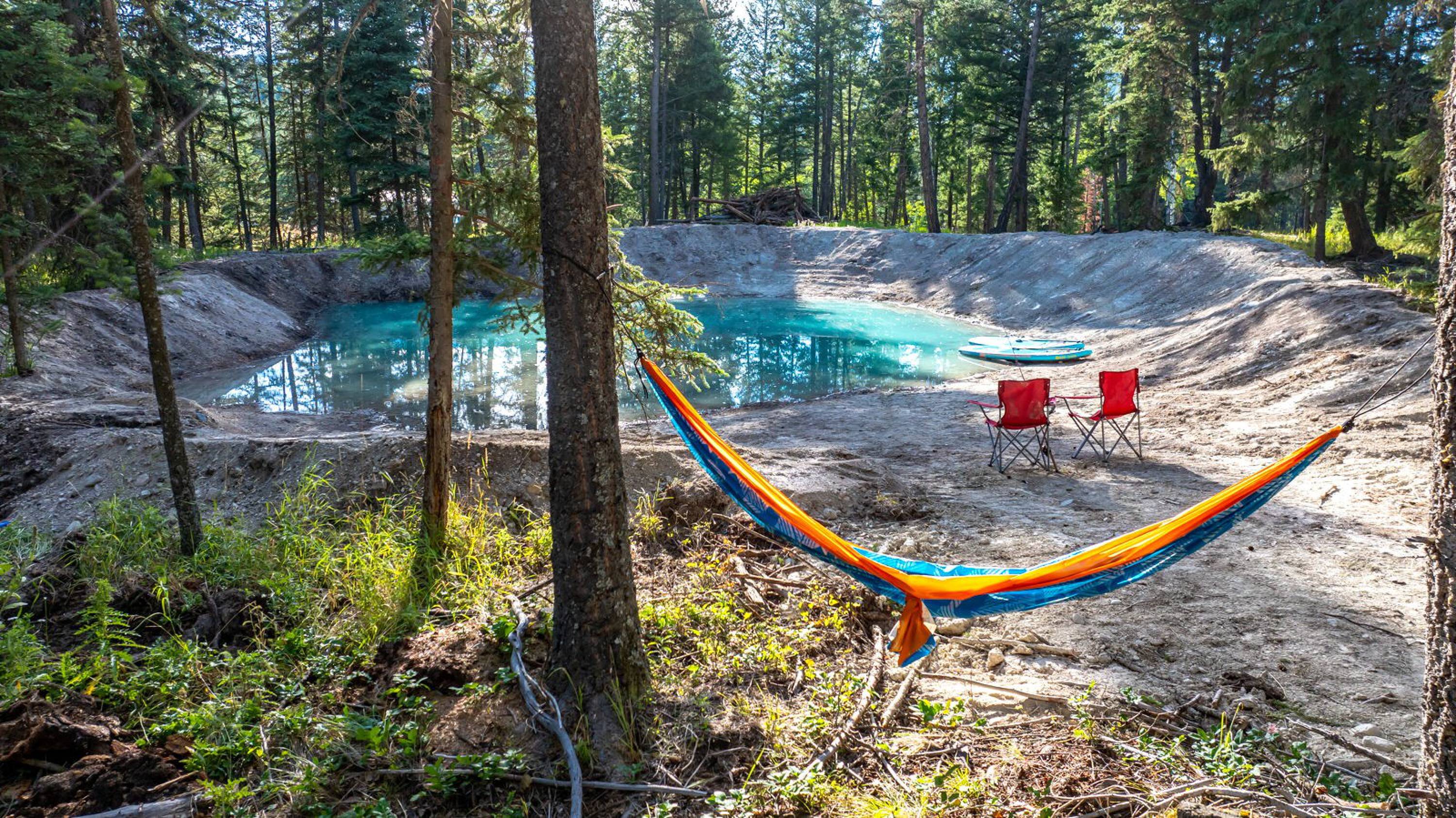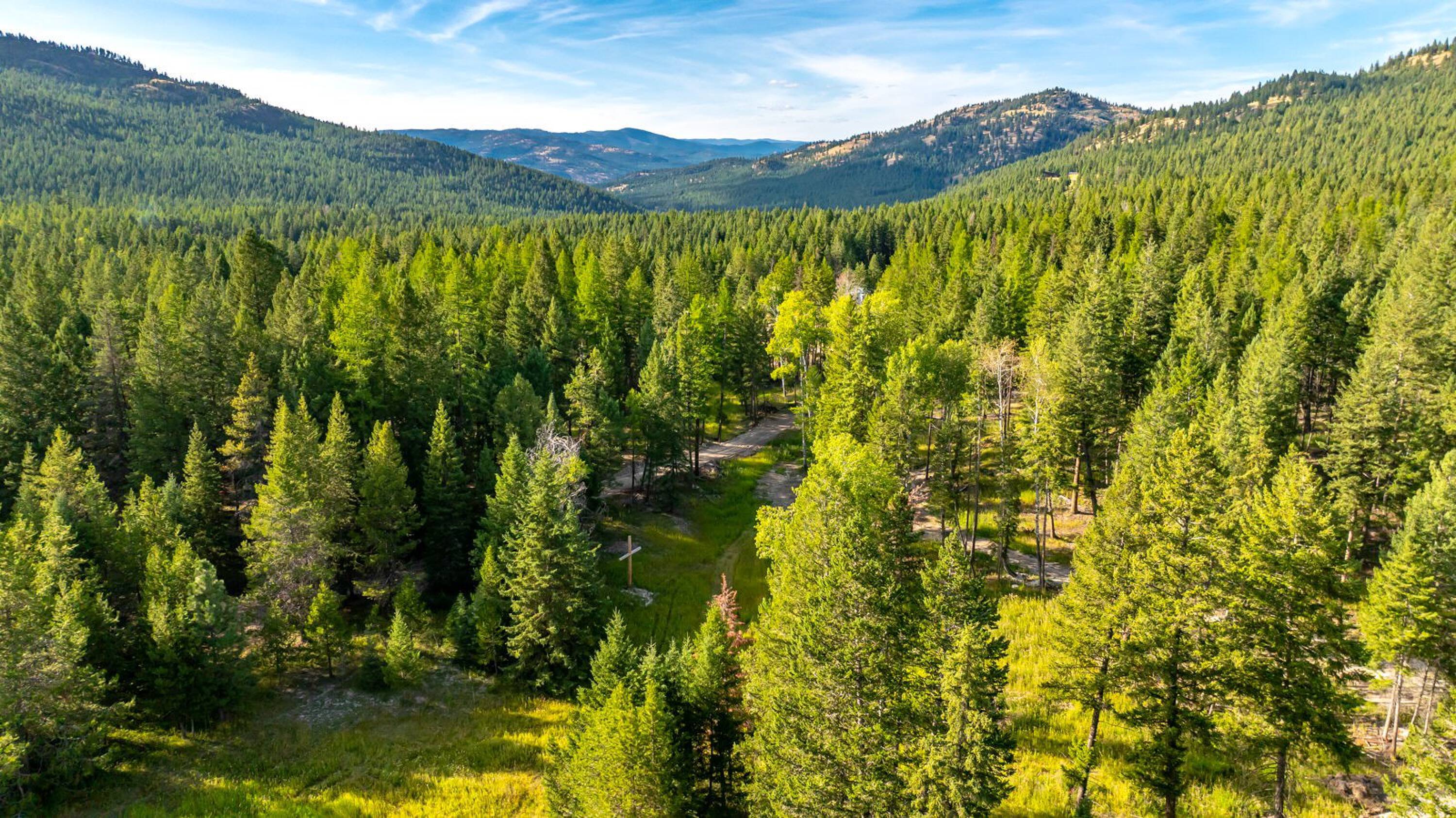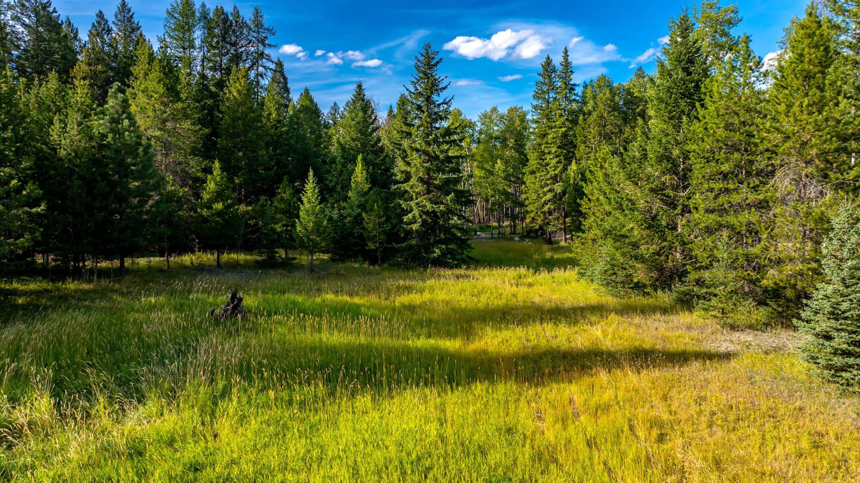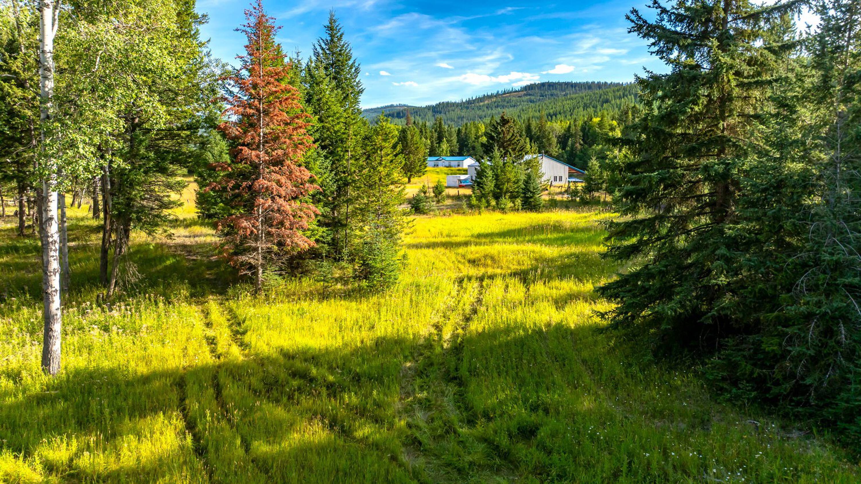 This 10-acre property features lush meadows and mature timber. A completed tiny home is included. The private setting contains two wells, a pond, and a firepit area. It is located approximately 20 minutes from Kalispell. A new 3-bedroom septic system has been installed, which can accommodate additional development beyond the existing one-bedroom tiny home.
