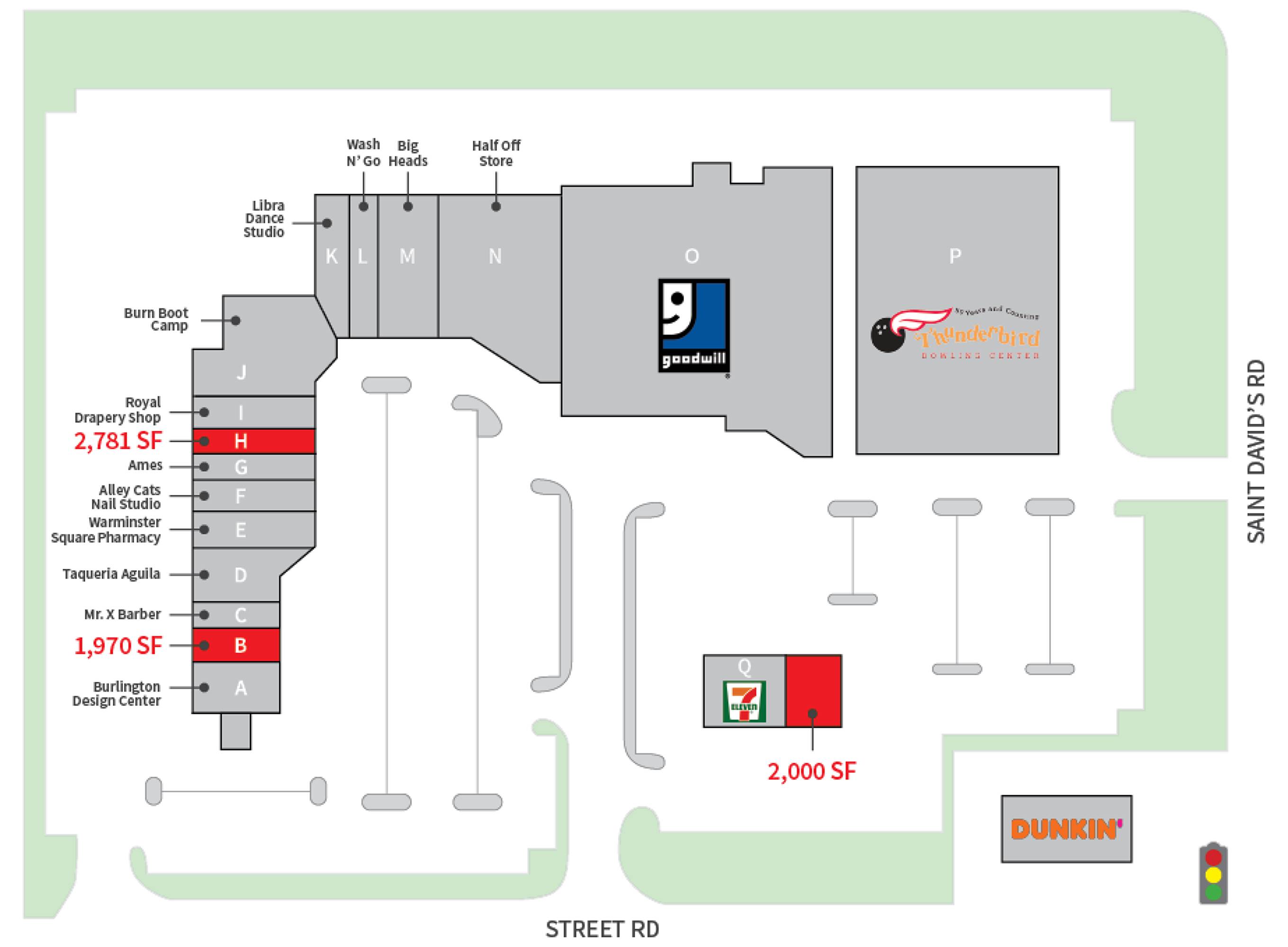 Available for lease are inline retail spaces of approximately 1,970 square feet and 2,781 square feet, along with a potential 2,000-square-foot pad site. The property benefits from pylon signage and ample parking. Co-tenants include Goodwill, Half Off Store, Burn Boot Camp, 7-11, and Warminster Square Pharmacy. Situated at a signalized intersection, the location offers high visibility from Street Road and easy access to Easton Road (Rt. 611). The property is located 4 miles from I-276. Nearby tenants include Wegmans, Target, Lowe’s, Walmart, Home Depot, Giant, Aldi, and TJ-Maxx.