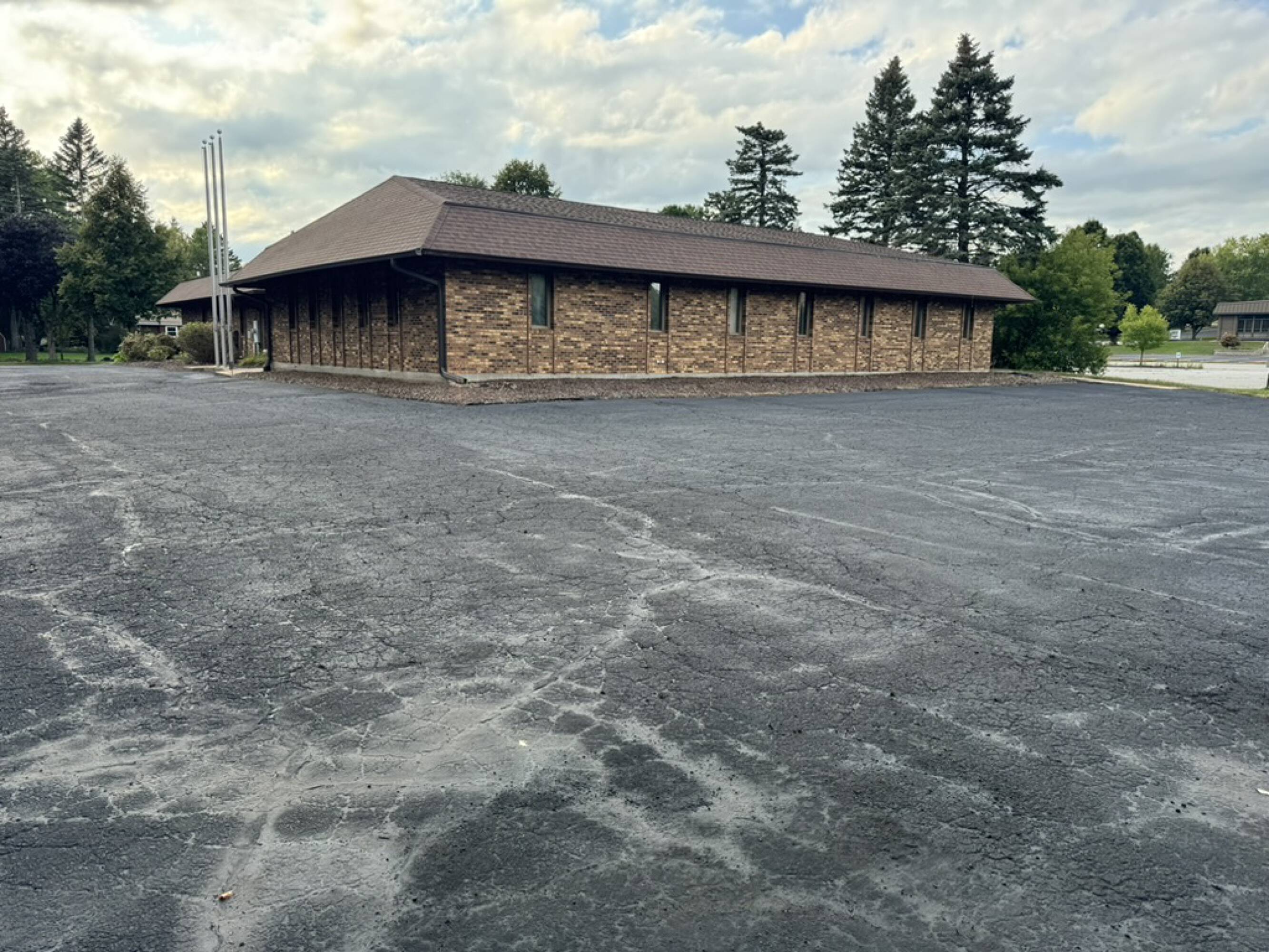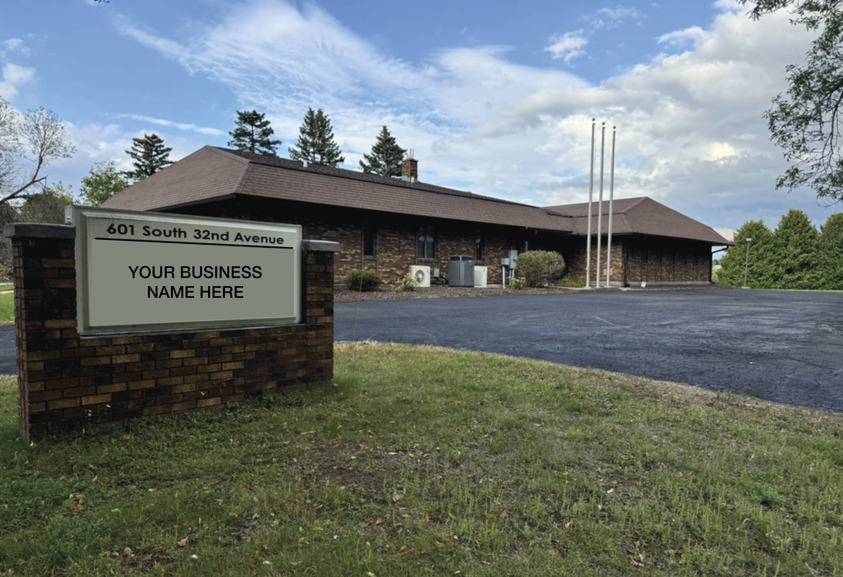 This 7,124 square foot office building offers multiple office opportunities with two potential entrances suitable for shared space arrangements. A secure, separate entrance provides access to the basement. The property features multiple secure offices. Its location provides easy highway access. Tenants have the opportunity for front monument sign placement. The building offers a corporate feel with flagpoles at the entrance.