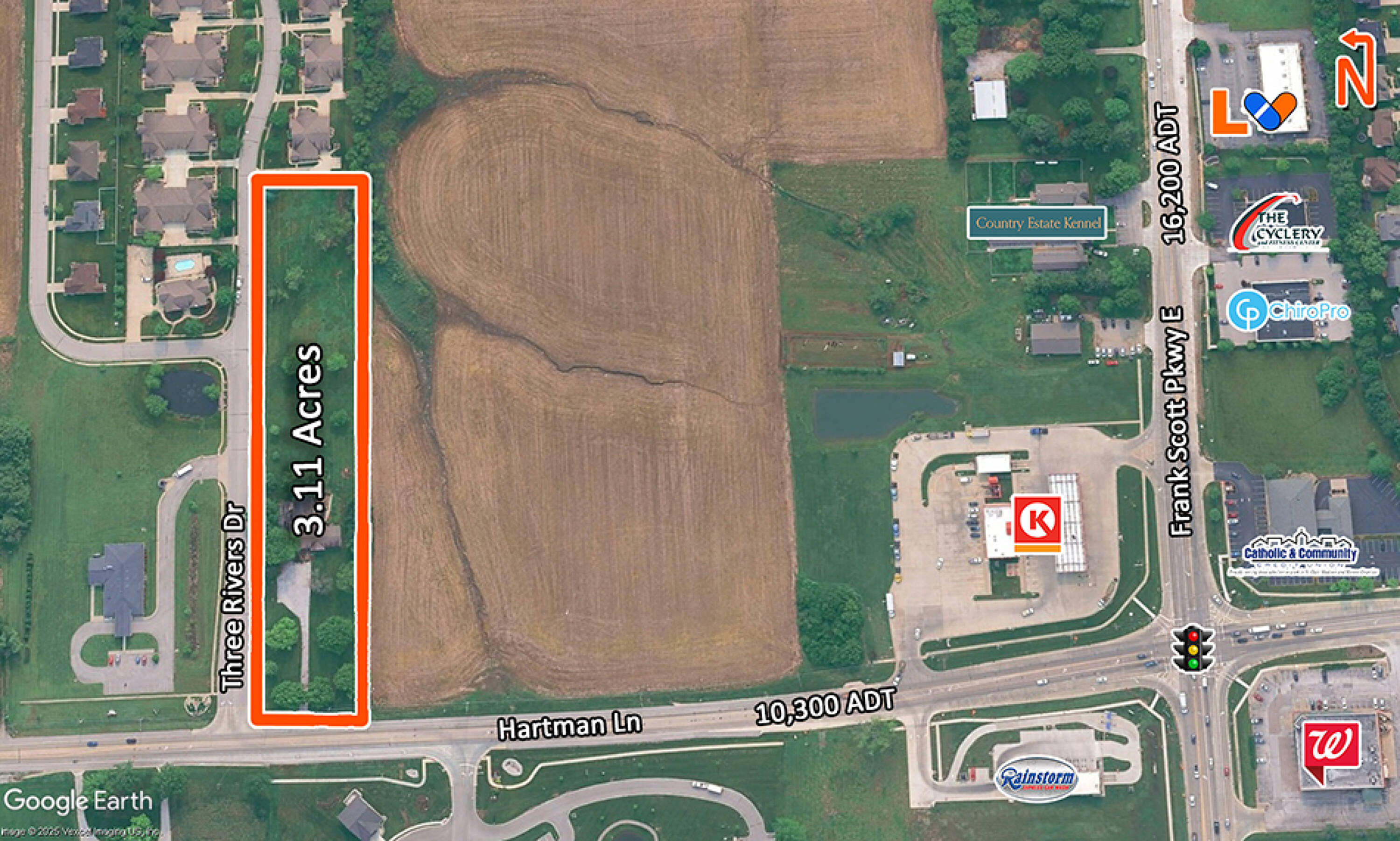 This 3.11-acre commercial land is available for sale in a heavily trafficked area with an average daily traffic count of 33,000. The site features 150 feet of frontage on Hartman Lane. Utilities are located on or adjoining the site. The property is situated on a corner lot and is surrounded by new commercial and residential developments, including single-family residences and multi-family housing. It is located one block north of the intersection of Frank Scott Parkway and Hartman Lane.