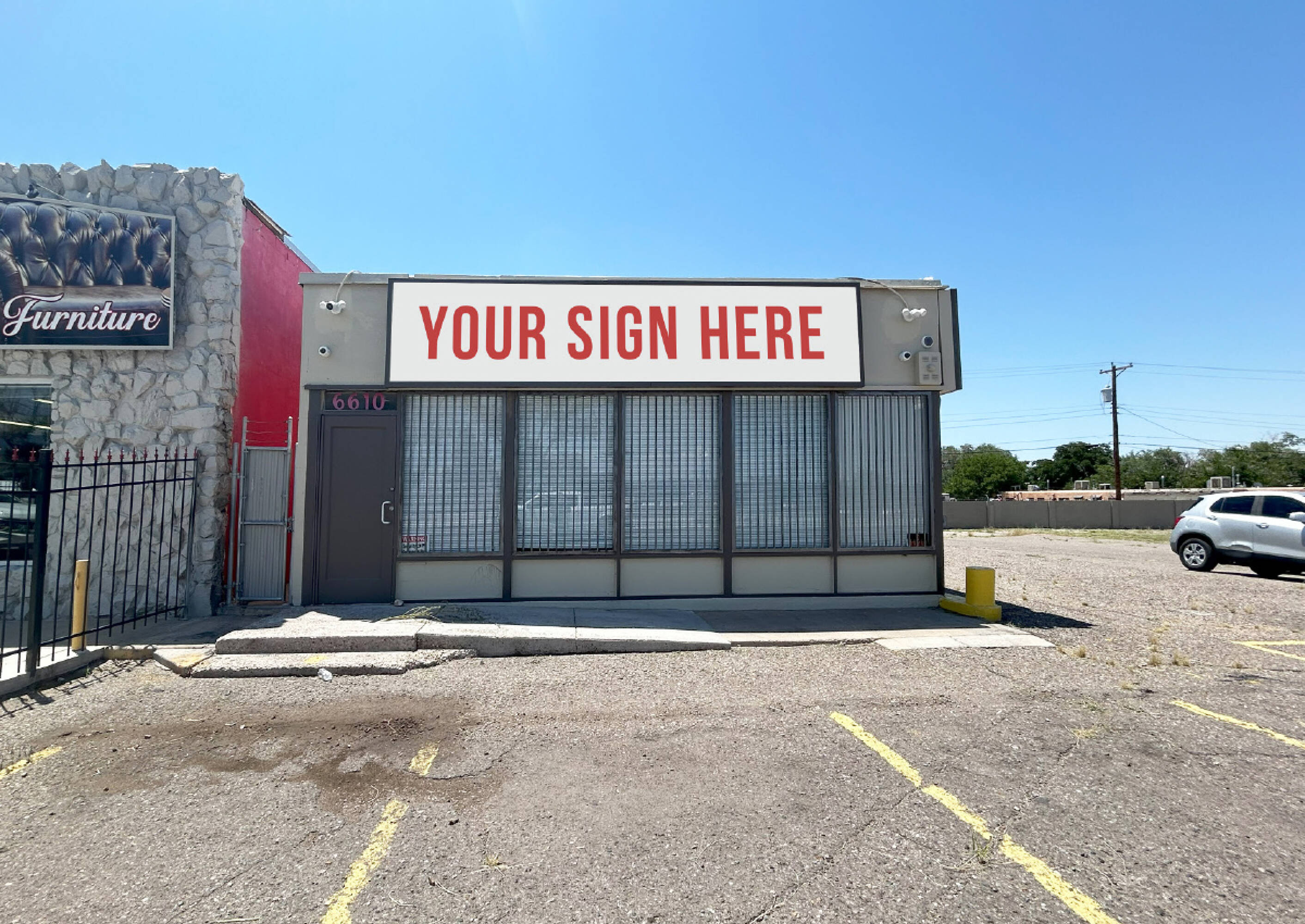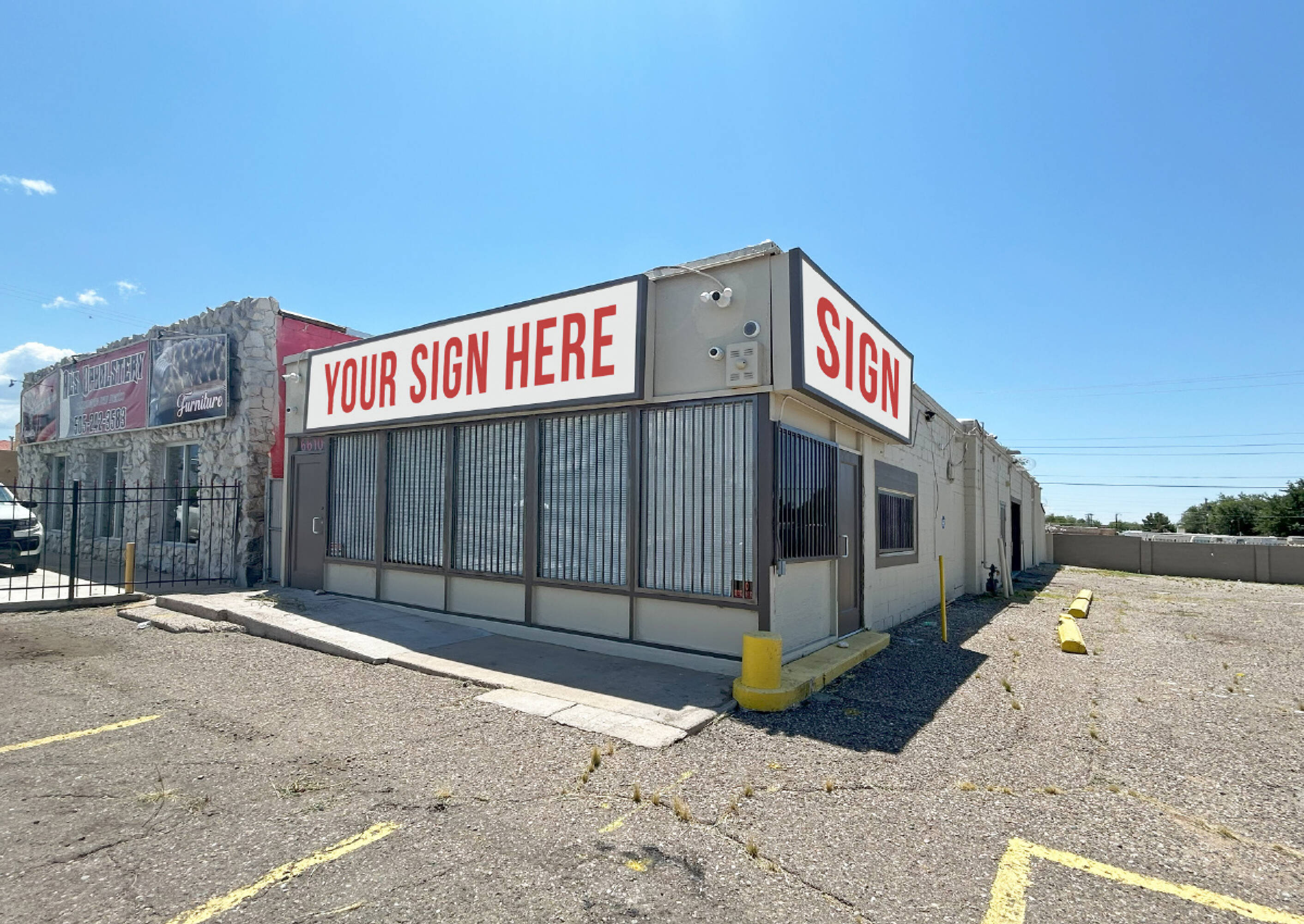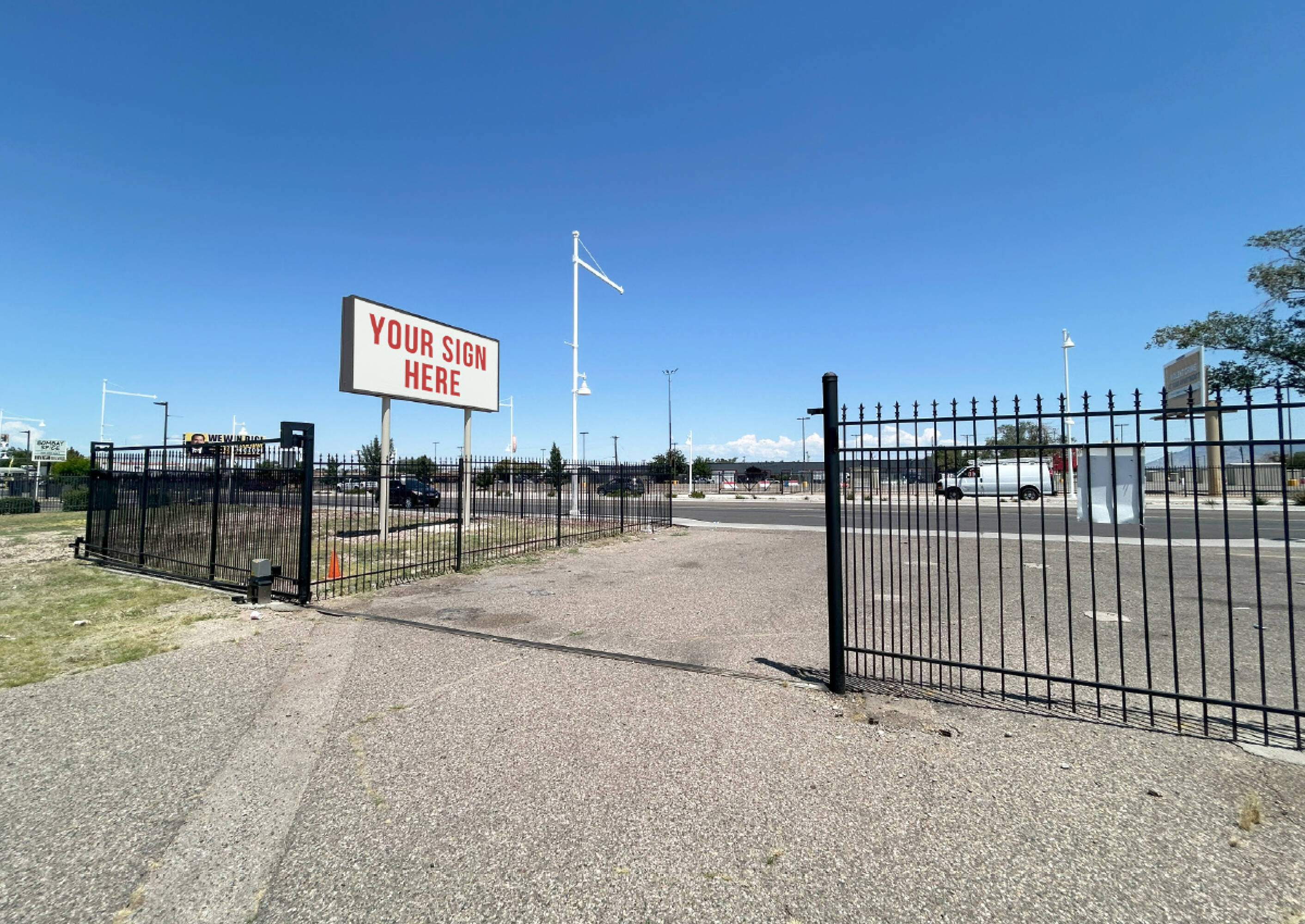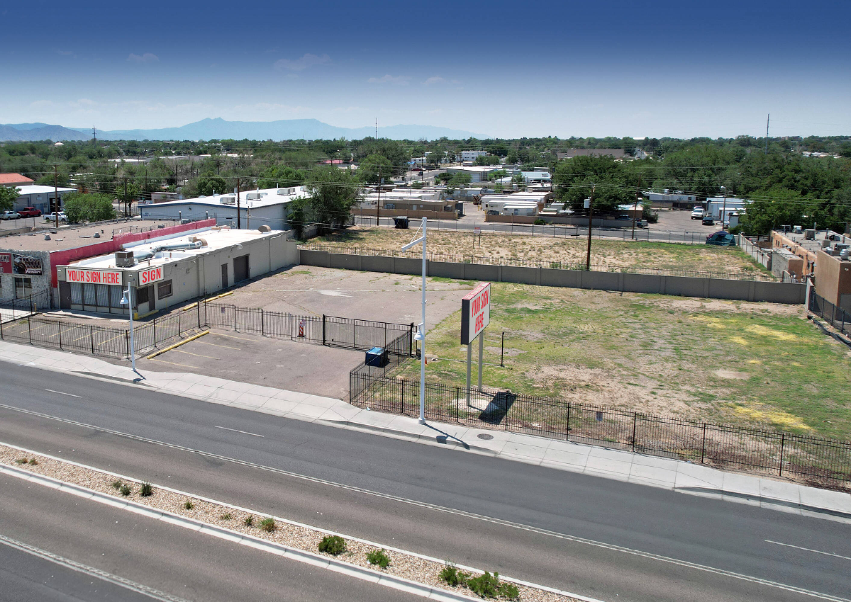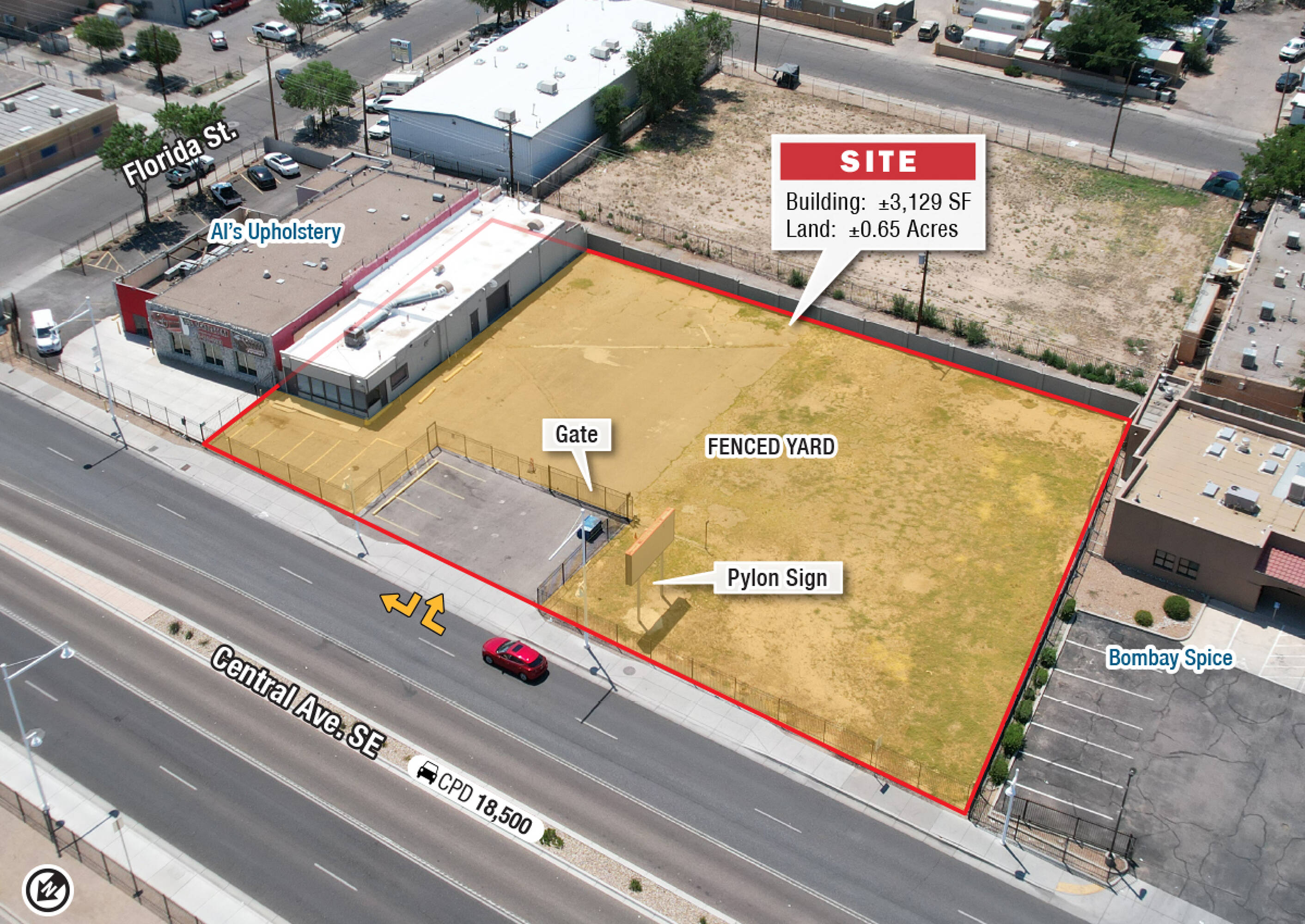 Commercial property with high visibility and fenced yard for sale.