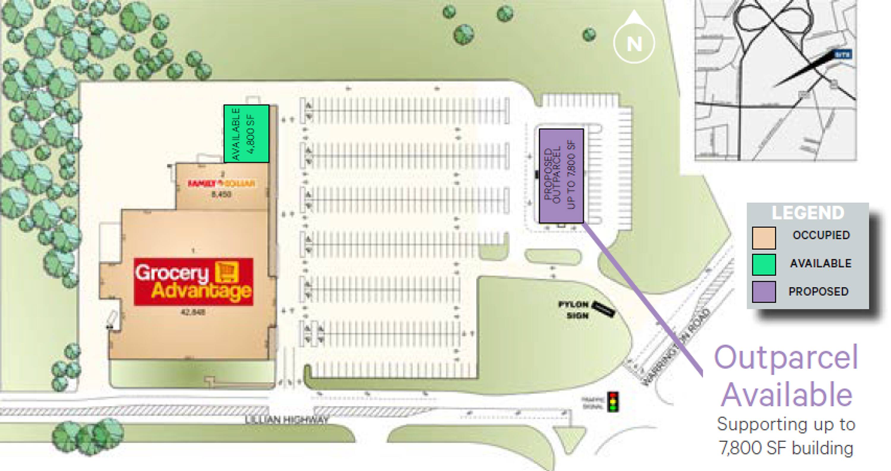This property features: High‑traffic location on Lillian Highway.; Fronting neighborhood discount grocery‑anchored shopping center.; Approximately 80,000 population within a 3‑mile radius.