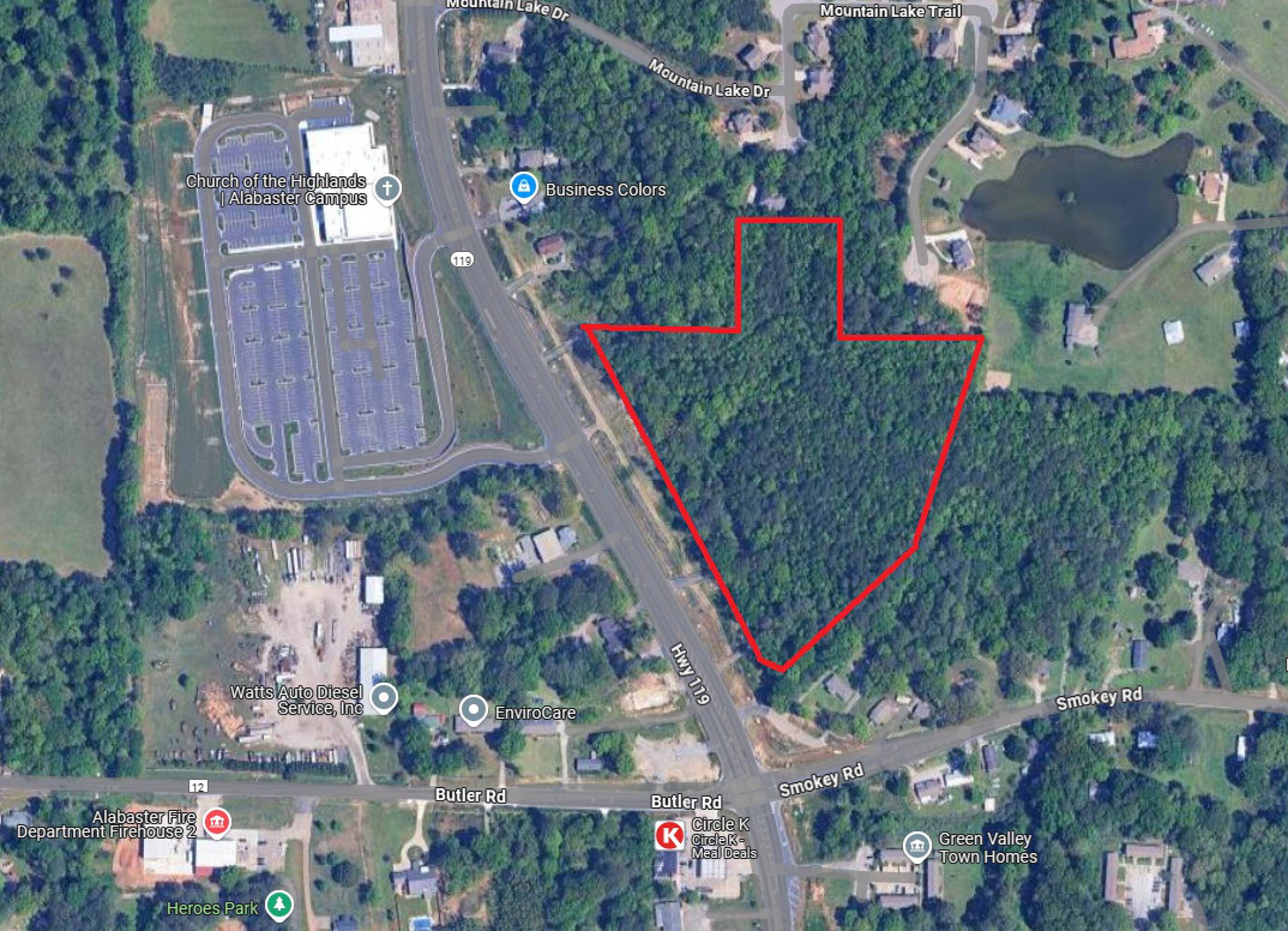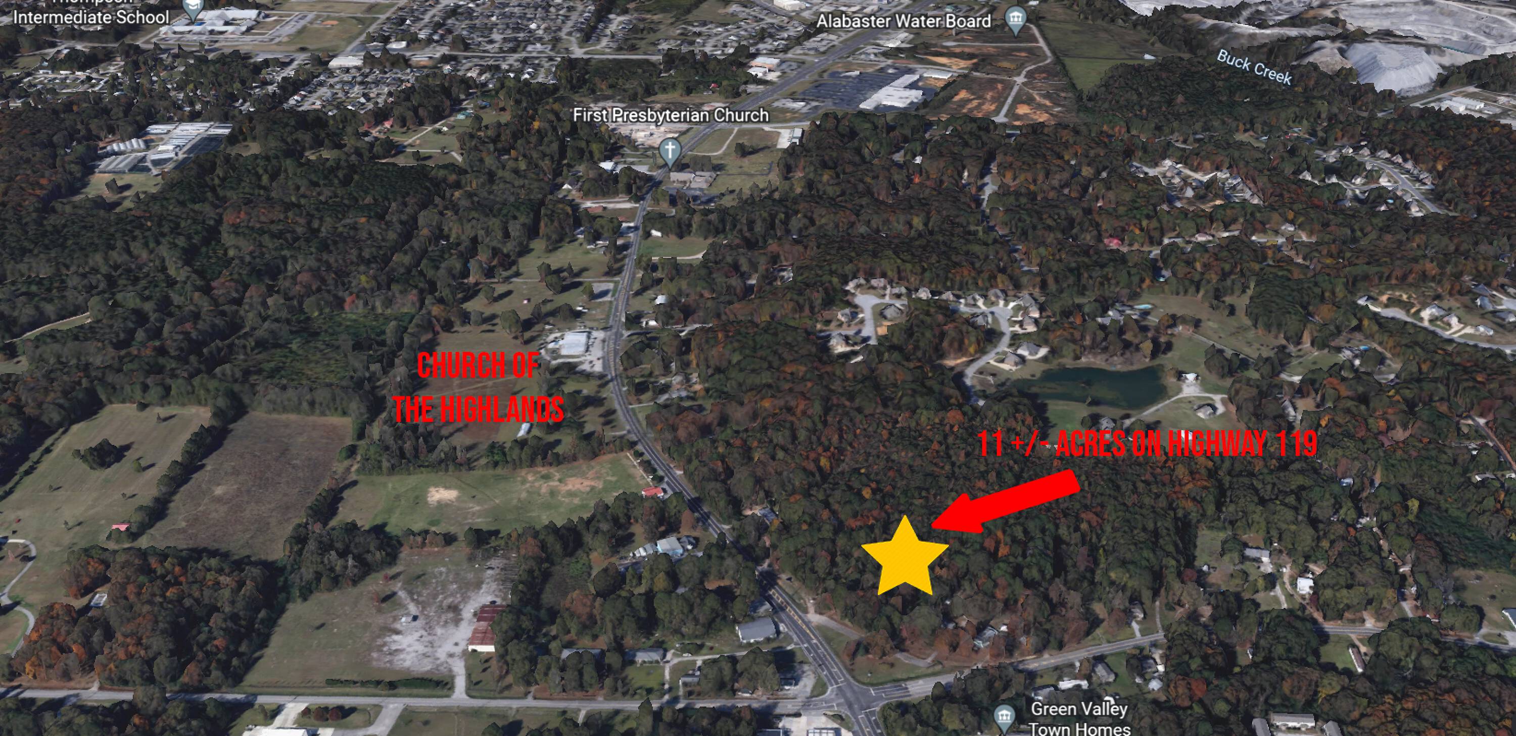 This 11-acre commercial land parcel is located in Alabaster and is zoned B-3. It features over 750 feet of frontage on Highway 119, situated across from Church of the Highlands. The nearby 2023 traffic count indicates 21,359 cars per day.