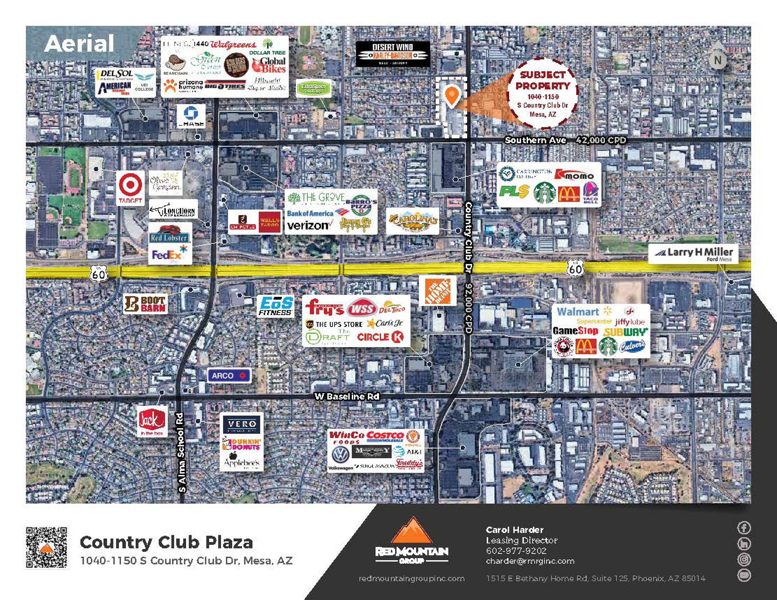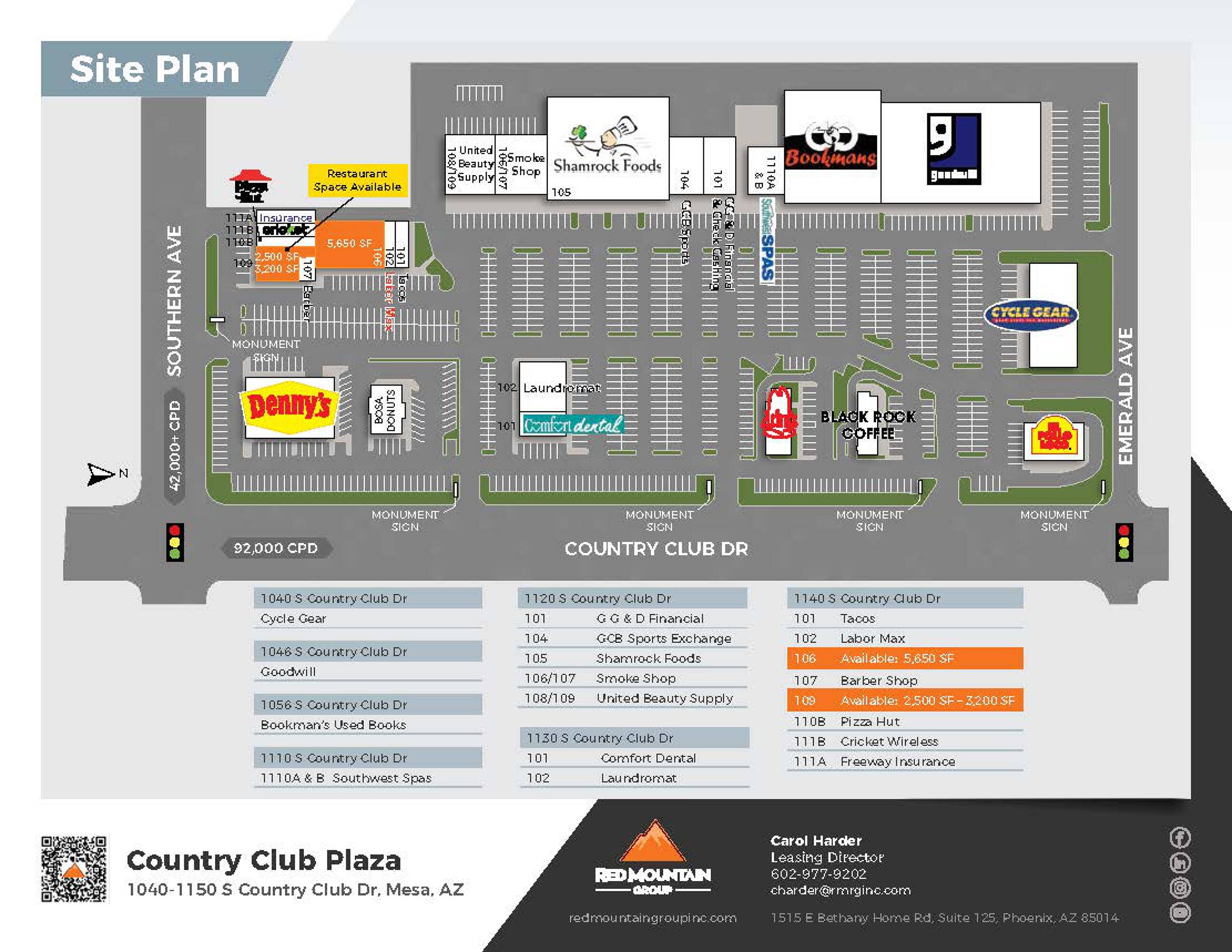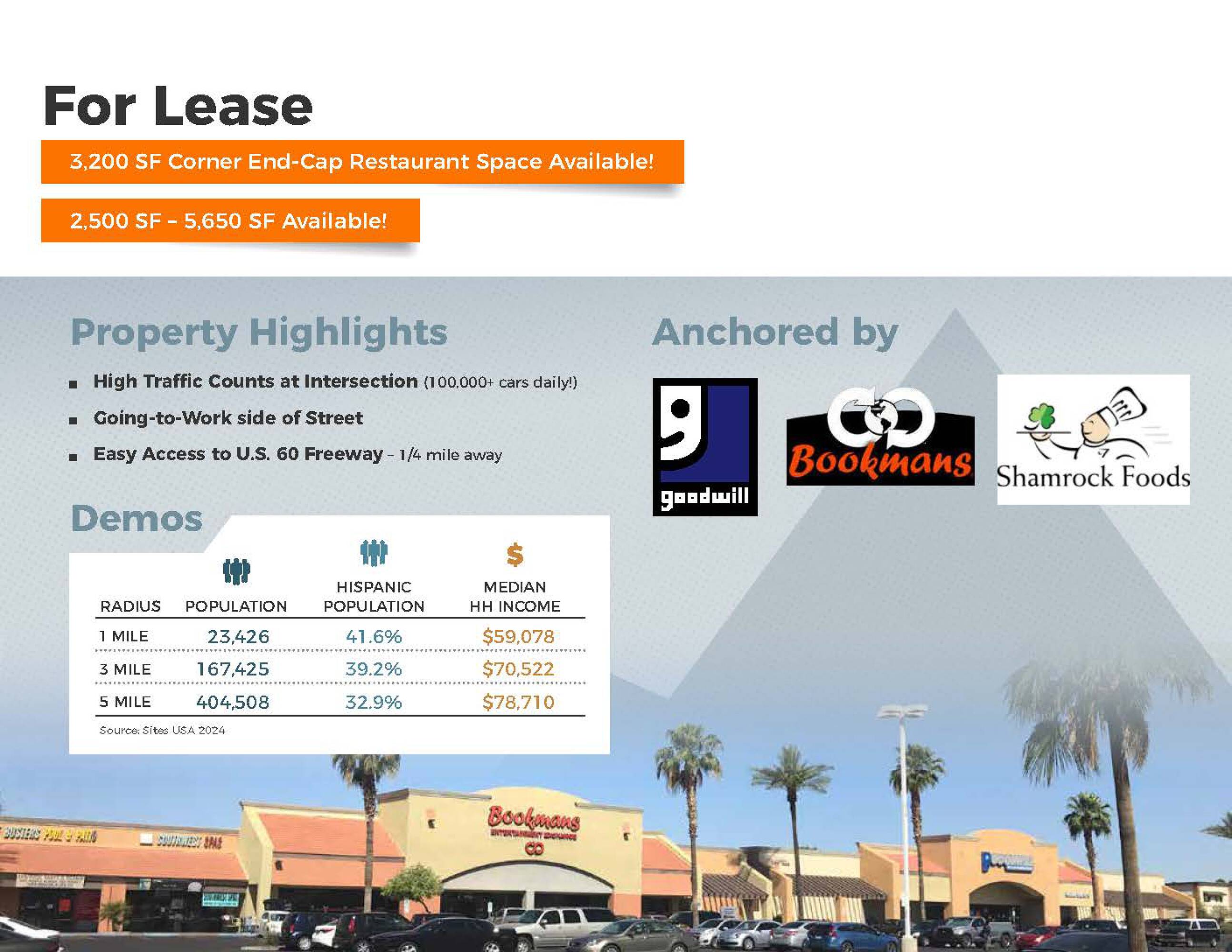 This property features: High Traffic Location: Situated at the intersection of West Southern Avenue & South Country Club Drive with 89,000 cars passing daily.; Corner End Cap: **2nd Generation Restaurant space on a corner end cap.**; Strong Co‑Tenancy: Anchored by Goodwill and Bookman's, with other major retailers including Cycle Gear, Denny's, El Pollo Loco, Arby's and Pizza Hut.