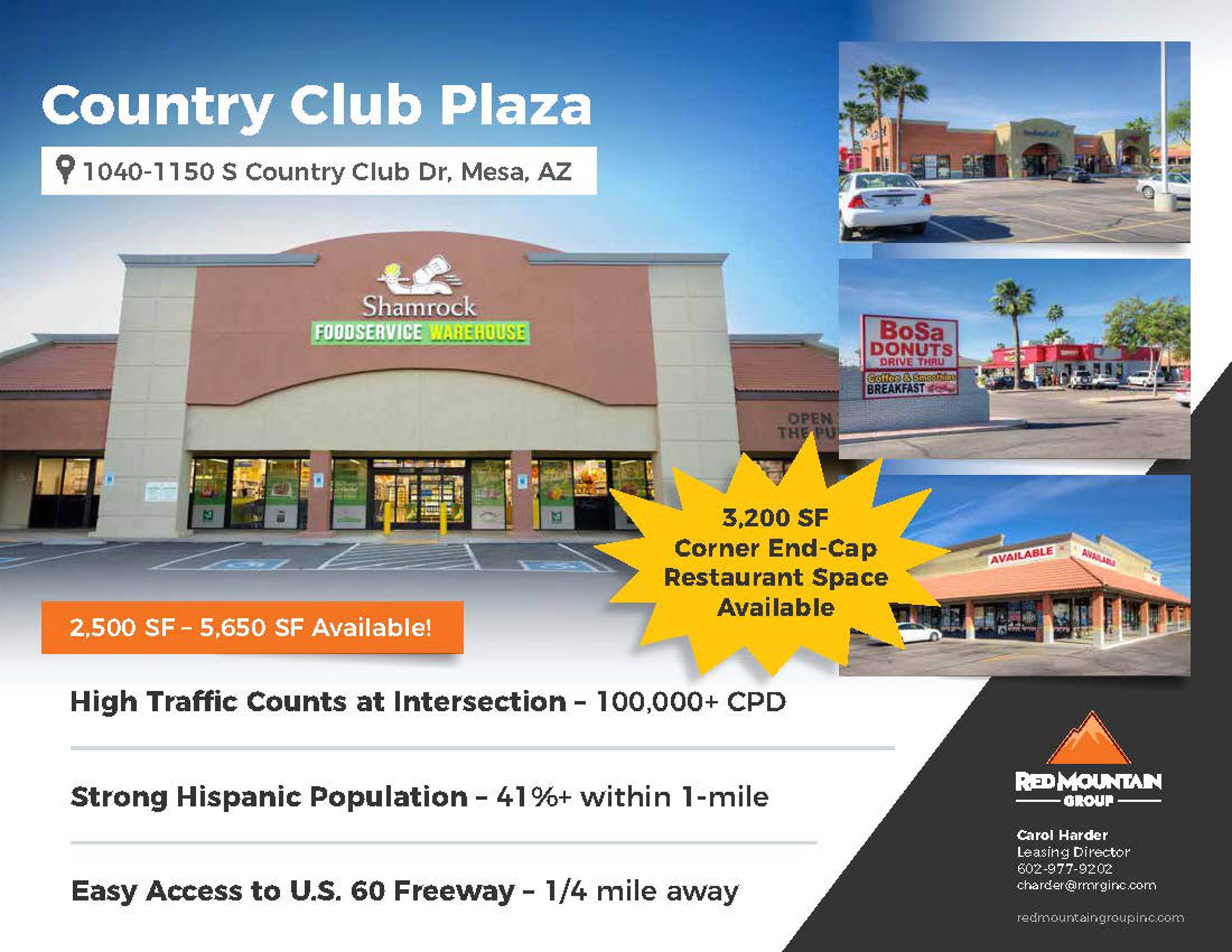 This is a 2nd generation restaurant space located on a corner end cap at the intersection of West Southern Avenue and South Country Club Drive in Mesa, Arizona. The location benefits from high traffic counts of 89,000 cars daily and easy access to US 60 Freeway. The available space is between 2,500 to 3,000 square feet on the pad. Country Club Plaza is co-tenanted by Bookmans, Goodwill, and Shamrock Foods. Other major retailers in the center include Cycle Gear, Denny's, El Pollo Loco, Arby's and Pizza Hut. The property is located on the going-to-work side of the street.
