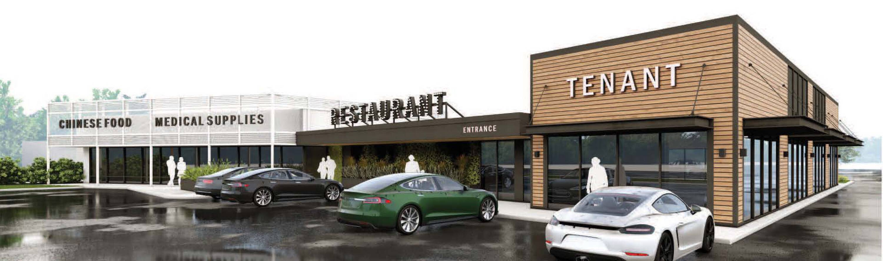 Retail spaces for lease in renovated Bellaire Triangle Shopping Center.