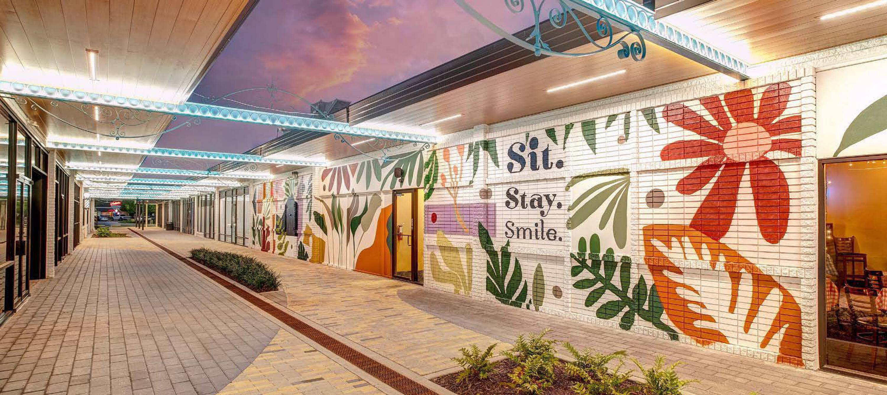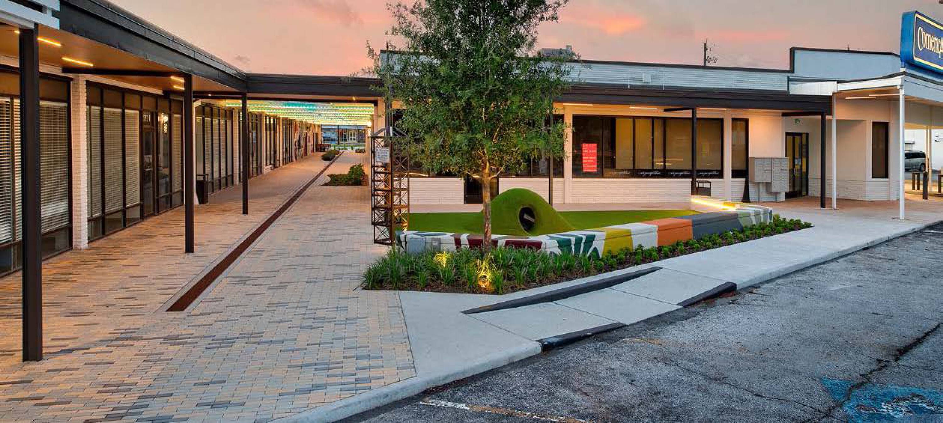 This property features: Multi‑phase renovation underway, blending original design elements like steel columns and brick parapet walls with modern updates.; Restoration of open‑air arcade with comfortable seating and natural light, creating a family‑friendly gathering space.; Arcade transforms into an inviting evening spot with twinkling lights.