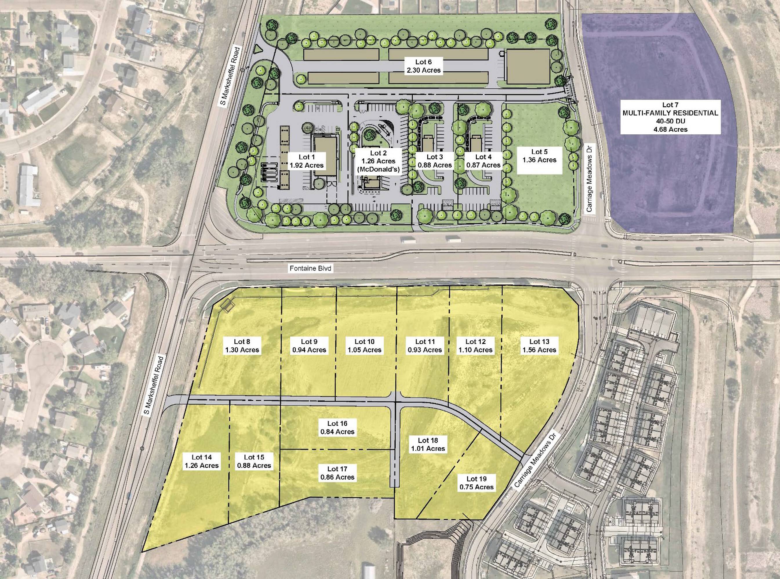 The property consists of 19 separate lots ranging in size from 0.75 to 4.68 acres. The pad sites depicted are a concept plan only and can be sized appropriately pursuant to buyer’s or tenant’s individual needs. The property is located at the NEC & SEC of Marksheffel Rd & Fontaine Blvd in Security-Widefield, CO 80925.