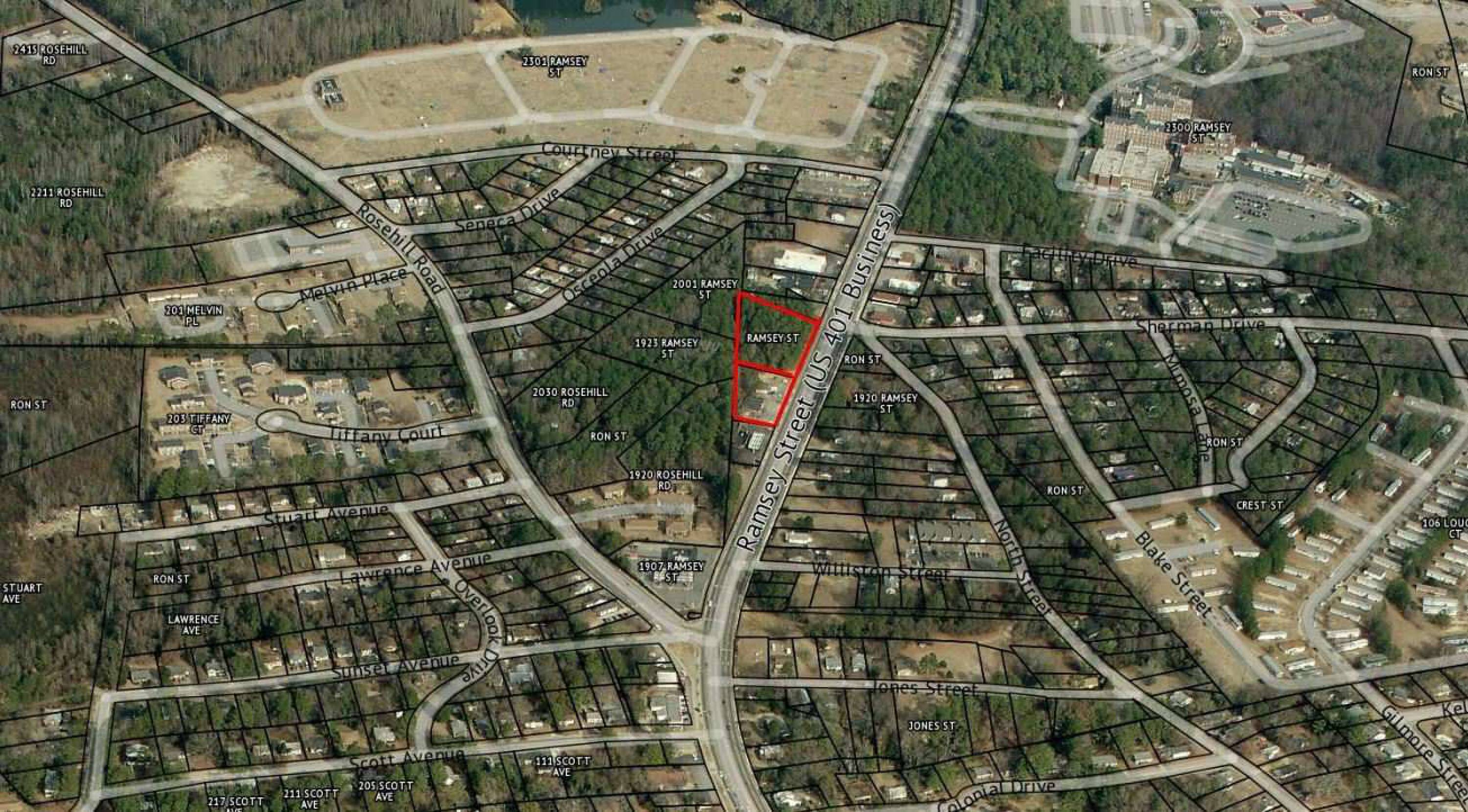 The Ramsey Street property includes two parcels totaling 1.77 acres. One parcel at 1917 Ramsey encompasses 0.64 acres, while the adjacent parcel measures 1.13 acres. The 0.64-acre parcel contains two structures. One building is approximately 2300 square feet with an open-space design, an HVAC system, and two bathrooms. The second building is approximately 720 square feet with an HVAC system and a single bathroom. The commercial property is located near downtown Fayetteville, close to the VA Hospital and the MLK Freeway. The local population within a 3-mile radius is 43,240 residents. The nearby MLK Freeway provides transportation and connectivity. This property is positioned to meet community needs and capitalize on healthcare-related demand in the area.
