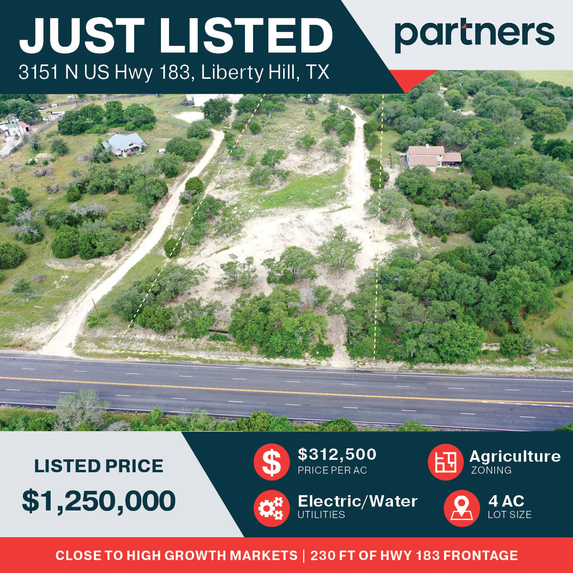 This property is located 3 minutes from the Toll 183 terminus, 10 minutes from Georgetown, 15 minutes from Cedar Park, and 45 minutes from Austin. Electric and water utilities are available on-site. The toll road was expected to be completed in Spring 2023.