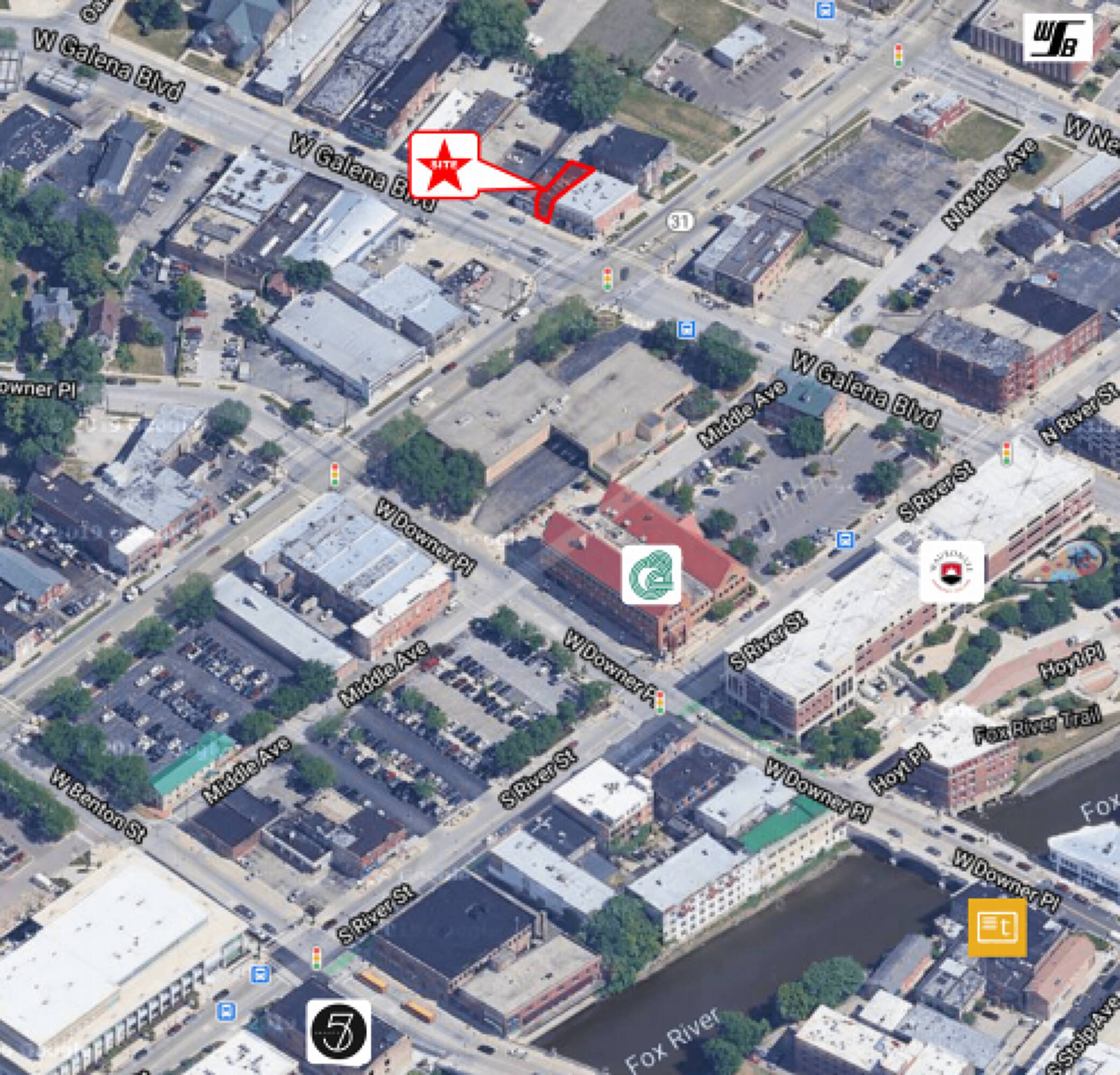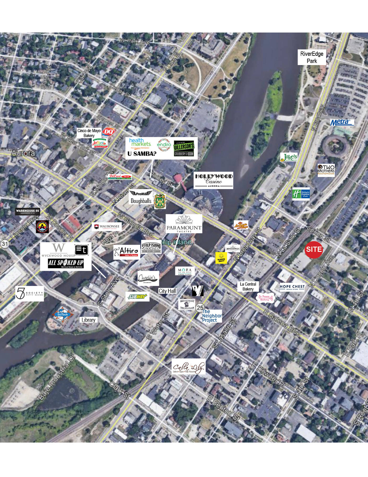 This 1,136-square-foot retail space is located next to the Aurora Transit Center, the last stop of the Metra train to and from Chicago. The property is less than a quarter-mile from Riveredge Park, Aurora’s outdoor music venue, Hollywood Casino, and the Paramount Theater. This location offers convenient access to transportation and entertainment.