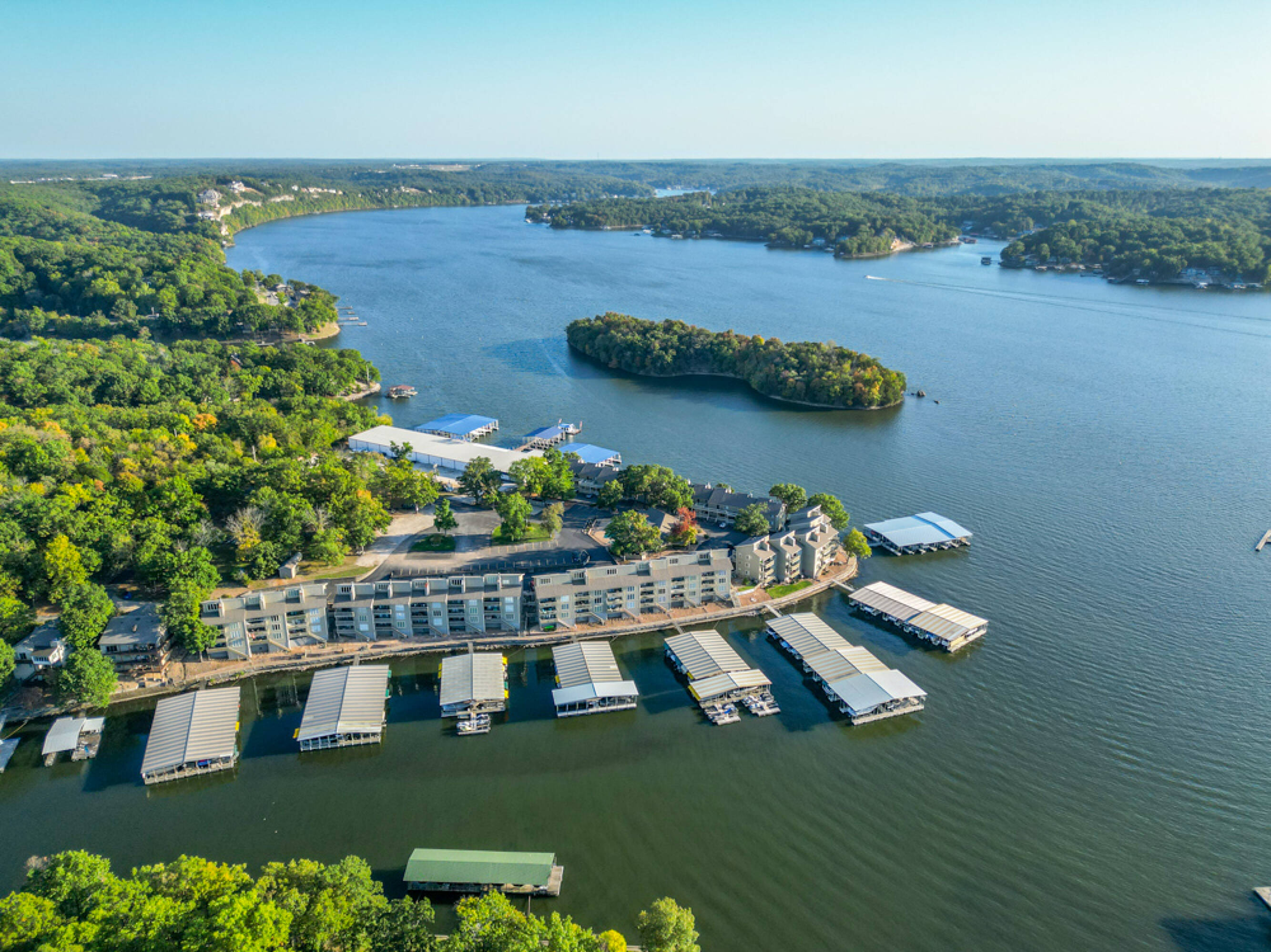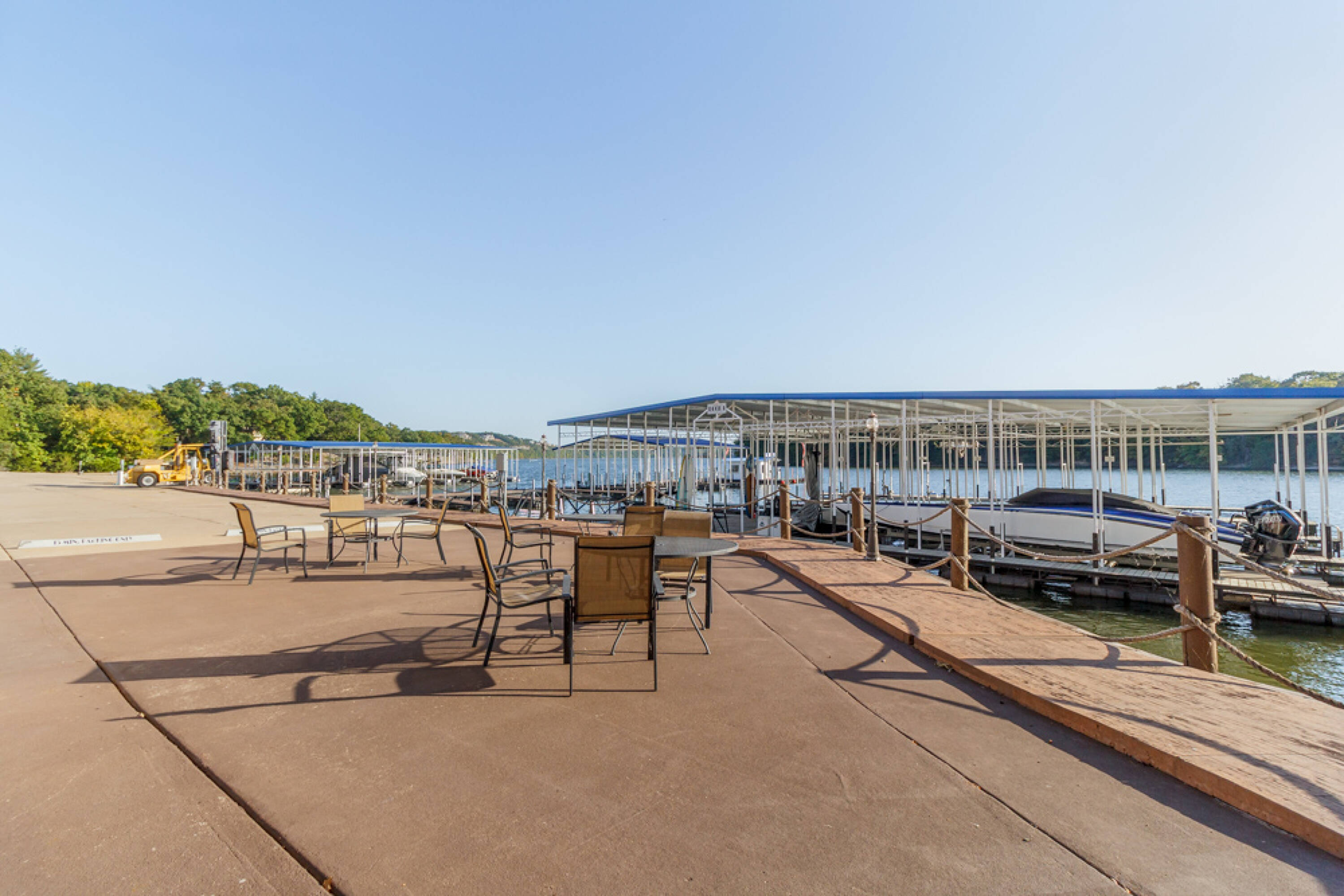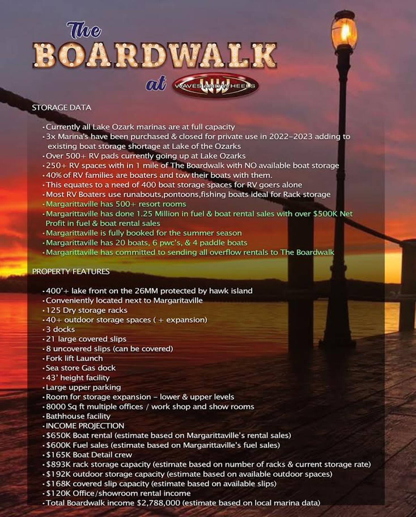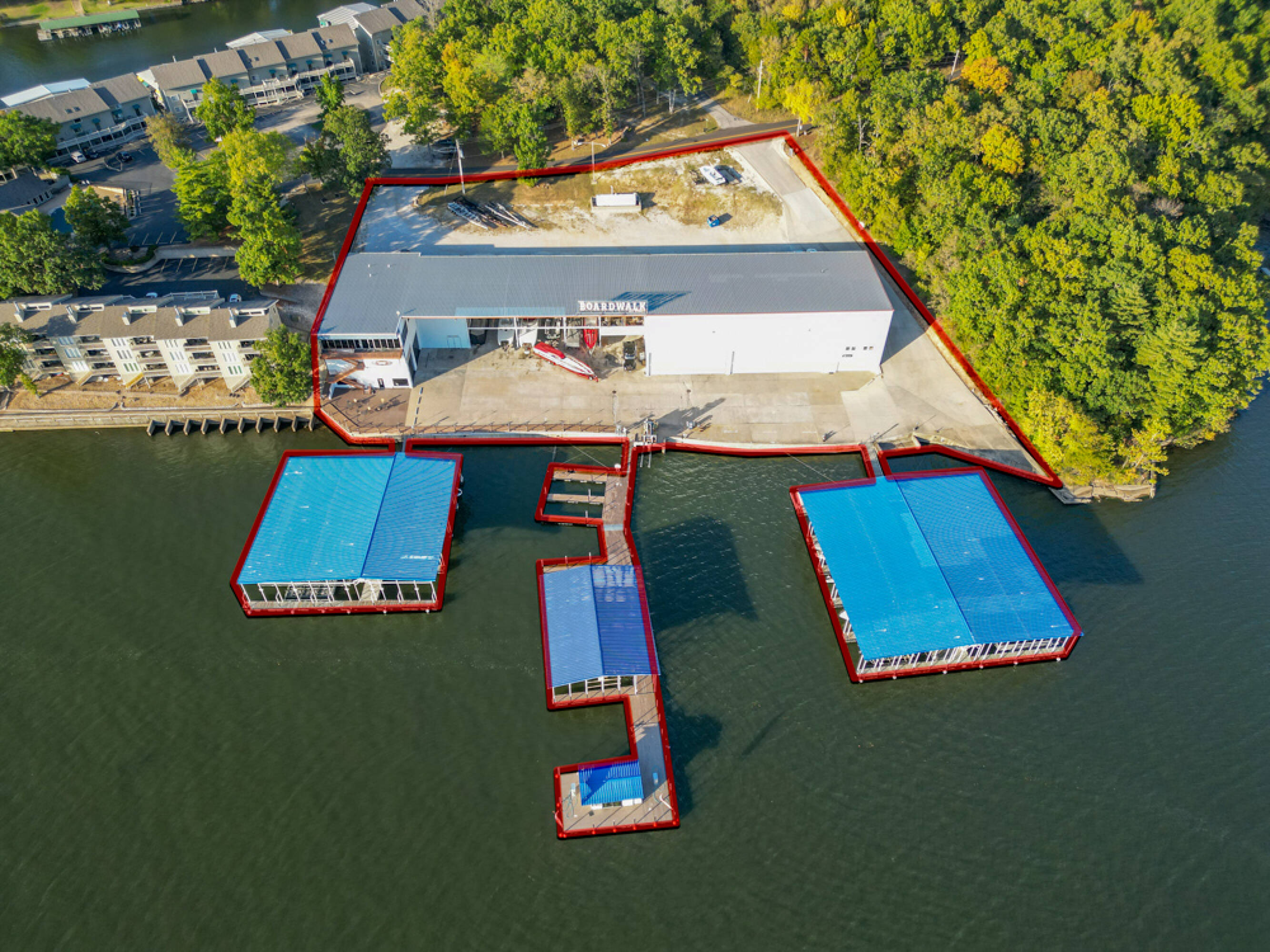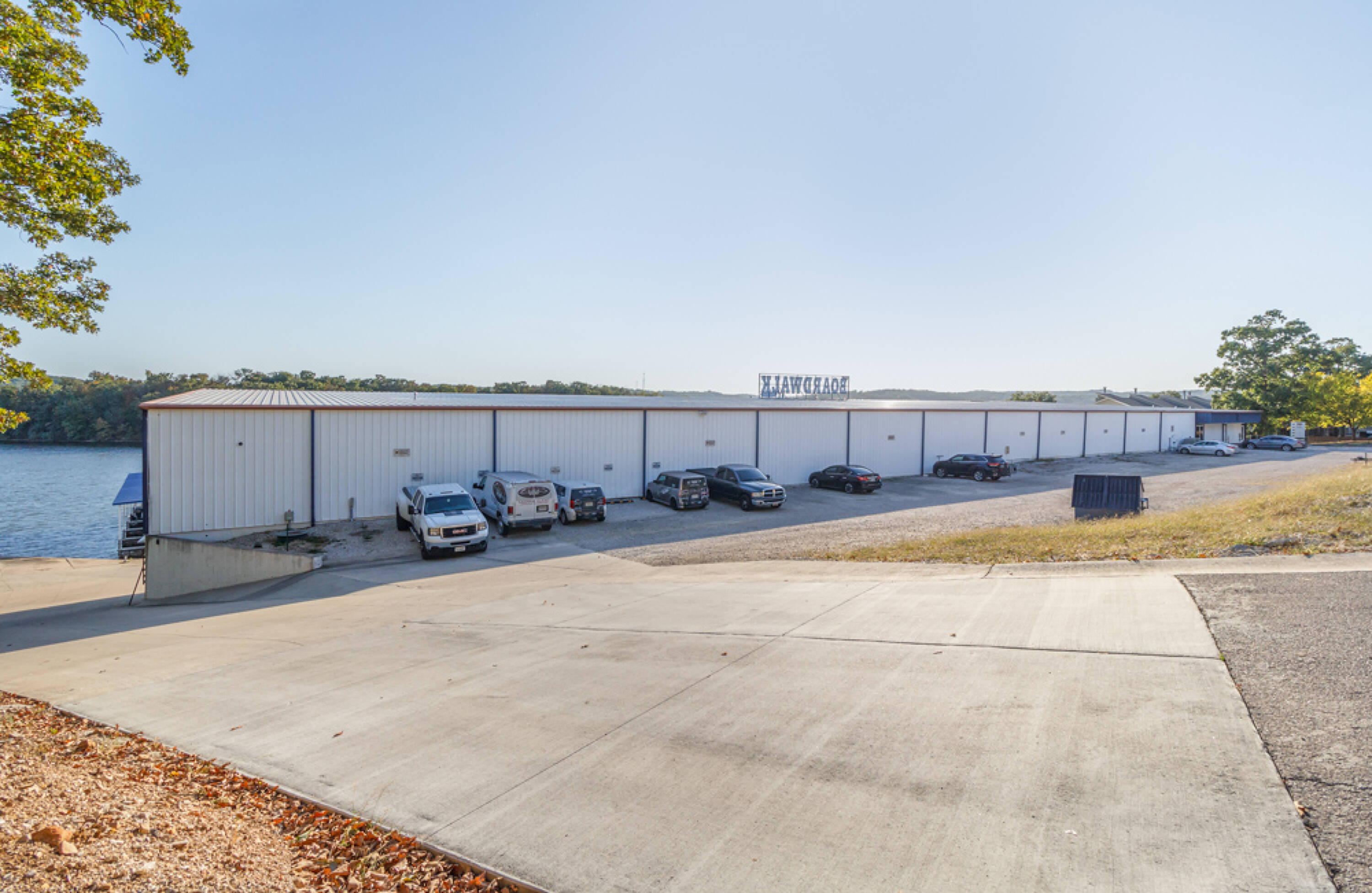The Boardwalk presents an investment opportunity at The Lake of the Ozarks. This 30,000 square foot facility, previously used for dry storage and as a marina, is located at mile marker 26, near Margaritaville Resort. The property includes an upper gravel parking lot for boat trailers and client parking, leading to an approximately 8,000 square foot office building with views overlooking Hawk Island. The office building features commercial bathrooms, a salon (previously a full condo unit), a large office, and storage rooms, with balcony access to the Boardwalk area. The showroom area has blue epoxy flooring, high ceilings, and large commercial fans, currently used for staff work and inventory storage. The building reaches nearly 43 feet in height, with zoning approval to increase up to 120 feet. The facility can store approximately 120 boats, depending on size, and includes 27 boat slips. The gas dock is currently leased to Adventure Boat Rentals, and the owner is exploring options to acquire more slips through Ameren. The gas docks were recently installed and the property features a 10,000 gallon gas tank which gravity feeds to the marina. The eastern side of the building is used as an upholstery shop, which could be converted into a service shop or other use. The building is steel framed and spray foamed. The location and structure allow for various potential uses, such as a nightclub, restaurant, swim-up bar, condos with storage, dry storage, a full marina and service shop, or a shipping warehouse on the water. The property includes 2.05 acres and is located near dining and shopping areas. Hawk Island and the neighboring property can be purchased as an assemblage opportunity.