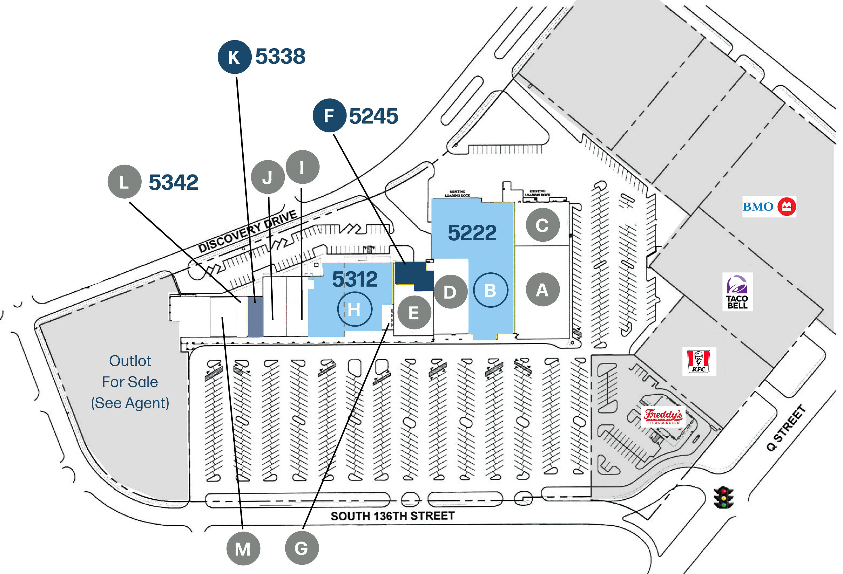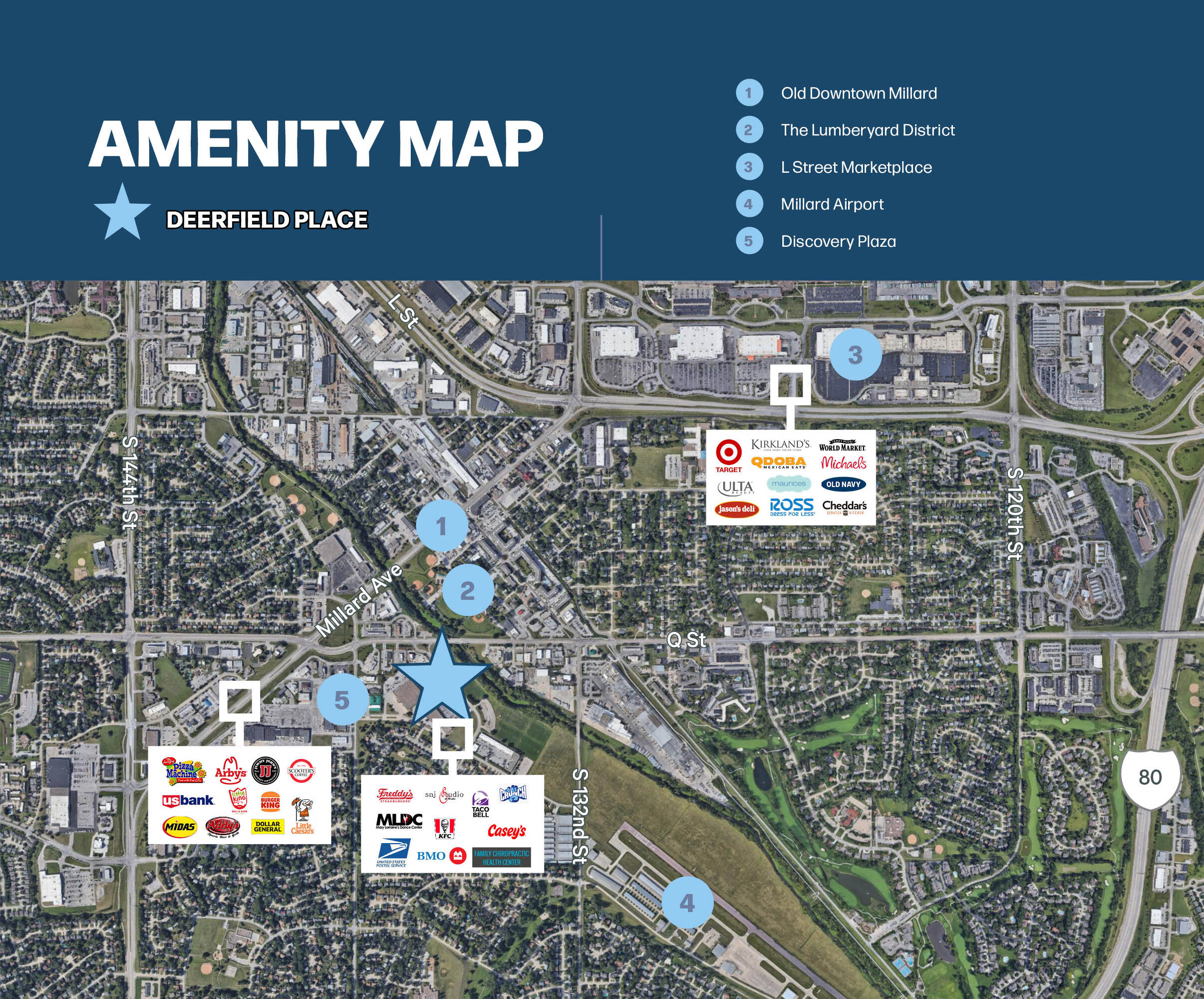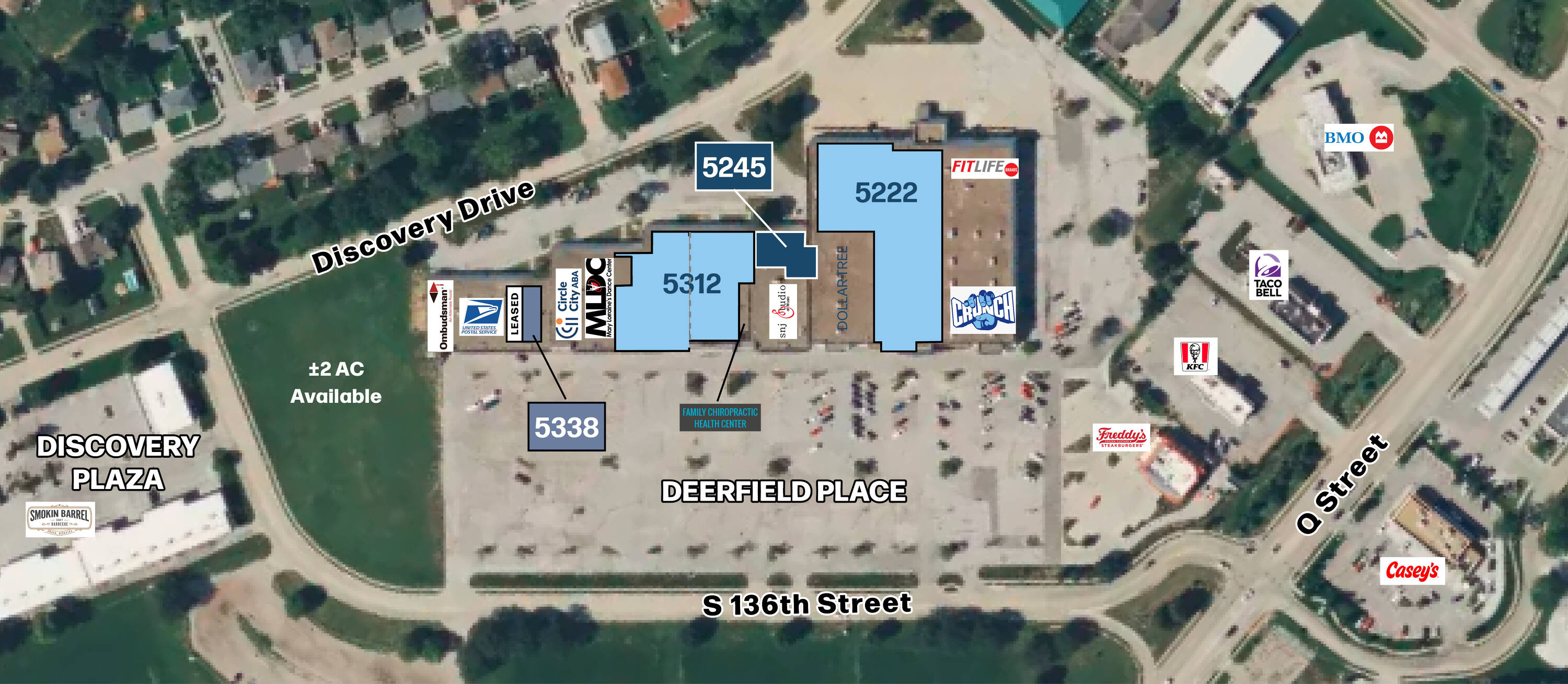 This property features: Rare junior anchor spaces available in a high‑traffic retail center.; Located in the popular Millard area of Omaha with easy access off Q Street and Discovery Drive.; Join established tenants such as USPS, Crunch Fitness, and FitLife in Deerfield Place.