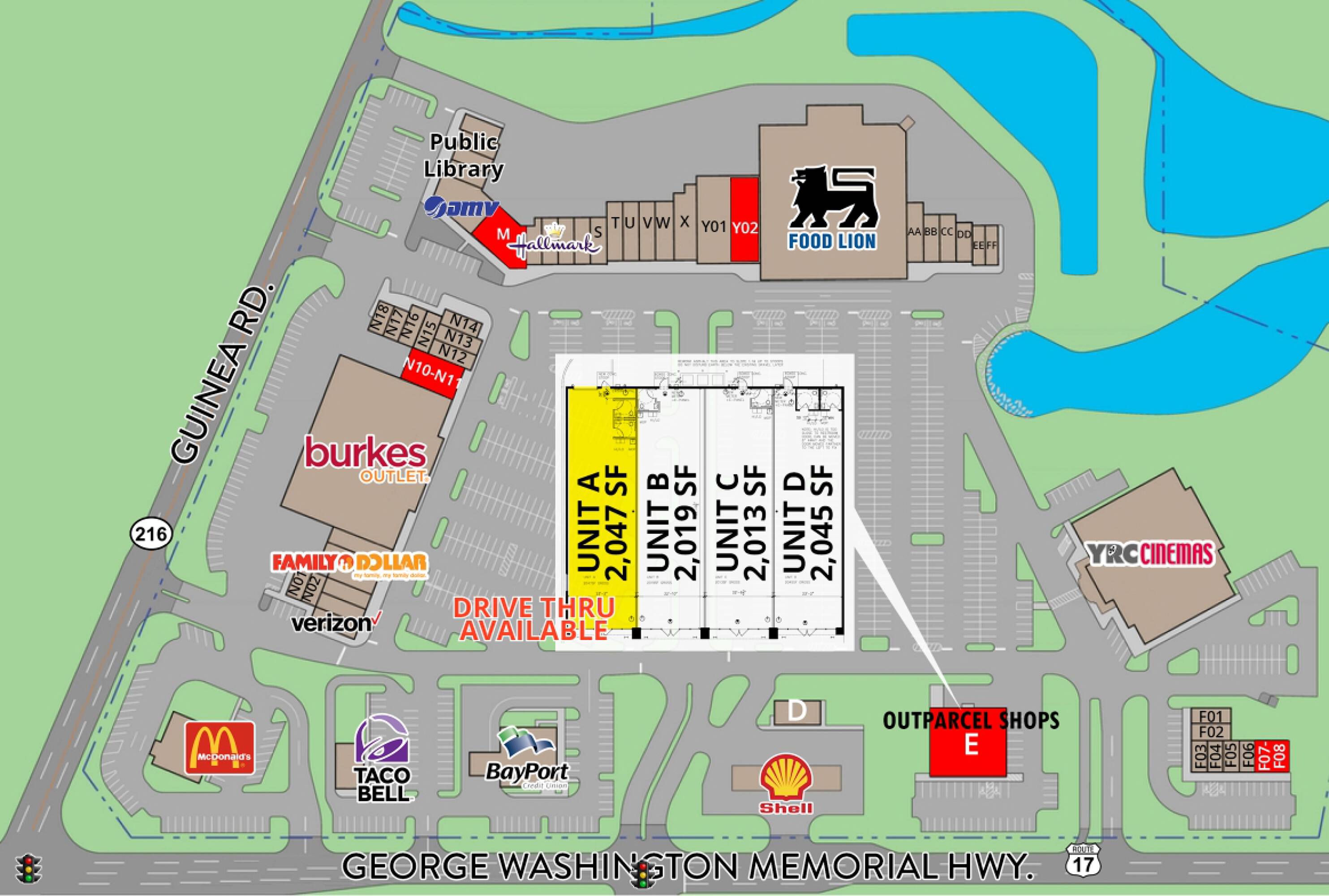 Retail spaces available in high visibility shopping center.