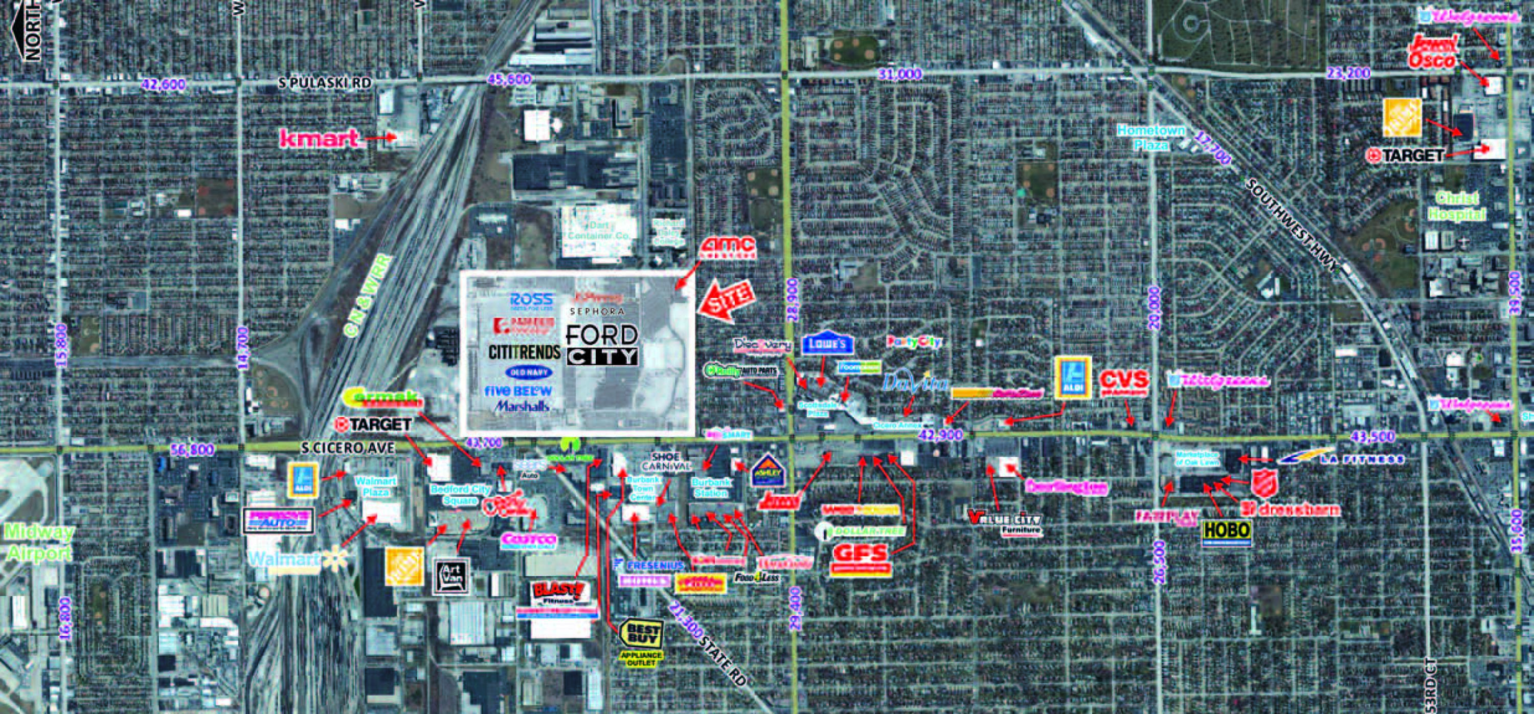 This property features: GLA: 1,258,480 SF; **Traffic Count: 45,992 VPD S. Cicero Ave.**; Availabilities: 900 SF - 11,000 SF