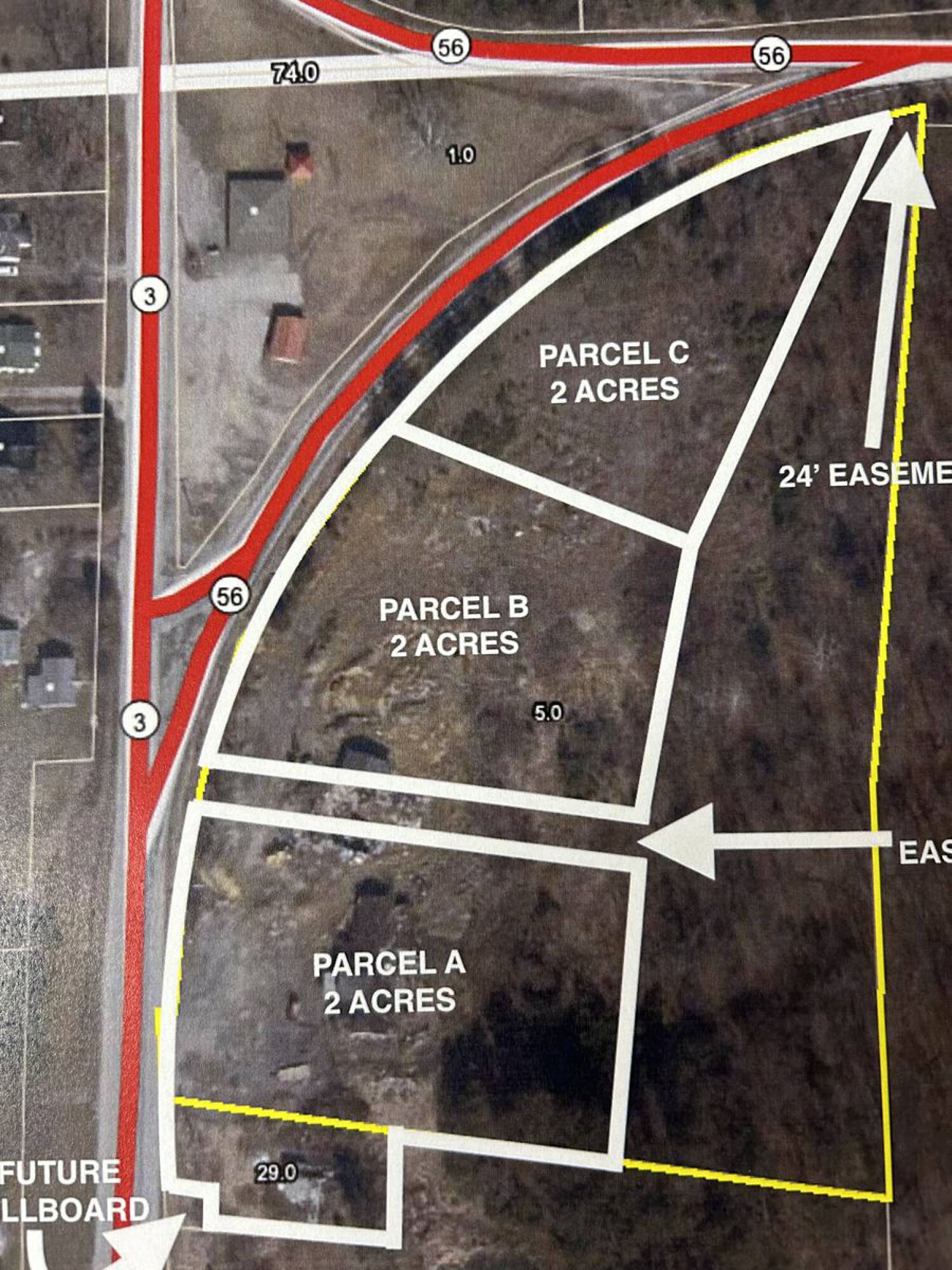 This property features: Three 2‑acre commercial lots available.; Located at the intersection of State Road 3 and 56.; Price: $350,000 per lot or $975,000 for the entire site.