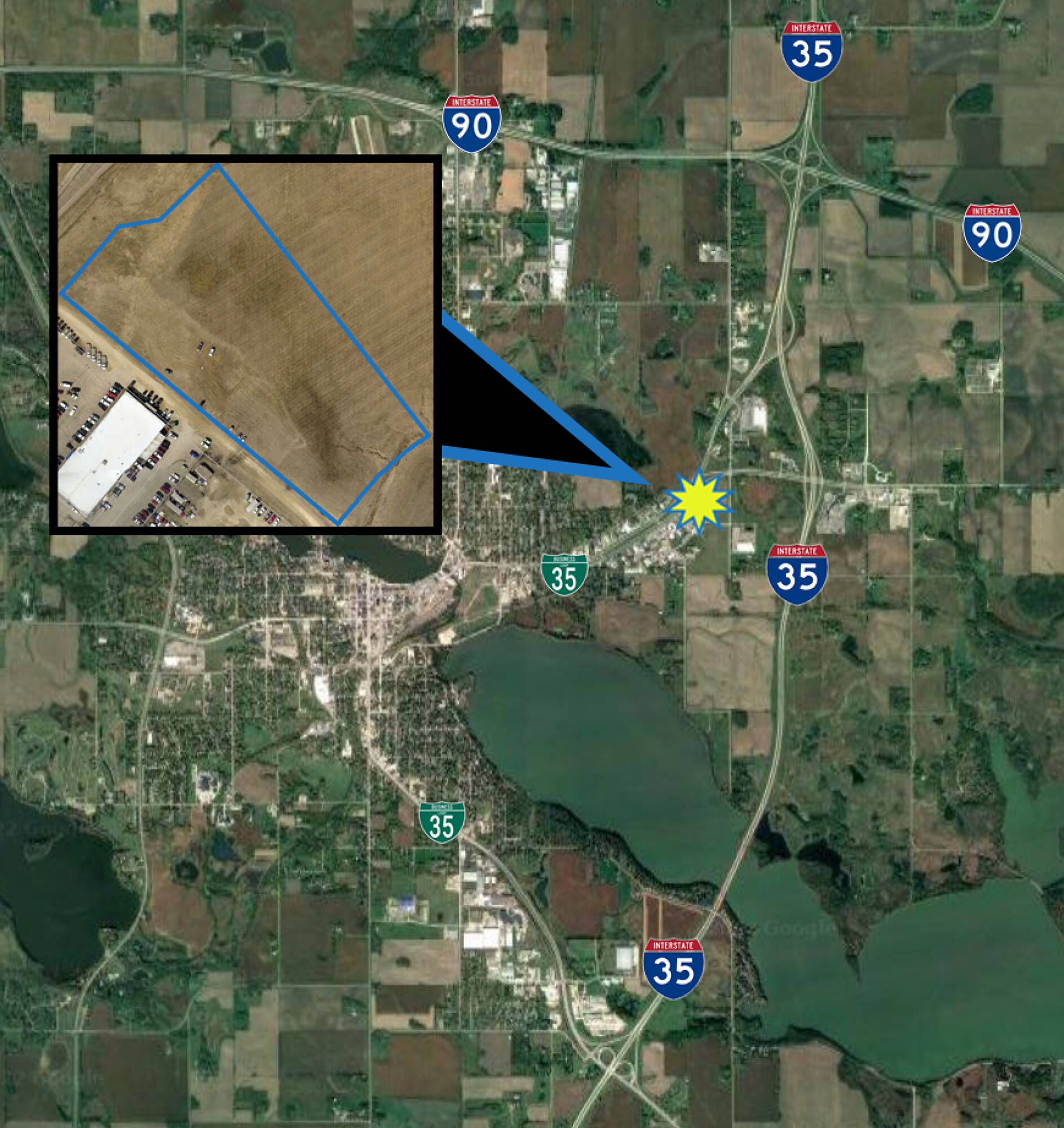 This 5-acre lot is zoned B-2 Community Business District and offers access to I-35. The property is suitable for a dealership, auto repair shop, hotel, restaurants, banks, mini storage, and other ventures. The property's PID is 344530010. Taxes for 2025 are $9,196.00.
