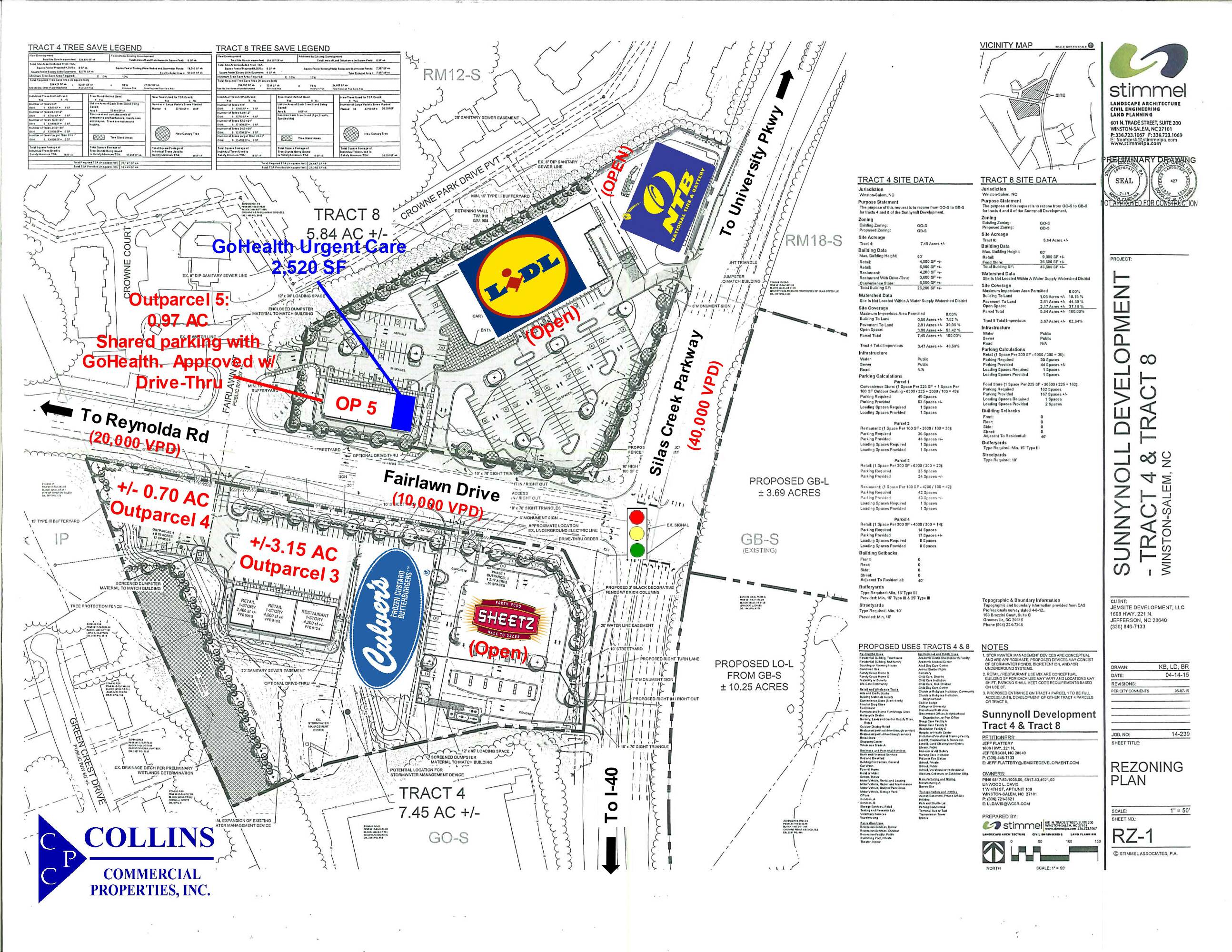 Inline retail space and outparcels are available in Winston Salem. The property is part of an infill development opportunity. It is located in close proximity to Wake Forest University, Reynolda Road, and University Parkway corridors. Situated at a signalized intersection, the property benefits from high visibility, multiple access points, and strong demographics, and is close to many of Winston Salem’s most desirable neighborhoods. Outparcel 3 offers approximately 3.26 gross acres, with approximately 1.80 usable acres, priced at $975,000. Outparcel 4 consists of approximately 0.70 acres, priced at $600,000. Outparcel 5 includes 0.97 acres, priced at $650,000. The site is near Sheetz, Lidl Grocery, Culver’s, NTB & GoHealth Urgent Care.
