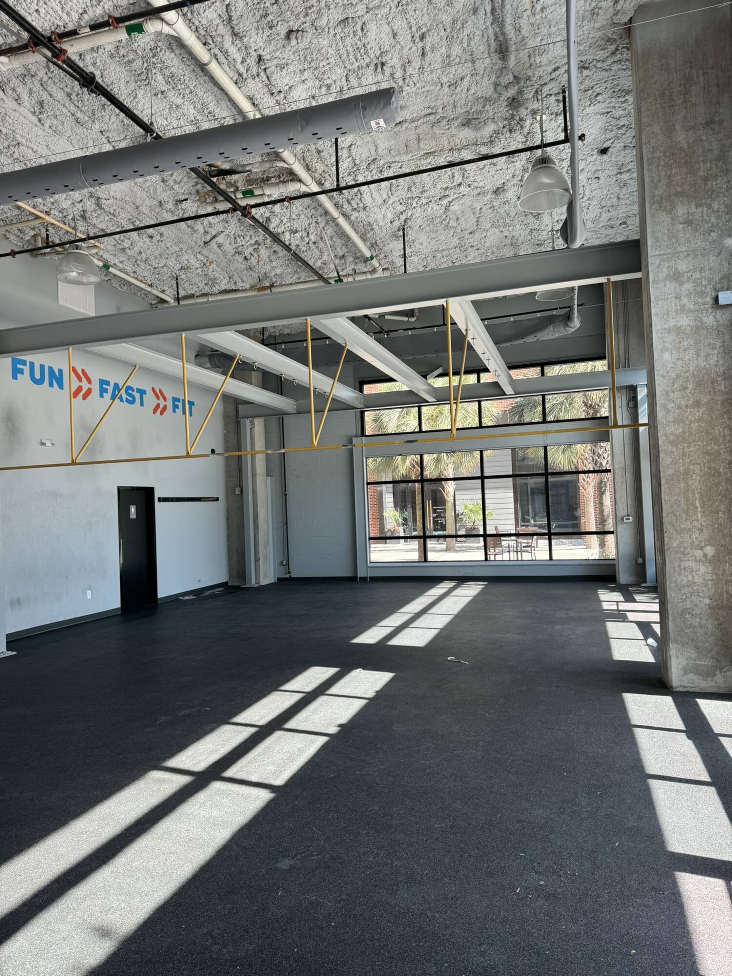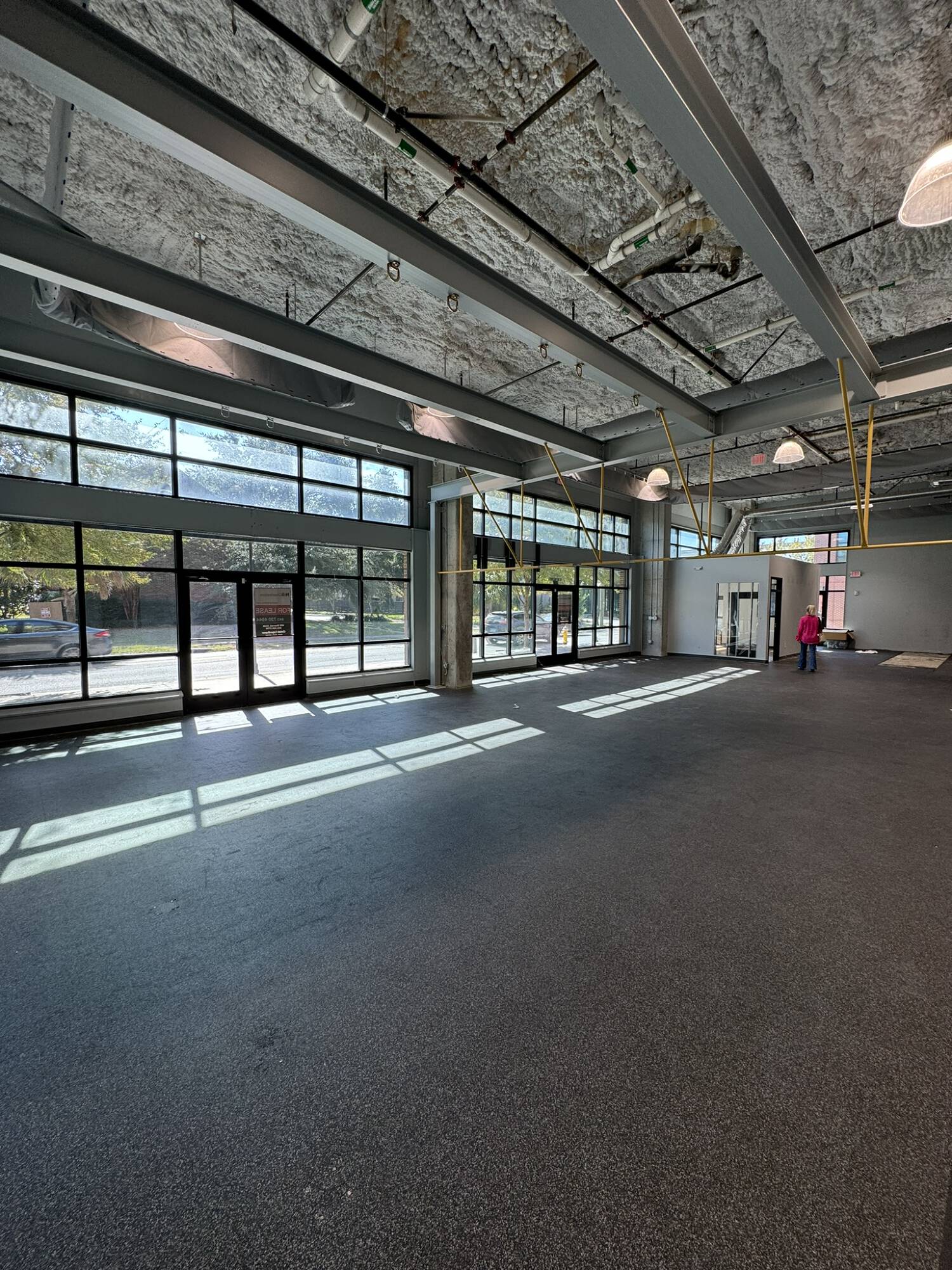 Retail space with high ceilings and free parking.