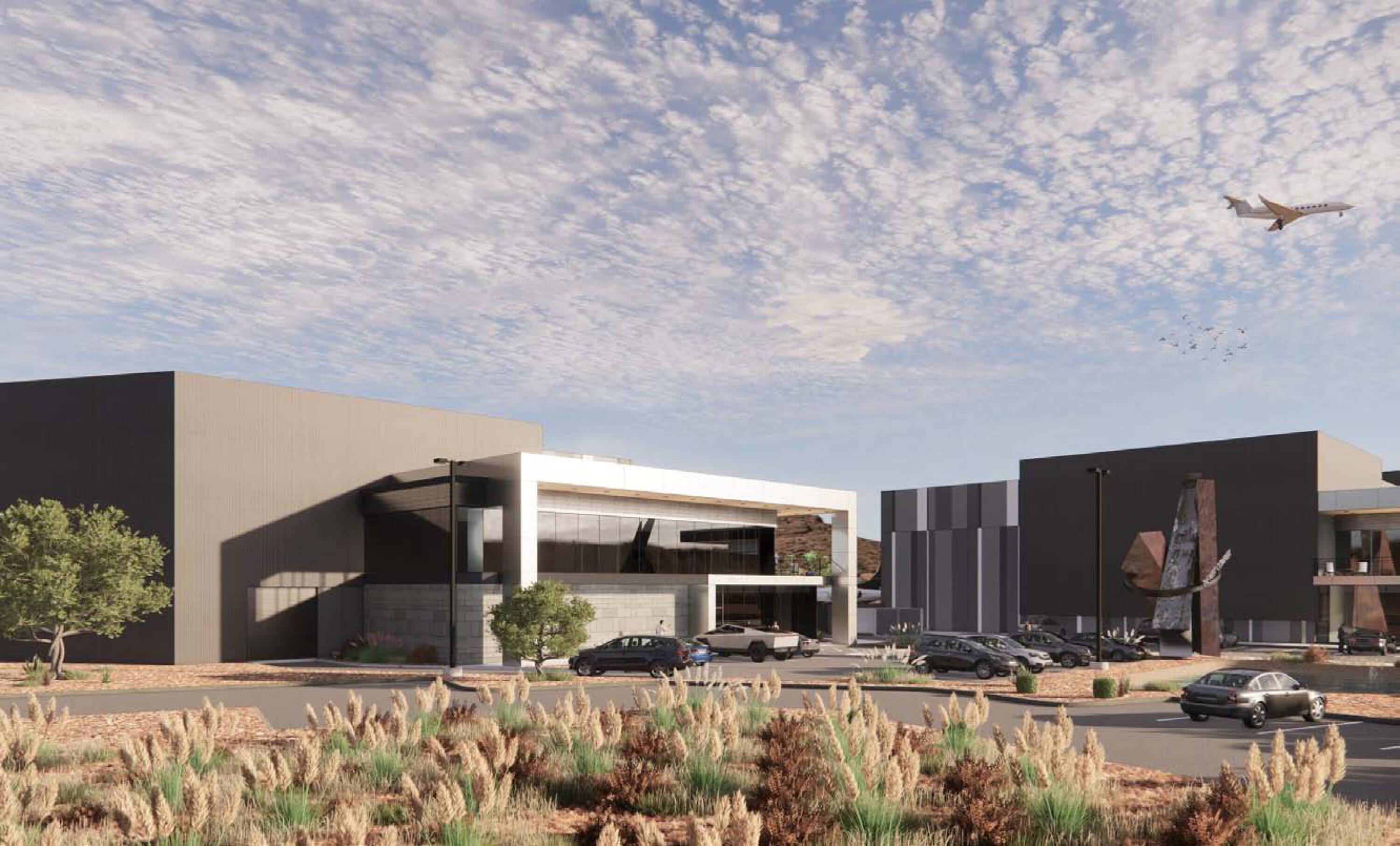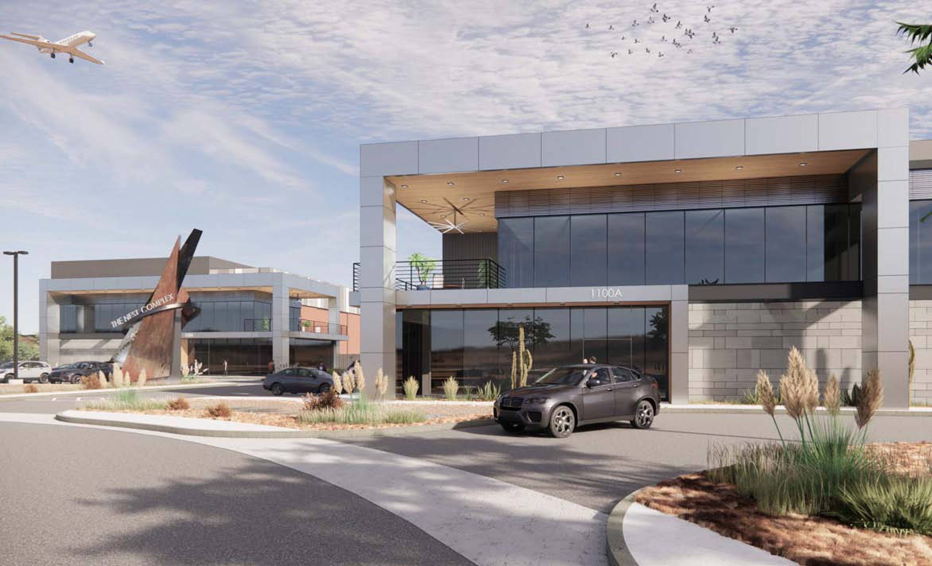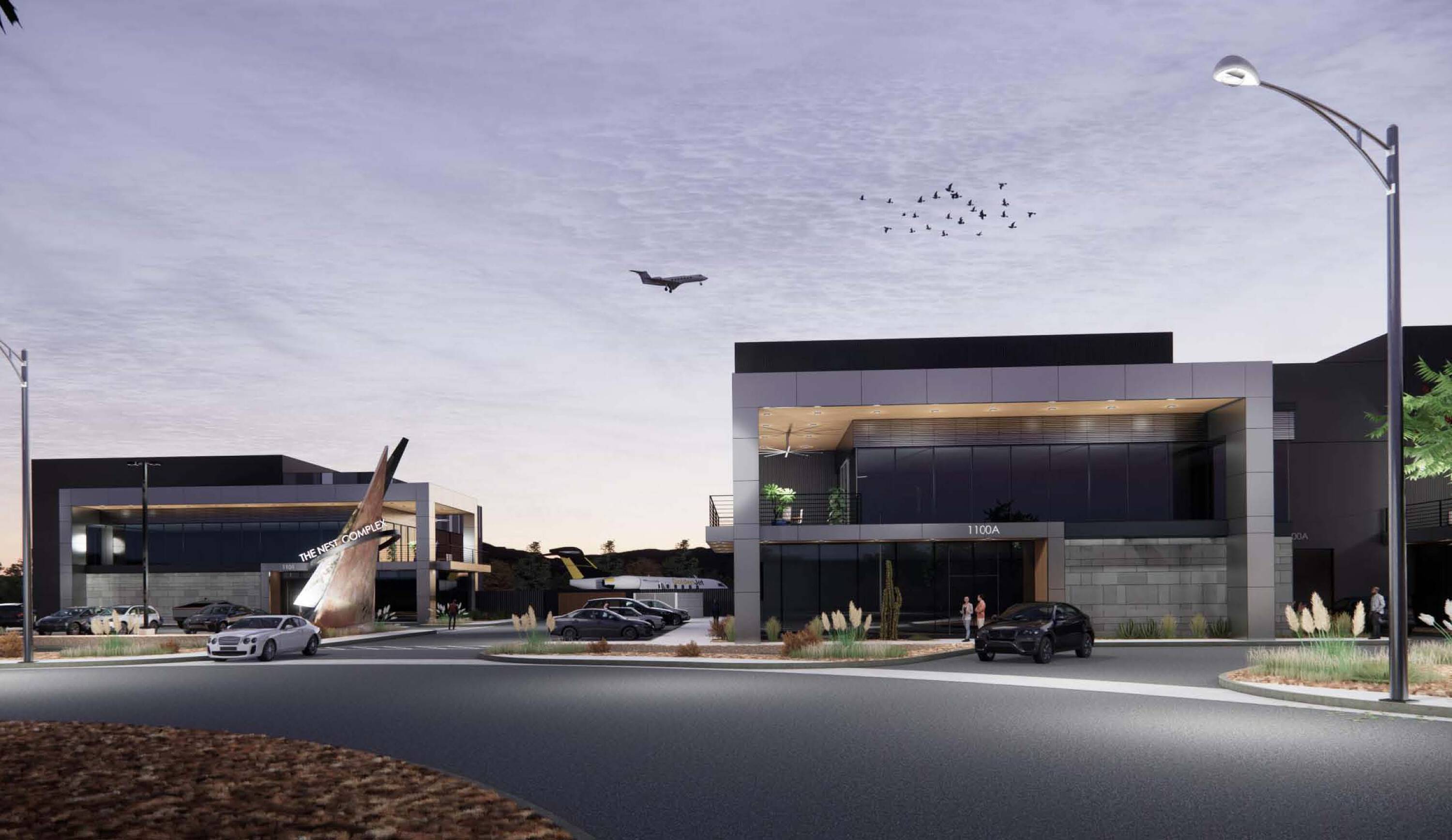 New aviation complex featuring hangar and office space for sale.