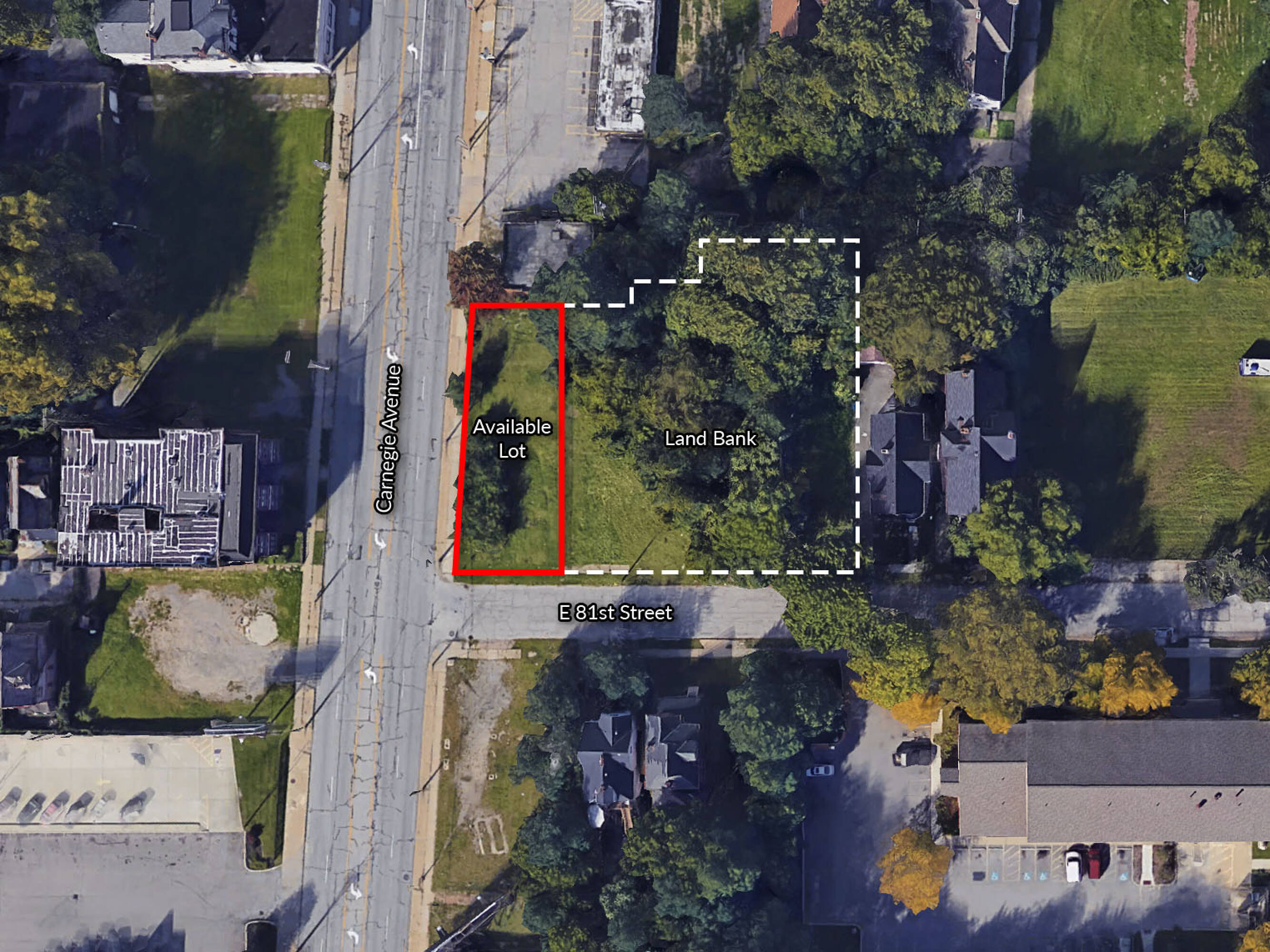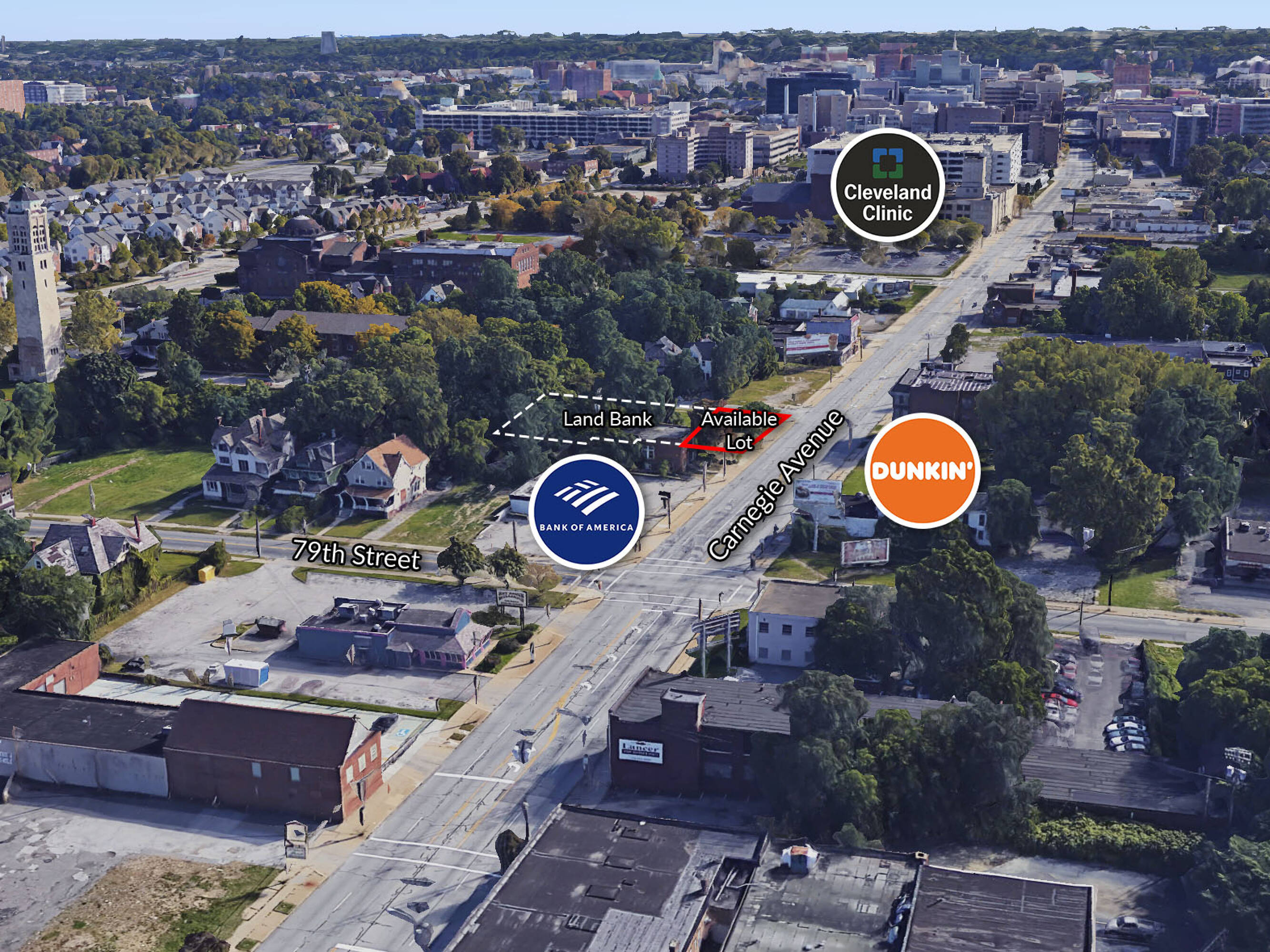 This rare corner lot is located on Carnegie Avenue and East 81st Street, situated opposite a Bank of America location and across from a Dunkin' Donuts. It represents one of the few remaining development corners adjacent to the Cleveland Clinic. The available lot is strategically positioned next to four additional contiguous City of Cleveland Land Bank lots. If acquired and combined, the total area would exceed one-half acre, including 133.5 feet of frontage on Carnegie Avenue. Additional information is available in the Midtown Inc study for the Carnegie Master Plan & Transportation Study.