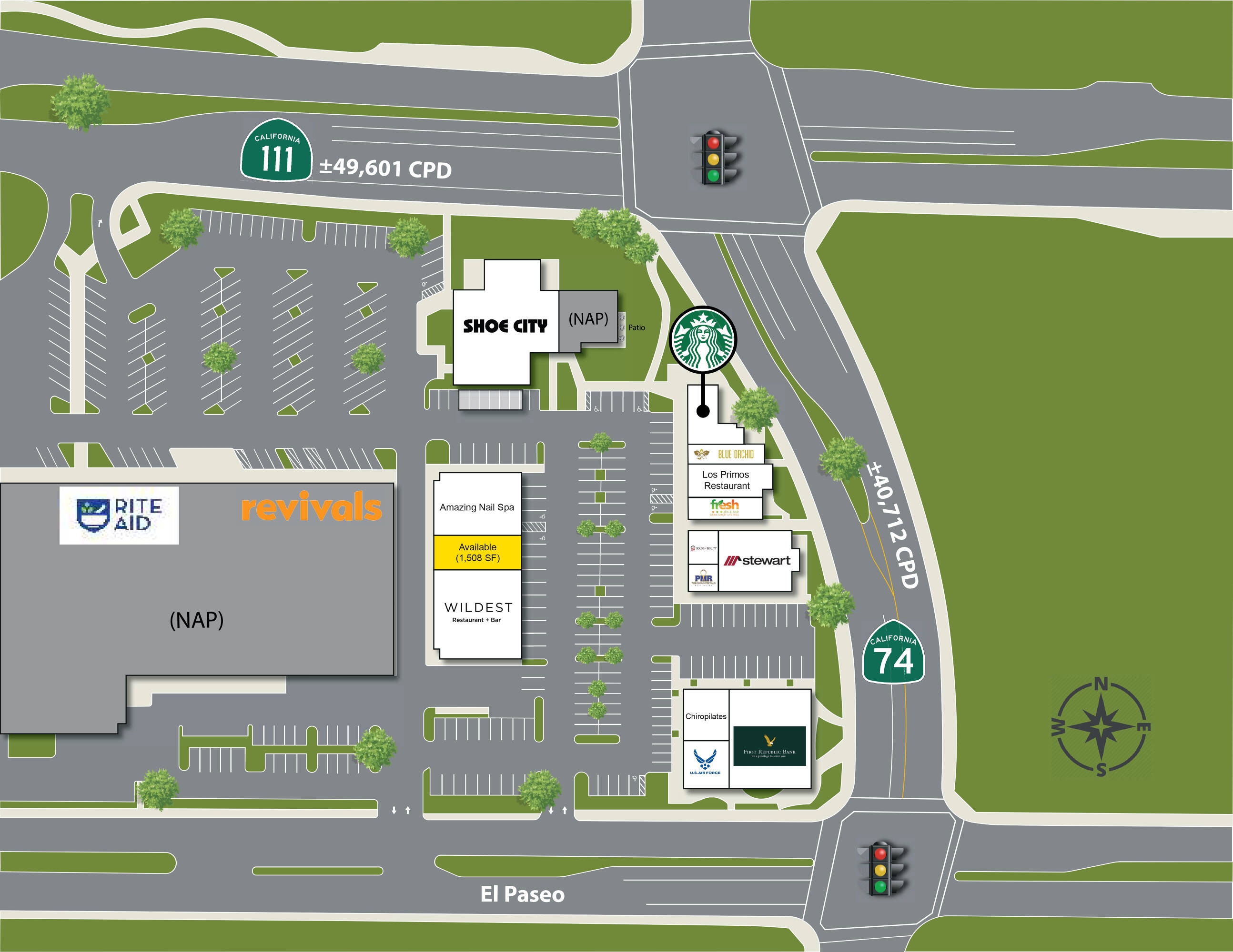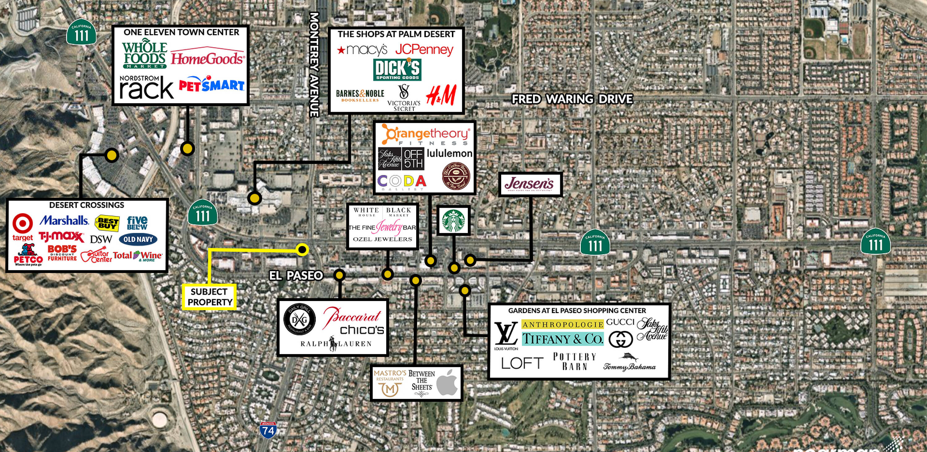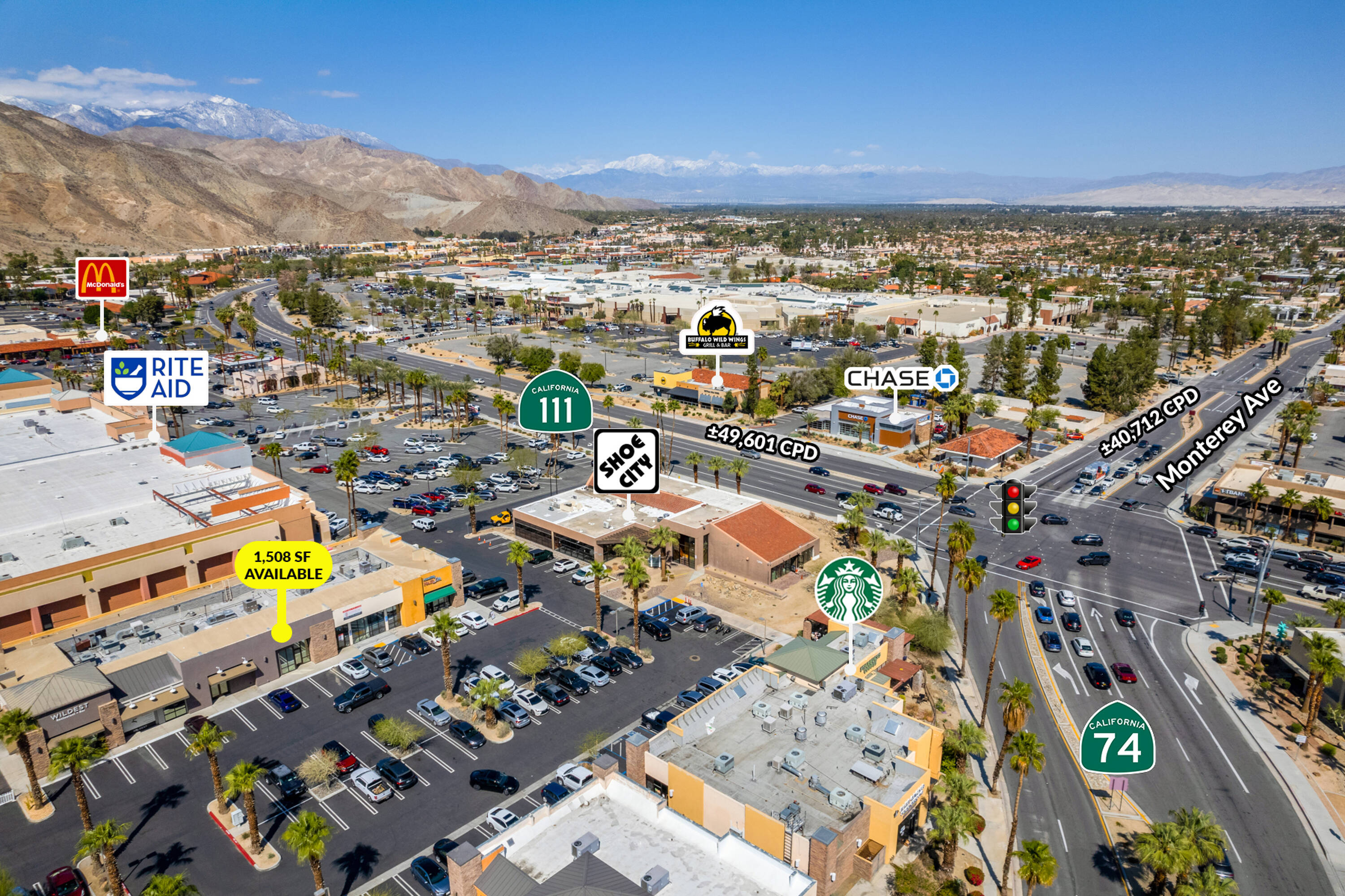 This property features: Unfettered 360‑degree visibility at the intersection of Monterey, Highway 111, Highway 74, and El Paseo with 90,313 CPD.; Located in the center of the Valley’s commercial hub.; Strong co‑tenancy including Starbucks, Juice, First Republic Bank, Wildest Restaurant, and Shoe City.