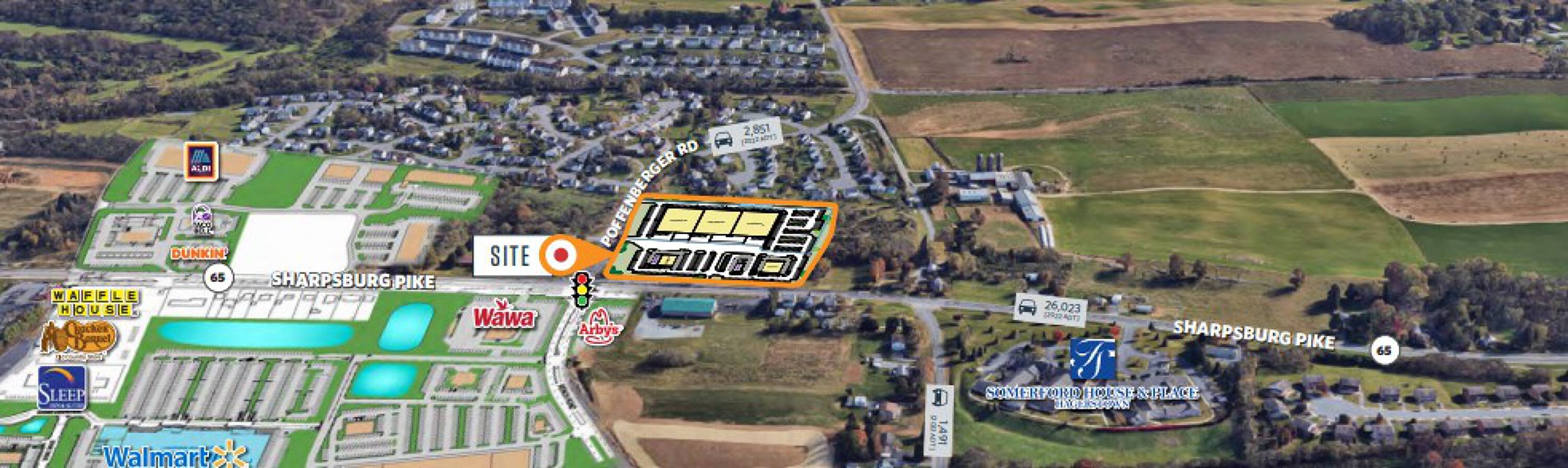 This property offers a prime pad site for lease, encompassing approximately 2 acres. It is part of a 13-acre lot that is divisible. The location is on the corner of Sharpsburg Pike, which sees 34,188 vehicles per day, and Poffenberger Road, with a traffic count of 4,131 vehicles per day. Situated less than 0.25 miles from I-70, which has a traffic volume of 65,698 vehicles per day, the site benefits from excellent visibility and convenient access. It is located near a new Walmart Supercenter. The property presents a build-to-suit or ground lease opportunity. Utilities are available on site, and traffic approvals are on hand.